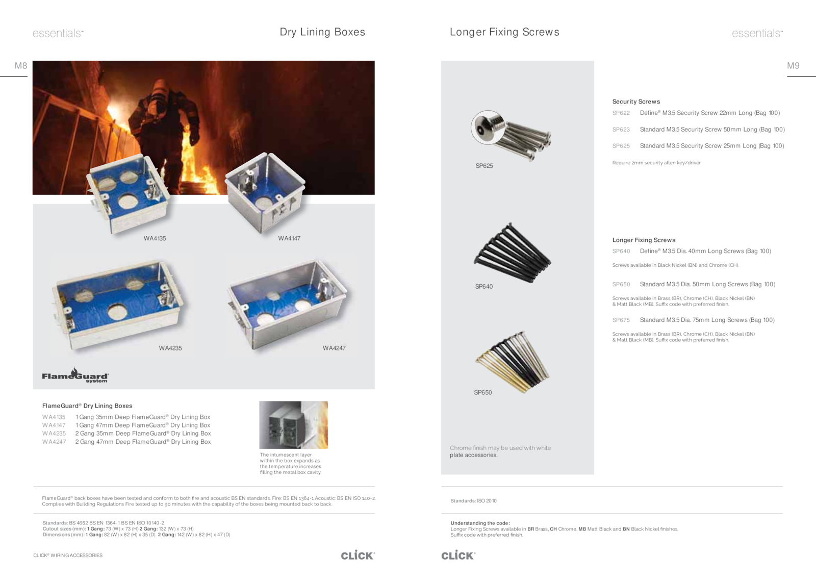 Standards: ISO 2010 .CLICK® WIRING ACCESSORIES M9 M8 Dry Lining Boxes FlameGuard® Dry Lining Boxes WA4135 Gang 35mm Deep FlameGuard® Dry Lining Box WA4147 Gang 47mm Deep FlameGuard® Dry Lining Box WA4235 Gang 35mm Deep FlameGuard® Dry Lining Box WA4247 Gang 47mm Deep FlameGuard® Dry Lining Box Standards: 4662 1364-1 ISO 10140-2 Cutout sizes (mm): Gang: (W) (H) Gang: 132 (W) (H) Dimensions (mm): Gang: (W) (H) (D) Gang: 142 (W) (H) (D) WA4135 WA4247 WA4147 WA4235 The intumescent layer within the box expands as the temperature increases Ǚʼnʼnijœħ΄ƖĮĎ΄őĎƖåʼn΄ĀŜƻ΄āåƵijƖƼ͟ FlameGuard® ΄Āåāņ΄ĀŜƻĎƊ΄ĮåƵĎ΄ĀĎĎœ΄ƖĎƊƖĎĈ΄åœĈ΄āŜœĦŜƂő΄ƖŜ΄ĀŜƖĮ΄ǙƂĎ΄åœĈ΄åāŜƞƊƖijā΄¢΄*k΄ƊƖåœĈåƂĈƊ͟΄AijƂĎ͙΄¢΄*k΄̆̈̋̉Ͳ̆΄āŜƞƊƖijā͙΄¢΄*k΄N¢t΄̆̉̅Ͳ̇͟΄ ŜőſʼnijĎƊ΄ƶijƖĮ΄ƞijʼnĈijœħ΄ĎħƞʼnåƖijŜœƊ΄AijƂĎ΄ƖĎƊƖĎĈ΄ƞſ΄ƖŜ΄̎̅΄őijœƞƖĎƊ΄ƶijƖĮ΄ƖĮĎ΄āåſåĀijʼnijƖƼ΄ŜĦ΄ƖĮĎ΄ĀŜƻĎƊ΄ĀĎijœħ΄őŜƞœƖĎĈ΄Āåāņ΄ƖŜ΄Āåāņ͟ Longer Fixing Screws SP640 Define® M3.5 Security Screw 25mm Long (Bag 100) ĎƁƞijƂĎ΄̇őő΄ƊĎāƞƂijƖƼ΄åʼnʼnĎœ΄ņĎƼͥĈƂijƵĎƂ͟ Longer Fixing Screws Understanding the code: aŜœħĎƂ΄Aijƻijœħ΄¢āƂĎƶƊ΄åƵåijʼnåĀʼnĎ΄ijœ΄BR Brass, Chrome, Matt Black and ʼnåāņ΄kijāņĎʼn΄ǙœijƊĮĎƊ͟΄ ¢ƞǗƻ΄āŜĈĎ΄ƶijƖĮ΄ſƂĎĦĎƂƂĎĈ΄ǙœijƊĮ͟ SP650 SP640 SP625 ĮƂŜőĎ΄ǙœijƊĮ΄őåƼ΄ĀĎ΄ƞƊĎĈ΄ƶijƖĮ΄ƶĮijƖĎ΄ plate accessories. 50mm Long Screws (Bag 100) ¢āƂĎƶƊ΄åƵåijʼnåĀʼnĎ΄ijœ΄ƂåƊƊ΄͚ͬͭ΄ĮƂŜőĎ΄ͬI͚ͭ΄ʼnåāņ΄kijāņĎʼn΄ͬkͭ΄ π΄iåƖƖ΄ʼnåāņ΄ͬiͭ͟΄¢ƞǗƻ΄āŜĈĎ΄ƶijƖĮ΄ſƂĎĦĎƂƂĎĈ΄ǙœijƊĮ͟ SP675 Standard M3.5 Security Screw 50mm Long (Bag 100) SP625 Standard M3. 40mm Long Screws (Bag 100) ¢āƂĎƶƊ΄åƵåijʼnåĀʼnĎ΄ijœ΄ʼnåāņ΄kijāņĎʼn΄ͬkͭ΄åœĈ΄ĮƂŜőĎ΄ͬIͭ͟ SP650 Standard M3.5 Security Screw 22mm Long (Bag 100) SP623 Standard M3.5 Dia. 75mm Long Screws (Bag 100) ¢āƂĎƶƊ΄åƵåijʼnåĀʼnĎ΄ijœ΄ƂåƊƊ΄͚ͬͭ΄ĮƂŜőĎ΄ͬI͚ͭ΄ʼnåāņ΄kijāņĎʼn΄ͬkͭ΄ π΄iåƖƖ΄ʼnåāņ΄ͬiͭ͟΄¢ƞǗƻ΄āŜĈĎ΄ƶijƖĮ΄ſƂĎĦĎƂƂĎĈ΄ǙœijƊĮ͟ Security Screws SP622 Define® M3.5 Dia.5 Dia