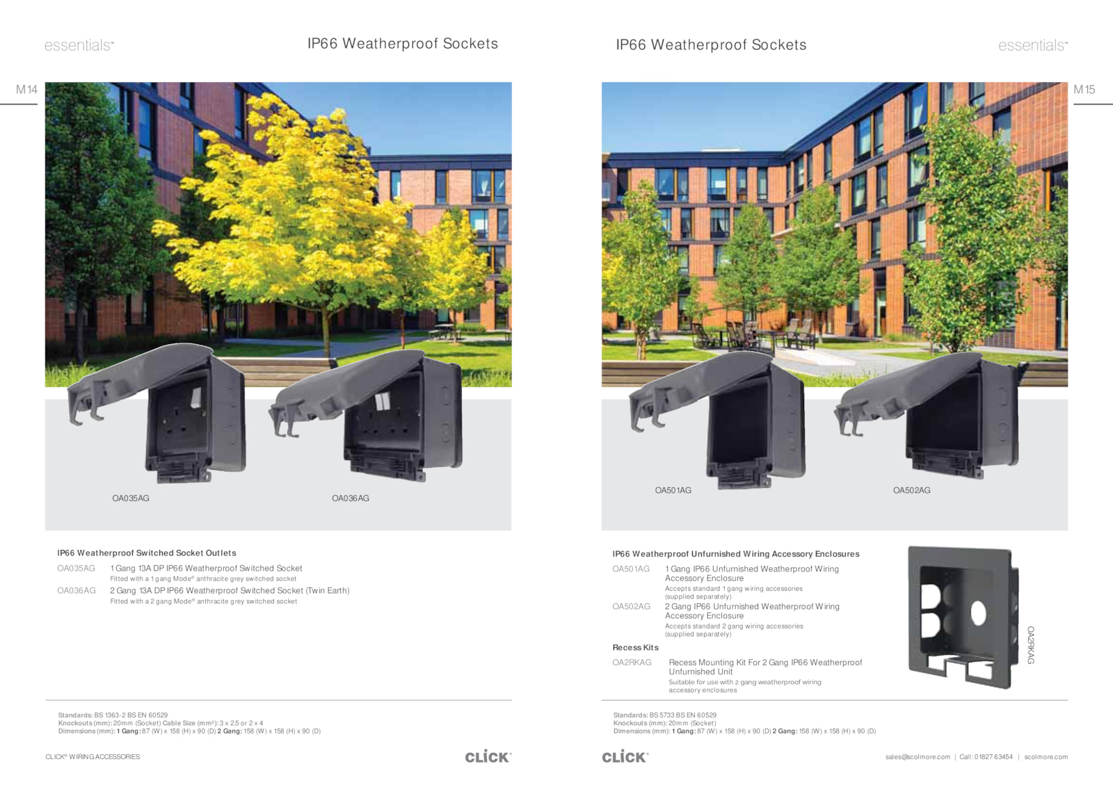 sales@scolmore.com CLICK® WIRING ACCESSORIES M15 M14 IP66 Weatherproof Unfurnished Wiring Accessory Enclosures OA501AG Gang IP66 Unfurnished Weatherproof Wiring Accessory Enclosure Accepts standard gang wiring accessories (supplied separately) OA502AG Gang IP66 Unfurnished Weatherproof Wiring Accessory Enclosure Accepts standard gang wiring accessories (supplied separately) IP66 Weatherproof Sockets IP66 Weatherproof Switched Socket Outlets OA035AG Gang 13A IP66 Weatherproof Switched Socket Fitted with gang Mode® anthracite grey switched socket OA036AG Gang 13A IP66 Weatherproof Switched Socket (Twin Earth) Fitted with gang Mode® anthracite grey switched socket Standards: 1363-2 60529 Knockouts (mm): 20mm (Socket) Cable Size (mm²): 2.5 4 Dimensions (mm): Gang: (W) 158 (H) (D) Gang: 158 (W) 158 (H) (D) OA035AG OA036AG OA501AG OA502AG IP66 Weatherproof Sockets Standards: 5733 60529 Knockouts (mm): 20mm (Socket) Dimensions (mm): Gang: (W) 158 (H) (D) Gang: 158 (W) 158 (H) (D) OA2RKAG Recess Kits OA2RKAG Recess Mounting Kit For Gang IP66 Weatherproof Unfurnished Unit ¢ƞijƖåĀʼnĎ΄ĦŜƂ΄ƞƊĎ΄ƶijƖĮ΄̇΄ħåœħ΄ƶĎåƖĮĎƂſƂŜŜĦ΄ƶijƂijœħ΄ accessory enclosures .com Call: 01827 63454 scolmore