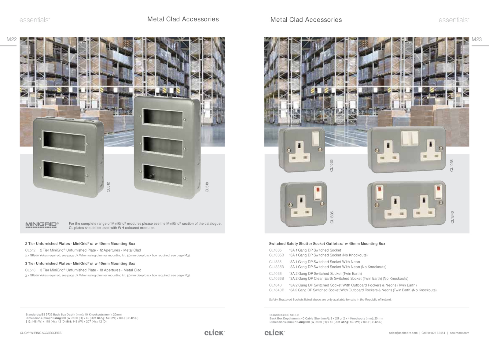 CL plates should used with coloured modules.com Call: 01827 63454 scolmore.5 Knockouts (mm): 20mm Dimensions (mm): Gang: (W) (H) (D) Gang: 140 (W) (H) (D) CL1035 CL1036 Switched Safety Shutter Socket Outlets c/w 40mm Mounting Box CL1035 13A Gang Switched Socket CL1035B 13A Gang Switched Socket (No Knockouts) CL1835 13A Gang Switched Socket With Neon CL1835B 13A Gang Switched Socket With Neon (No Knockouts) CL1036 13A Gang Switched Socket (Twin Earth) CL1036B 13A Gang Clean Earth Switched Socket (Twin Earth) (No Knockouts) CL1840 13A Gang Switched Socket With Outboard Rockers Neons (Twin Earth) CL1840B 13A Gang Switched Socket With Outboard Rockers Neons (Twin Earth) (No Knockouts) CL1835 CL1840 ¢åĦĎƖƼ΄¢ĮƞƖƖĎƂĎĈ΄¢ŜāņĎƖƊ΄ʼnijƊƖĎĈ΄åĀŜƵĎ΄åƂĎ΄ŜœʼnƼ΄åƵåijʼnåĀʼnĎ΄ĦŜƂ΄ƊåʼnĎ΄ijœ΄ƖĮĎ΄ĎſƞĀʼnijā΄ŜĦ΄NƂĎʼnåœĈ͟ Standards: 5733 Back Box Depth (mm): Knockouts (mm): 20mm Dimensions (mm): Gang: (W) (H) (D) Gang: 140 (W) (H) (D) 512: 148 (W) 148 (H) (D) 518: 148 (W) 207 (H) (D) 2 Tier Unfurnished Plates MiniGrid® c/w 40mm Mounting Box CL512 Tier MiniGrid® Unfurnished Plate Apertures Metal Clad ̇΄ƻ΄B̆̅̅΄ÔŜņĎƊ΄ƂĎƁƞijƂĎĈ͚΄ƊĎĎ΄ſåħĎ΄]̌͟΄ÎĮĎœ΄ƞƊijœħ΄ĈijőőĎƂ΄őŜƞœƖijœħ΄ņijƖ͚΄̊̅őő΄ĈĎĎſ΄Āåāņ΄ĀŜƻ΄ƂĎƁƞijƂĎĈ͚΄ƊĎĎ΄ſåħĎ΄ï̇΄ 3 Tier Unfurnished Plates MiniGrid® c/w 40mm Mounting Box CL518 Tier MiniGrid® Unfurnished Plate Apertures Metal Clad ̈΄ƻ΄B̆̅̅΄ÔŜņĎƊ΄ƂĎƁƞijƂĎĈ͚΄ƊĎĎ΄ſåħĎ΄]̌͟΄ÎĮĎœ΄ƞƊijœħ΄ĈijőőĎƂ΄őŜƞœƖijœħ΄ņijƖ͚΄̊̅őő΄ĈĎĎſ΄Āåāņ΄ĀŜƻ΄ƂĎƁƞijƂĎĈ͚΄ƊĎĎ΄ſåħĎ΄ï̇ For the complete range MiniGrid® modules please see the MiniGrid® section the catalogue.sales@scolmore. CL518 CL512 Metal Clad Accessories .com CLICK® WIRING ACCESSORIES M23 M22 Metal Clad Accessories Standards: 1363-2 Back Box Depth (mm): Cable Size (mm²): 2