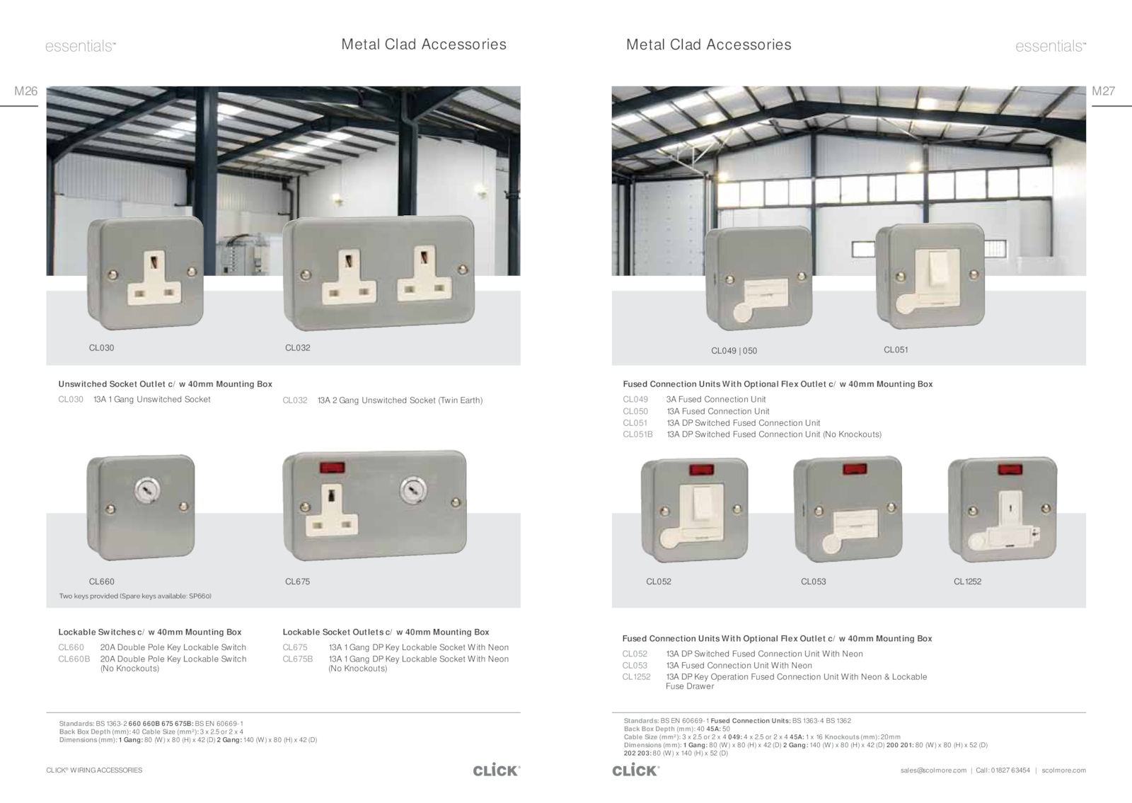 com Call: 01827 63454 scolmore.sales@scolmore.5 45A: Knockouts (mm): 20mm Dimensions (mm): Gang: (W) (H) (D) Gang: 140 (W) (H) (D) 200 201: (W) (H) (D) 202 203: (W) 140 (H) (D) CL052 CL053 Fused Connection Units With Optional Flex Outlet c/w 40mm Mounting Box CL049 Fused Connection Unit CL050 13A Fused Connection Unit CL051 13A Switched Fused Connection Unit CL051B 13A Switched Fused Connection Unit (No Knockouts) CL1252 .5 4 Dimensions (mm): Gang: (W) (H) (D) Gang: 140 (W) (H) (D) Unswitched Socket Outlet c/w 40mm Mounting Box CL030 13A Gang Unswitched Socket Metal Clad Accessories Metal Clad Accessories CL030 CL032 Lockable Switches c/w 40mm Mounting Box CL660 20A Double Pole Key Lockable Switch CL660B 20A Double Pole Key Lockable Switch (No Knockouts) CL675 CL660 Lockable Socket Outlets c/w 40mm Mounting Box CL675 13A Gang Key Lockable Socket With Neon CL675B 13A Gang Key Lockable Socket With Neon (No Knockouts) ¯ƶŜ΄ņĎƼƊ΄ſƂŜƵijĈĎĈ΄ͬ¢ſåƂĎ΄ņĎƼƊ΄åƵåijʼnåĀʼnĎ͙΄¢̋̋̅ͭ CL032 13A Gang Unswitched Socket (Twin Earth) Fused Connection Units With Optional Flex Outlet c/w 40mm Mounting Box CL052 13A Switched Fused Connection Unit With Neon CL053 13A Fused Connection Unit With Neon CL1252 13A Key Operation Fused Connection Unit With Neon Lockable Fuse Drawer CL049 050 CL051 Standards: 60669-1 Fused Connection Units: 1363-4 1362 Back Box Depth (mm): 45A: 50 Cable Size (mm²): 2.com CLICK® WIRING ACCESSORIES M27 M26 Standards: 1363-2 660 660B 675 675B: 60669-1 Back Box Depth (mm): Cable Size (mm²): 2.5 049: 2