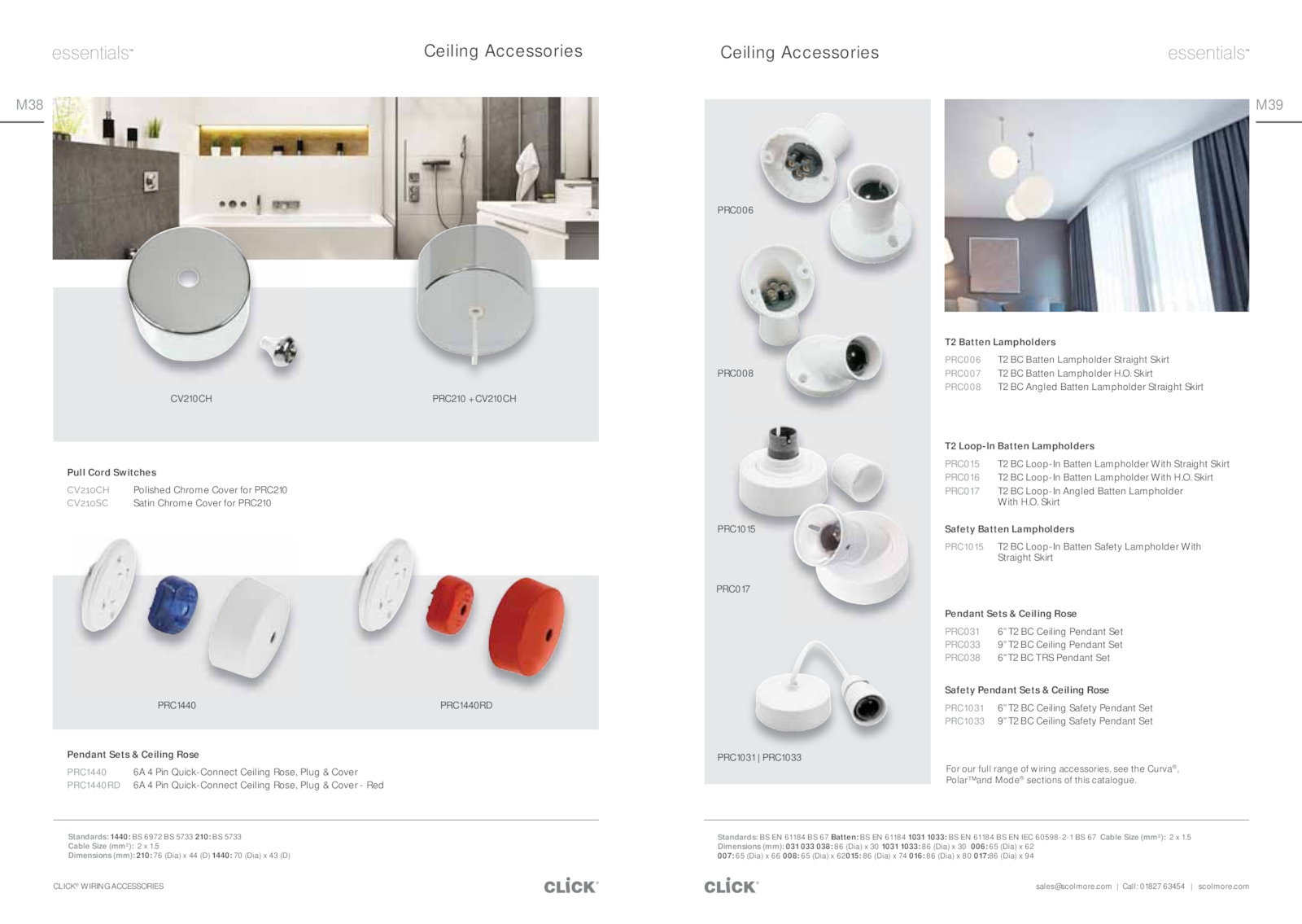 Standards: 1440: 6972 5733 210: 5733 Cable Size (mm²): 1.com Call: 01827 63454 scolmore.O.sales@scolmore. Skirt PRC008 Angled Batten Lampholder Straight Skirt Safety Pendant Sets Ceiling Rose PRC1031 Ceiling Safety Pendant Set PRC1033 Ceiling Safety Pendant Set Safety Batten Lampholders PRC1015 Loop-In Batten Safety Lampholder With Straight Skirt .5 Dimensions (mm): 031 033 038: (Dia) 1031 1033: (Dia) 006: (Dia) 62 007: (Dia) 008: (Dia) 62015: (Dia) 016: (Dia) 017:86 (Dia) 94 For our full range wiring accessories, see the Curva® , Polar™ and Mode® sections this catalogue. Skirt PRC017 Loop-In Angled Batten Lampholder With H.5 Dimensions (mm): 210: (Dia) (D) 1440: (Dia) (D) CV210CH PRC210 CV210CH PRC017 PRC006 PRC008 PRC1015 PRC1031 PRC1033 C1015 C008 6 Pendant Sets Ceiling Rose PRC1440 Pin Quick-Connect Ceiling Rose, Plug Cover PRC1440RD Pin Quick-Connect Ceiling Rose, Plug Cover Red PRC1440 PRC1440RD T2 Batten Lampholders PRC006 Batten Lampholder Straight Skirt PRC007 Batten Lampholder H. Skirt Pendant Sets Ceiling Rose PRC031 Ceiling Pendant Set PRC033 Ceiling Pendant Set PRC038 TRS Pendant Set Ceiling Accessories Pull Cord Switches Í̇̆̅I Polished Chrome Cover for PRC210 Í̇̆̅¢ Satin Chrome Cover for PRC210 Standards: 61184 Batten: 61184 1031 1033: 61184 IEC 60598-2-1 Cable Size (mm²): 1.O.O.com CLICK® WIRING ACCESSORIES M39 M38 Ceiling Accessories T2 Loop-In Batten Lampholders PRC015 Loop-In Batten Lampholder With Straight Skirt PRC016 Loop-In Batten Lampholder With H
