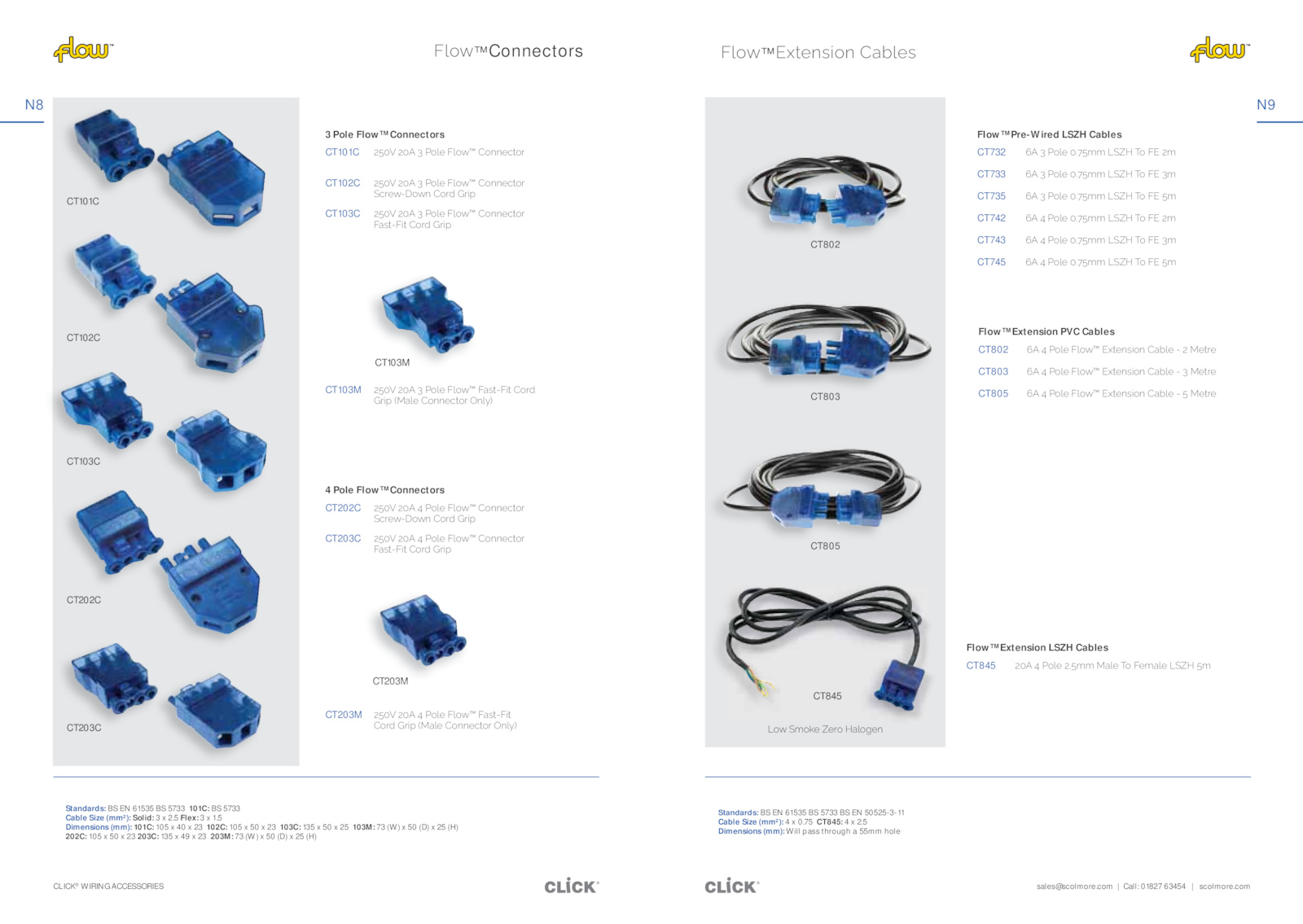 5 Dimensions (mm): 101C: 105 102C: 105 103C: 135 103M: (W) (D) (H) 202C: 105 203C: 135 203M: (W) (D) (H) CT802 CT803 CT805 aŜƶ΄¢őŜņĎ΄ÞĎƂŜ΄IåʼnŜħĎœ CT101C CT202C CT102C CT103C CT203C Flow™ Extension LSZH Cables CT845 ̇̅΄̉΄ŜʼnĎ΄̇̊͟őő΄iåʼnĎ΄¯Ŝ΄AĎőåʼnĎ΄a¢ÞI΄̊ő 4 Pole Flow™ Connectors CT202C ̇̊̅Í΄̇̅΄̉΄ŜʼnĎ΄AʼnŜƶυ΄ŜœœĎāƖŜƂ΄ ¢āƂĎƶͲ$Ŝƶœ΄ŜƂĈ΄BƂijſ CT203C ̇̊̅Í΄̇̅΄̉΄ŜʼnĎ΄AʼnŜƶυ΄ŜœœĎāƖŜƂ΄ AåƊƖͲAijƖ΄ŜƂĈ΄BƂijſ CT203M ̇̊̅Í΄̇̅΄̉΄ŜʼnĎ΄AʼnŜƶυ΄AåƊƖͲAijƖ΄ ŜƂĈ΄BƂijſ΄ͬiåʼnĎ΄ŜœœĎāƖŜƂ΄tœʼnƼͭ CT203M CT103M CT845 .5 Dimensions (mm): Will pass through 55mm hole Standards: 61535 5733 101C: 5733 Cable Size (mm²): Solid: 2.com Call: 01827 63454 scolmore.sales@scolmore.75 CT845: 2.5 Flex: 1.com CLICK® WIRING ACCESSORIES N9 N8 AʼnŜƶ™΄*ƻƖĎœƊijŜœ΄åĀʼnĎƊ Flow™ Pre-Wired LSZH Cables CT732 ̋΄̈΄ŜʼnĎ΄̅̌̊͟őő΄a¢ÞI΄¯Ŝ΄A*΄̇ő CT733 ̋΄̈΄ŜʼnĎ΄̅̌̊͟őő΄a¢ÞI΄¯Ŝ΄A*΄̈ő CT735 ̋΄̈΄ŜʼnĎ΄̅̌̊͟őő΄a¢ÞI΄¯Ŝ΄A*΄̊ő CT742 ̋΄̉΄ŜʼnĎ΄̅̌̊͟őő΄a¢ÞI΄¯Ŝ΄A*΄̇ő CT743 ̋΄̉΄ŜʼnĎ΄̅̌̊͟őő΄a¢ÞI΄¯Ŝ΄A*΄̈ő CT745 ̋΄̉΄ŜʼnĎ΄̅̌̊͟őő΄a¢ÞI΄¯Ŝ΄A*΄̊ő Flow™ Extension PVC Cables CT802 ̋΄̉΄ŜʼnĎ΄AʼnŜƶυ΄*ƻƖĎœƊijŜœ΄åĀʼnĎ΄Ͳ΄̇΄iĎƖƂĎ CT803 ̋΄̉΄ŜʼnĎ΄AʼnŜƶυ΄*ƻƖĎœƊijŜœ΄åĀʼnĎ΄Ͳ΄̈΄iĎƖƂĎ CT805 ̋΄̉΄ŜʼnĎ΄AʼnŜƶυ΄*ƻƖĎœƊijŜœ΄åĀʼnĎ΄Ͳ΄̊΄iĎƖƂĎ AʼnŜƶ™ Connectors 3 Pole Flow™ Connectors CT101C ̇̊̅Í΄̇̅΄̈΄ŜʼnĎ΄AʼnŜƶυ΄ŜœœĎāƖŜƂ CT102C ̇̊̅Í΄̇̅΄̈΄ŜʼnĎ΄AʼnŜƶυ΄ŜœœĎāƖŜƂ΄ ¢āƂĎƶͲ$Ŝƶœ΄ŜƂĈ΄BƂijſ CT103C ̇̊̅Í΄̇̅΄̈΄ŜʼnĎ΄AʼnŜƶυ΄ŜœœĎāƖŜƂ΄ AåƊƖͲAijƖ΄ŜƂĈ΄BƂijſ CT103M ̇̊̅Í΄̇̅΄̈΄ŜʼnĎ΄AʼnŜƶυ΄AåƊƖͲAijƖ΄ŜƂĈ΄ BƂijſ΄ͬiåʼnĎ΄ŜœœĎāƖŜƂ΄tœʼnƼͭ Standards: 61535 5733 50525-3-11 Cable Size (mm²): 0
