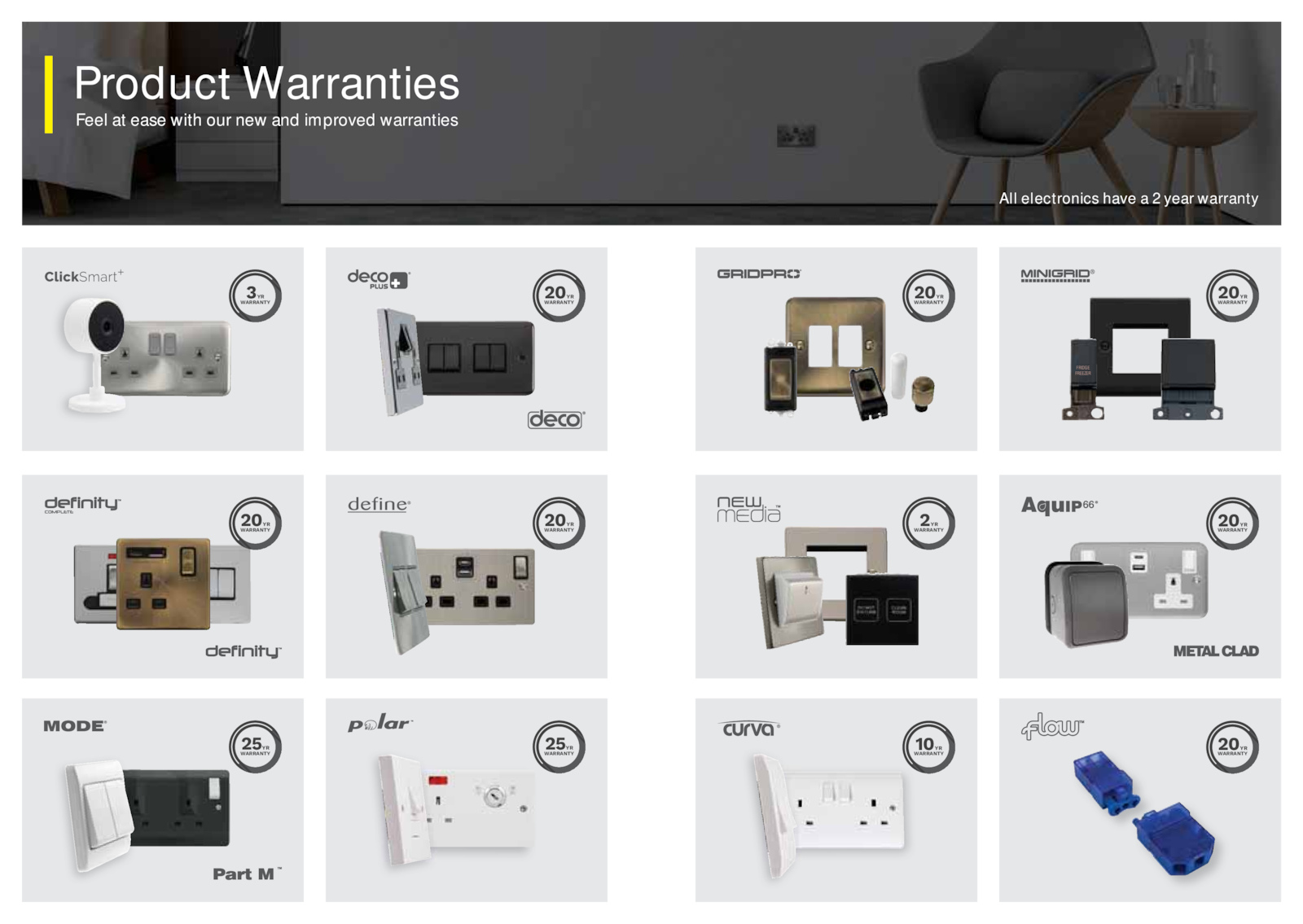 Product Warranties Feel ease with our new and improved warranties 25YR WARRANTY 20YR WARRANTY 2YR WARRANTY 20YR WARRANTY 25YR WARRANTY FRIDGE FREEZER 20YR WARRANTY 10YR WARRANTY 20YR WARRANTY 3YR WARRANTY 20YR WARRANTY 20YR WARRANTY 20YR WARRANTY All electronics have year warranty