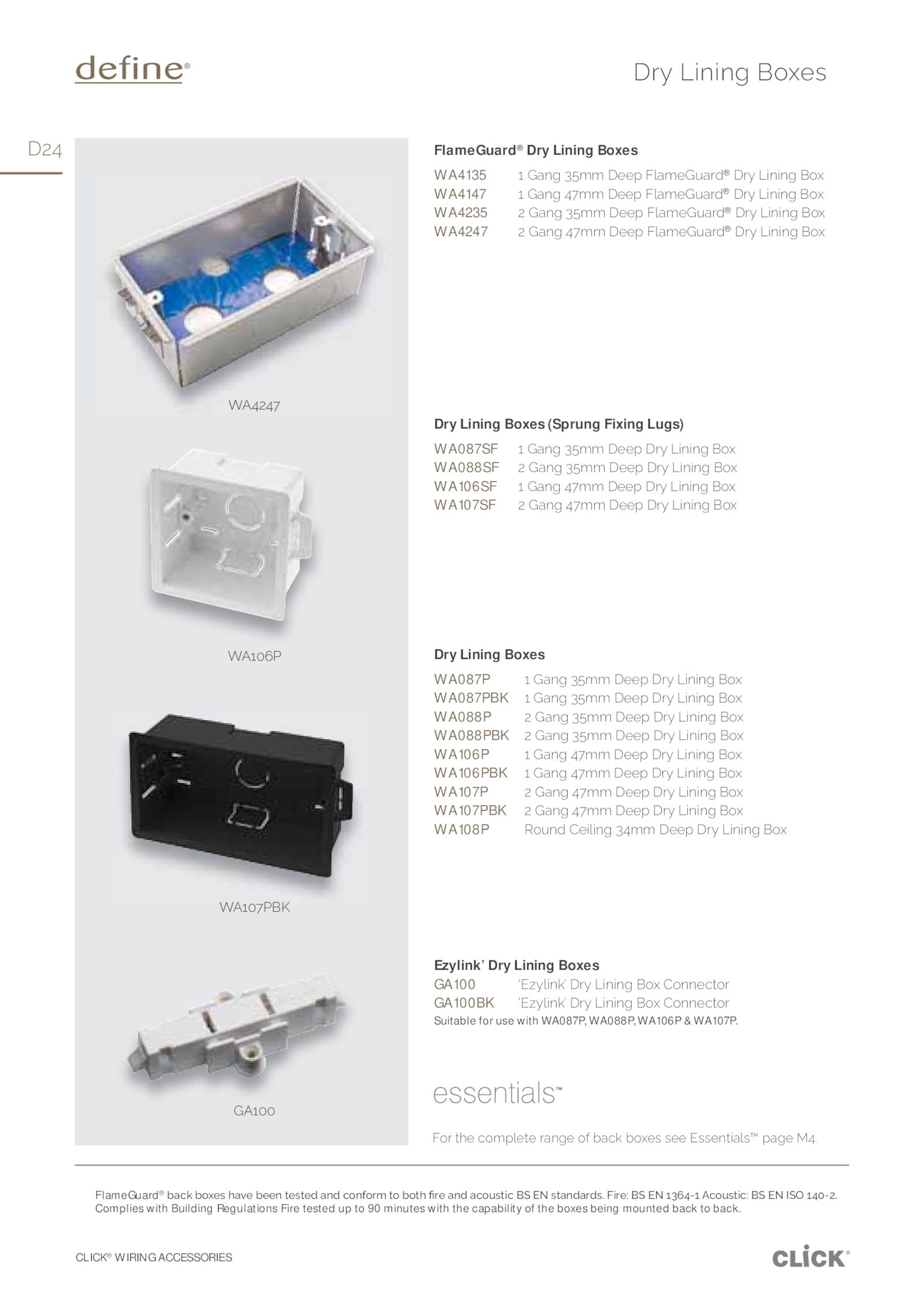 Dry Lining Boxes (Sprung Fixing Lugs) WA087SF ̆΄Båœħ΄̈̊őő΄$ĎĎſ΄$ƂƼ΄aijœijœħ΄Ŝƻ WA088SF ̇΄Båœħ΄̈̊őő΄$ĎĎſ΄$ƂƼ΄aijœijœħ΄Ŝƻ WA106SF ̆΄Båœħ΄̉̌őő΄$ĎĎſ΄$ƂƼ΄aijœijœħ΄Ŝƻ WA107SF ̇΄Båœħ΄̉̌őő΄$ĎĎſ΄$ƂƼ΄aijœijœħ΄Ŝƻ .CLICK® WIRING ACCESSORIES $̇̉ $ƂƼ΄aijœijœħ΄ŜƻĎƊ FlameGuard® Dry Lining Boxes WA4135 ̆΄Båœħ΄̈̊őő΄$ĎĎſ΄AʼnåőĎBƞåƂĈ® ΄$ƂƼ΄aijœijœħ΄Ŝƻ WA4147 ̆΄Båœħ΄̉̌őő΄$ĎĎſ΄AʼnåőĎBƞåƂĈ® ΄$ƂƼ΄aijœijœħ΄Ŝƻ WA4235 ̇΄Båœħ΄̈̊őő΄$ĎĎſ΄AʼnåőĎBƞåƂĈ® ΄$ƂƼ΄aijœijœħ΄Ŝƻ WA4247 ̇΄Båœħ΄̉̌őő΄$ĎĎſ΄AʼnåőĎBƞåƂĈ® ΄$ƂƼ΄aijœijœħ΄Ŝƻ AŜƂ΄ƖĮĎ΄āŜőſʼnĎƖĎ΄ƂåœħĎ΄ŜĦ΄Āåāņ΄ĀŜƻĎƊ΄ƊĎĎ΄*ƊƊĎœƖijåʼnƊυ΄ſåħĎ΄ỉ͟ Î̆̅̋ B̆̅̅ Î̆̅̌_ Î̉̇̉̌ Î̉̇̉̌ Ezylink’ Dry Lining Boxes GA100 ͼ*džƼʼnijœņͽ΄$ƂƼ΄aijœijœħ΄Ŝƻ΄ŜœœĎāƖŜƂ GA100BK ͼ*džƼʼnijœņͽ΄$ƂƼ΄aijœijœħ΄Ŝƻ΄ŜœœĎāƖŜƂ Suitable for use with WA087P, WA088P, WA106P WA107P. Dry Lining Boxes WA087P ̆΄Båœħ΄̈̊őő΄$ĎĎſ΄$ƂƼ΄aijœijœħ΄Ŝƻ WA087PBK ̆΄Båœħ΄̈̊őő΄$ĎĎſ΄$ƂƼ΄aijœijœħ΄Ŝƻ WA088P ̇΄Båœħ΄̈̊őő΄$ĎĎſ΄$ƂƼ΄aijœijœħ΄Ŝƻ WA088PBK ̇΄Båœħ΄̈̊őő΄$ĎĎſ΄$ƂƼ΄aijœijœħ΄Ŝƻ WA106P ̆΄Båœħ΄̉̌őő΄$ĎĎſ΄$ƂƼ΄aijœijœħ΄Ŝƻ WA106PBK ̆΄Båœħ΄̉̌őő΄$ĎĎſ΄$ƂƼ΄aijœijœħ΄Ŝƻ WA107P ̇΄Båœħ΄̉̌őő΄$ĎĎſ΄$ƂƼ΄aijœijœħ΄Ŝƻ WA107PBK ̇΄Båœħ΄̉̌őő΄$ĎĎſ΄$ƂƼ΄aijœijœħ΄Ŝƻ WA108P ŜƞœĈ΄Ďijʼnijœħ΄̈̉őő΄$ĎĎſ΄$ƂƼ΄aijœijœħ΄Ŝƻ FlameGuard® ΄Āåāņ΄ĀŜƻĎƊ΄ĮåƵĎ΄ĀĎĎœ΄ƖĎƊƖĎĈ΄åœĈ΄āŜœĦŜƂő΄ƖŜ΄ĀŜƖĮ΄ǙƂĎ΄åœĈ΄åāŜƞƊƖijā΄¢΄*k΄ƊƖåœĈåƂĈƊ͟΄AijƂĎ͙΄¢΄*k΄̆̈̋̉Ͳ̆΄āŜƞƊƖijā͙΄¢΄*k΄N¢t΄̆̉̅Ͳ̇͟΄ Complies with Building Regulations Fire tested minutes with the capability the boxes being mounted back back