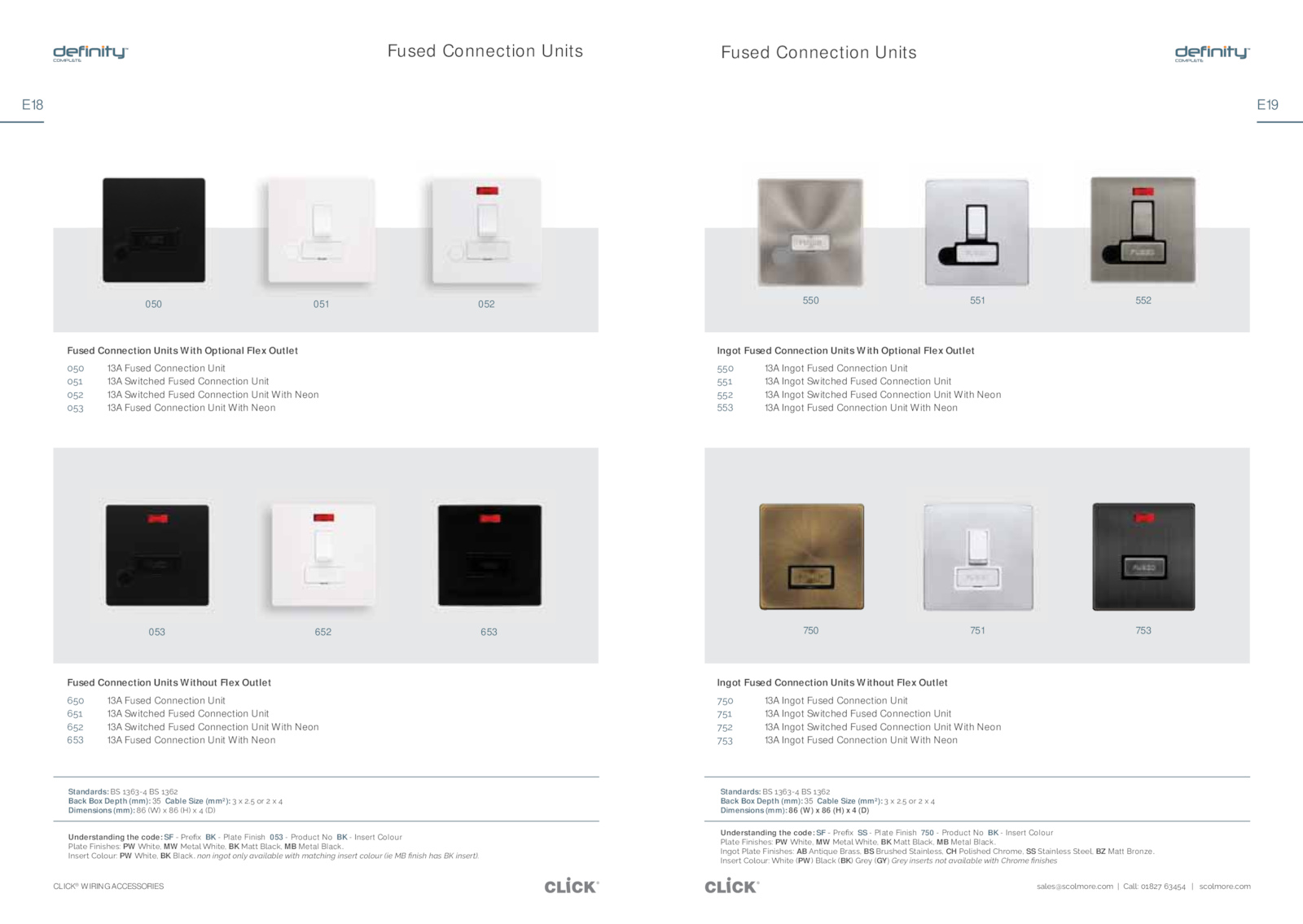 NœƊĎƂƖ΄ŜʼnŜƞƂ͙΄PW ÎĮijƖĎ͚΄BK Black. NœħŜƖ΄ʼnåƖĎ΄AijœijƊĮĎƊ͙΄AB΄œƖijƁƞĎ΄ƂåƊƊ͚΄BS΄ƂƞƊĮĎĈ΄¢ƖåijœʼnĎƊƊ͚΄CH΄ŜʼnijƊĮĎĈ΄ĮƂŜőĎ͚΄SS΄¢ƖåijœʼnĎƊƊ΄¢ƖĎĎʼn͚΄BZ Matt Bronze. NœƊĎƂƖ΄ŜʼnŜƞƂ͙΄ÎĮijƖĎ΄ͬPWͭ΄ʼnåāņ΄ͬBKͭ΄BƂĎƼ΄ͬGY)ͩBżĉƳͩĮŎƄĉżƍƄͩŎŗƍͩàƬàĮńàûńĉͩƭĮƍĩͩĩżŗŌĉͩǏŎĮƄĩĉƄ Fused Connection Units Without Flex Outlet ̋̊̅ 13A Fused Connection Unit ̋̊̆ 13A Switched Fused Connection Unit ̋̊̇ 13A Switched Fused Connection Unit With Neon 653 13A Fused Connection Unit With Neon Ingot Fused Connection Units Without Flex Outlet ̌̊̅ 13A Ingot Fused Connection Unit ̌̊̆ 13A Ingot Switched Fused Connection Unit ̌̊̇ 13A Ingot Switched Fused Connection Unit With Neon ̌̊̈ 13A Ingot Fused Connection Unit With Neon .ƊåʼnĎƊοƊāŜʼnőŜƂĎ͟āŜő΄΄χ΄΄åʼnʼn͙΄̅̆̍̇̌΄̋̈̉̊̉΄΄΄χ΄΄΄ƊāŜʼnőŜƂĎ͟āŜő CLICK® WIRING ACCESSORIES E19 E18 Fused Connection Units Ingot Fused Connection Units With Optional Flex Outlet ̊̊̅ 13A Ingot Fused Connection Unit ̊̊̆ 13A Ingot Switched Fused Connection Unit ̊̊̇ 13A Ingot Switched Fused Connection Unit With Neon 553 13A Ingot Fused Connection Unit With Neon Fused Connection Units Fused Connection Units With Optional Flex Outlet ̅̊̅ 13A Fused Connection Unit ̅̊̆ 13A Switched Fused Connection Unit ̅̊̇ 13A Switched Fused Connection Unit With Neon ̅̊̈ 13A Fused Connection Unit With Neon Standards:΄¢΄̆̈̋̈Ͳ̉΄¢΄̆̈̋̇ Back Box Depth (mm): Cable Size (mm²):΄̈΄ƻ΄̇̊͟΄ŜƂ΄̇΄ƻ΄̉ Dimensions (mm): (W) (H) (D) Standards:΄¢΄̆̈̋̈Ͳ̉΄¢΄̆̈̋̇΄ Back Box Depth (mm): Cable Size (mm²):΄̈΄ƻ΄̇̊͟΄ŜƂ΄̇΄ƻ΄̉ Dimensions (mm):΄̍̋΄ͬÎͭ΄ƻ΄̍̋΄ͬIͭ΄ƻ΄̉΄ͬ$ͭ 550 751 551 552 750 753 050 053 051 652 052 653 Understanding the code: SF΄Ͳ΄ƂĎǙƻ΄΄BK Plate Finish 053 Product Insert Colour ʼnåƖĎ΄AijœijƊĮĎƊ͙΄PW΄ÎĮijƖĎ͚΄MW iĎƖåʼn΄ÎĮijƖĎ͚΄BK΄iåƖƖ΄ʼnåāņ͚΄MB Metal Black. ŎŗŎͩĮŎĢŗƍͩŗŎńƳͩàƬàĮńàûńĉͩƭĮƍĩͩŌàƍüĩĮŎĢͩĮŎƄĉżƍͩüŗńŗƕżͩ͒ĮĉͩiͩǏŎĮƄĩͩĩàƄͩ_ͩĮŎƄĉżƍ͓ͅ Understanding the code: SF΄Ͳ΄ƂĎǙƻ΄΄SS Plate Finish 750 Product Insert Colour ʼnåƖĎ΄AijœijƊĮĎƊ͙΄PW΄ÎĮijƖĎ͚΄MW iĎƖåʼn΄ÎĮijƖĎ͚΄BK΄iåƖƖ΄ʼnåāņ͚΄MB Metal Black