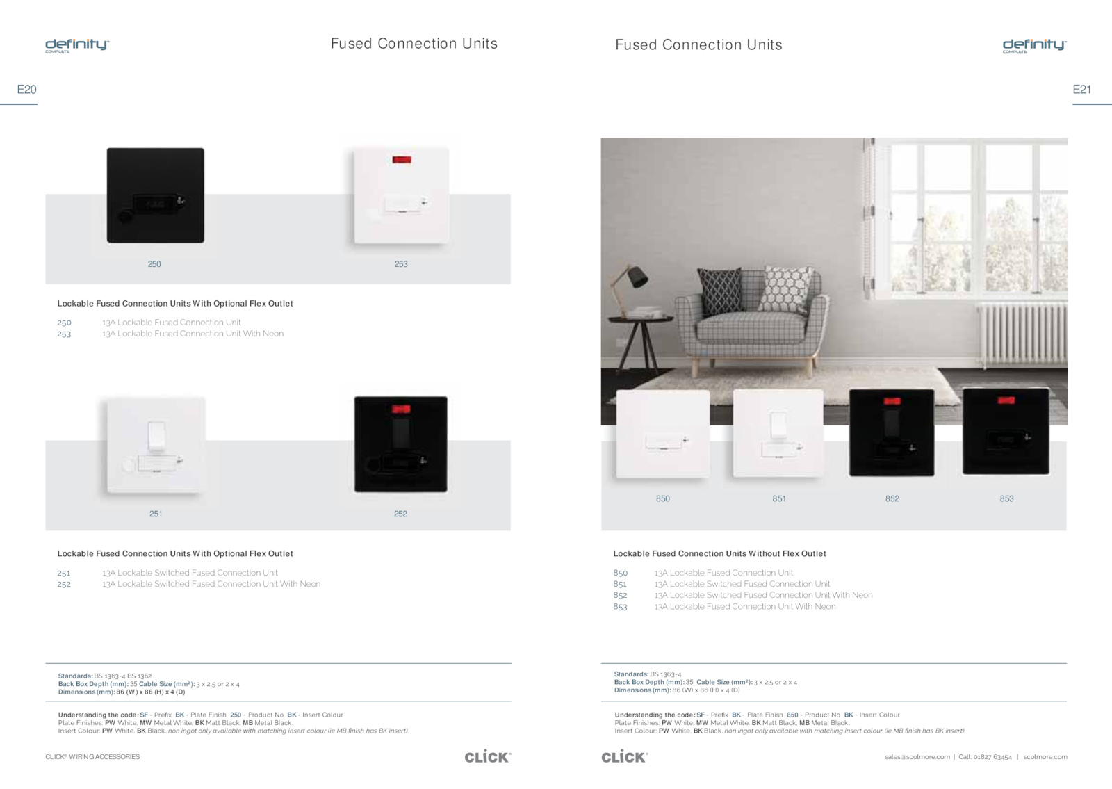 ŎŗŎͩĮŎĢŗƍͩŗŎńƳͩàƬàĮńàûńĉͩƭĮƍĩͩŌàƍüĩĮŎĢͩĮŎƄĉżƍͩüŗńŗƕżͩ͒ĮĉͩiͩǏŎĮƄĩͩĩàƄͩ_ͩĮŎƄĉżƍ͓ͅ Lockable Fused Connection Units With Optional Flex Outlet ̇̊̆ ̆̈΄aŜāņåĀʼnĎ΄¢ƶijƖāĮĎĈ΄AƞƊĎĈ΄ŜœœĎāƖijŜœ΄¶œijƖ ̇̊̇ ̆̈΄aŜāņåĀʼnĎ΄¢ƶijƖāĮĎĈ΄AƞƊĎĈ΄ŜœœĎāƖijŜœ΄¶œijƖ΄ÎijƖĮ΄kĎŜœ .ƊåʼnĎƊοƊāŜʼnőŜƂĎ͟āŜő΄΄χ΄΄åʼnʼn͙΄̅̆̍̇̌΄̋̈̉̊̉΄΄΄χ΄΄΄ƊāŜʼnőŜƂĎ͟āŜő CLICK® WIRING ACCESSORIES E21 E20 Fused Connection Units Lockable Fused Connection Units Without Flex Outlet ̍̊̅ ̆̈΄aŜāņåĀʼnĎ΄AƞƊĎĈ΄ŜœœĎāƖijŜœ΄¶œijƖ ̍̊̆ ̆̈΄aŜāņåĀʼnĎ΄¢ƶijƖāĮĎĈ΄AƞƊĎĈ΄ŜœœĎāƖijŜœ΄¶œijƖ ̍̊̇ ̆̈΄aŜāņåĀʼnĎ΄¢ƶijƖāĮĎĈ΄AƞƊĎĈ΄ŜœœĎāƖijŜœ΄¶œijƖ΄ÎijƖĮ΄kĎŜœ ̍̊̈ ̆̈΄aŜāņåĀʼnĎ΄AƞƊĎĈ΄ŜœœĎāƖijŜœ΄¶œijƖ΄ÎijƖĮ΄kĎŜœ Fused Connection Units Lockable Fused Connection Units With Optional Flex Outlet ̇̊̅ ̆̈΄aŜāņåĀʼnĎ΄AƞƊĎĈ΄ŜœœĎāƖijŜœ΄¶œijƖ ̇̊̈ ̆̈΄aŜāņåĀʼnĎ΄AƞƊĎĈ΄ŜœœĎāƖijŜœ΄¶œijƖ΄ÎijƖĮ΄kĎŜœ Standards:΄¢΄̆̈̋̈Ͳ̉ Back Box Depth (mm): Cable Size (mm²):΄̈΄ƻ΄̇̊͟΄ŜƂ΄̇΄ƻ΄̉ Dimensions (mm):΄̍̋΄ͬÎͭ΄ƻ΄̍̋΄ͬIͭ΄ƻ΄̉΄ͬ$ͭ Standards:΄¢΄̆̈̋̈Ͳ̉΄¢΄̆̈̋̇ Back Box Depth (mm): Cable Size (mm²):΄̈΄ƻ΄̇̊͟΄ŜƂ΄̇΄ƻ΄̉ Dimensions (mm): (W) (H) (D) 250 253 851 251 852 252 850 853 Understanding the code: SF΄Ͳ΄ƂĎǙƻ΄΄BK Plate Finish 250 Product Insert Colour ʼnåƖĎ΄AijœijƊĮĎƊ͙΄PW΄ÎĮijƖĎ͚΄MW iĎƖåʼn΄ÎĮijƖĎ͚΄BK΄iåƖƖ΄ʼnåāņ͚΄MB Metal Black. NœƊĎƂƖ΄ŜʼnŜƞƂ͙΄PW ÎĮijƖĎ͚΄BK Black. NœƊĎƂƖ΄ŜʼnŜƞƂ͙΄PW ÎĮijƖĎ͚΄BK Black. ŎŗŎͩĮŎĢŗƍͩŗŎńƳͩàƬàĮńàûńĉͩƭĮƍĩͩŌàƍüĩĮŎĢͩĮŎƄĉżƍͩüŗńŗƕżͩ͒ĮĉͩiͩǏŎĮƄĩͩĩàƄͩ_ͩĮŎƄĉżƍ͓ͅ Understanding the code: SF΄Ͳ΄ƂĎǙƻ΄΄BK Plate Finish 850 Product Insert Colour ʼnåƖĎ΄AijœijƊĮĎƊ͙΄PW΄ÎĮijƖĎ͚΄MW iĎƖåʼn΄ÎĮijƖĎ͚΄BK΄iåƖƖ΄ʼnåāņ͚΄MB Metal Black