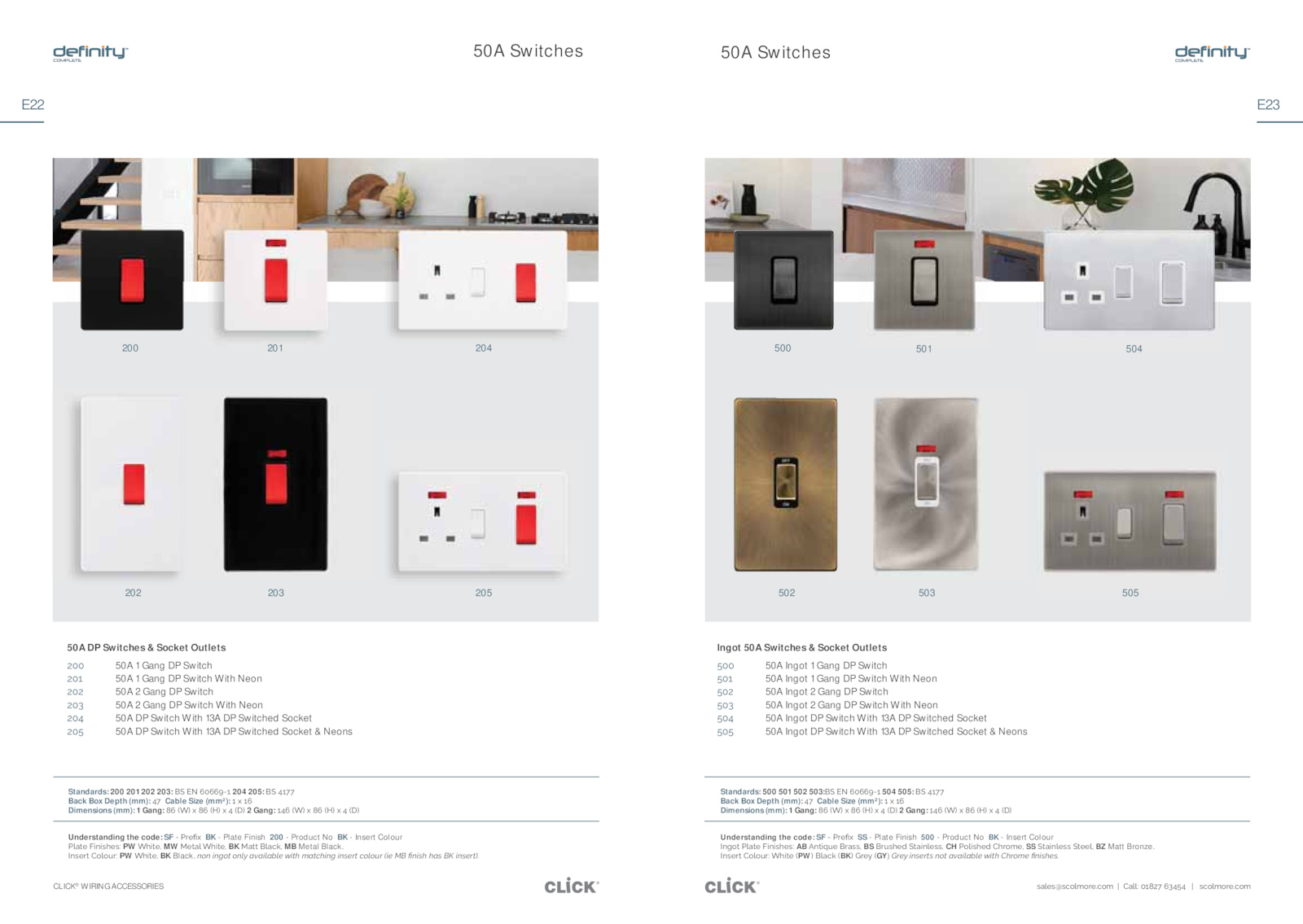 ƊåʼnĎƊοƊāŜʼnőŜƂĎ͟āŜő΄΄χ΄΄åʼnʼn͙΄̅̆̍̇̌΄̋̈̉̊̉΄΄΄χ΄΄΄ƊāŜʼnőŜƂĎ͟āŜő CLICK® WIRING ACCESSORIES E23 E22 50A Switches Ingot 50A Switches Socket Outlets ̊̅̅ 50A Ingot Gang Switch ̊̅̆ 50A Ingot Gang Switch With Neon ̊̅̇ 50A Ingot Gang Switch ̊̅̈ 50A Ingot Gang Switch With Neon ̊̅̉ 50A Ingot Switch With 13A Switched Socket ̊̅̊ 50A Ingot Switch With 13A Switched Socket Neons 50A Switches 50A Switches Socket Outlets ̇̅̅ 50A Gang Switch ̇̅̆ 50A Gang Switch With Neon ̇̅̇ 50A Gang Switch ̇̅̈ 50A Gang Switch With Neon ̇̅̉ 50A Switch With 13A Switched Socket ̇̅̊ 50A Switch With 13A Switched Socket Neons Standards: 500 501 502 503:¢΄*k΄̋̅̋̋̎Ͳ̆ 504 505: ¢΄̉̆̌̌ Back Box Depth (mm):΄̉̌΄΄Cable Size (mm²):΄̆΄ƻ΄̆̋ Dimensions (mm): Gang:΄̍̋΄ͬÎͭ΄ƻ΄̍̋΄ͬIͭ΄ƻ΄̉΄ͬ$ͭ΄2 Gang:΄̆̉̋΄ͬÎͭ΄ƻ΄̍̋΄ͬIͭ΄ƻ΄̉΄ͬ$ͭ΄ Standards: 200 201 202 203:΄¢΄*k΄̋̅̋̋̎Ͳ̆΄204 205:΄¢΄̉̆̌̌ Back Box Depth (mm):΄̉̌΄΄Cable Size (mm²):΄̆΄ƻ΄̆̋ Dimensions (mm): Gang:΄̍̋΄ͬÎͭ΄ƻ΄̍̋΄ͬIͭ΄ƻ΄̉΄ͬ$ͭ΄2 Gang:΄̆̉̋΄ͬÎͭ΄ƻ΄̍̋΄ͬIͭ΄ƻ΄̉΄ͬ$ͭ΄ 500 504 501 502 505 503 200 201 204 202 205 203 Understanding the code: SF΄Ͳ΄ƂĎǙƻ΄΄BK Plate Finish 200 Product Insert Colour ʼnåƖĎ΄AijœijƊĮĎƊ͙΄PW΄ÎĮijƖĎ͚΄MW iĎƖåʼn΄ÎĮijƖĎ͚΄BK΄iåƖƖ΄ʼnåāņ͚΄MB Metal Black. NœƊĎƂƖ΄ŜʼnŜƞƂ͙΄ÎĮijƖĎ΄ͬPWͭ΄ʼnåāņ΄ͬBKͭ΄BƂĎƼ΄ͬGY) BżĉƳͩĮŎƄĉżƍƄͩŎŗƍͩàƬàĮńàûńĉͩƭĮƍĩͩĩżŗŌĉͩǏŎĮƄĩĉƄͅ . NœƊĎƂƖ΄ŜʼnŜƞƂ͙΄PW ÎĮijƖĎ͚΄BK Black. ŎŗŎͩĮŎĢŗƍͩŗŎńƳͩàƬàĮńàûńĉͩƭĮƍĩͩŌàƍüĩĮŎĢͩĮŎƄĉżƍͩüŗńŗƕżͩ͒ĮĉͩiͩǏŎĮƄĩͩĩàƄͩ_ͩĮŎƄĉżƍ͓ͅ Understanding the code: SF΄Ͳ΄ƂĎǙƻ΄΄SS Plate Finish 500 Product Insert Colour NœħŜƖ΄ʼnåƖĎ΄AijœijƊĮĎƊ͙΄AB΄œƖijƁƞĎ΄ƂåƊƊ͚΄BS΄ƂƞƊĮĎĈ΄¢ƖåijœʼnĎƊƊ͚΄CH΄ŜʼnijƊĮĎĈ΄ĮƂŜőĎ͚΄SS΄¢ƖåijœʼnĎƊƊ΄¢ƖĎĎʼn͚΄BZ Matt Bronze