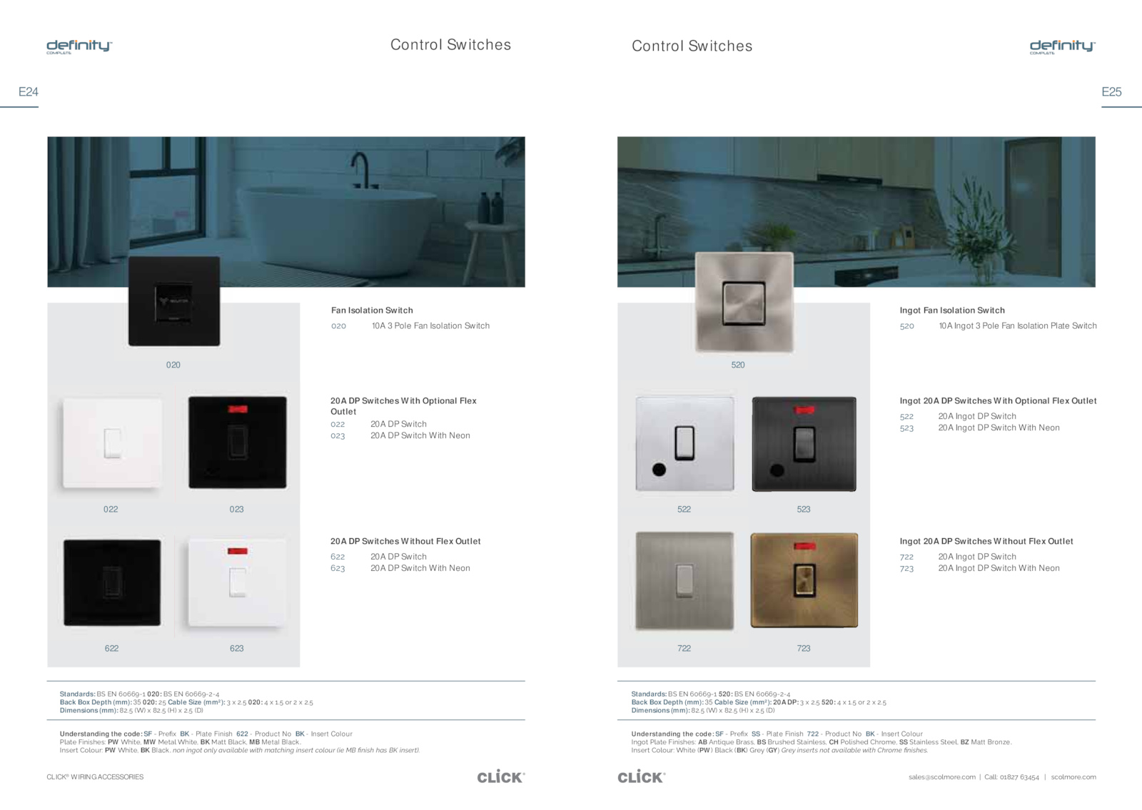 ƊåʼnĎƊοƊāŜʼnőŜƂĎ͟āŜő΄΄χ΄΄åʼnʼn͙΄̅̆̍̇̌΄̋̈̉̊̉΄΄΄χ΄΄΄ƊāŜʼnőŜƂĎ͟āŜő CLICK® WIRING ACCESSORIES E25 E24 Ingot 20A Switches With Optional Flex Outlet ̊̇̇ 20A Ingot Switch ̊̇̈ 20A Ingot Switch With Neon Control Switches Control Switches Fan Isolation Switch ̅̇̅ 10A Pole Fan Isolation Switch Standards: ¢΄*k΄̋̅̋̋̎Ͳ̆΄520:΄¢΄*k΄̋̅̋̋̎Ͳ̇Ͳ̉ Back Box Depth (mm): Cable Size (mm²): 20A DP:΄̈΄ƻ΄̇̊͟΄520:΄̉΄ƻ΄̆̊͟΄ŜƂ΄̇΄ƻ΄̇̊͟ Dimensions (mm):΄̍̇̊͟΄ͬÎͭ΄ƻ΄̍̇̊͟΄ͬIͭ΄ƻ΄̇̊͟΄ͬ$ͭ Standards:΄¢΄*k΄̋̅̋̋̎Ͳ̆΄020:΄¢΄*k΄̋̅̋̋̎Ͳ̇Ͳ̉΄ Back Box Depth (mm): 020:΄̇̊΄Cable Size (mm²):΄̈΄ƻ΄̇̊͟΄020:΄̉΄ƻ΄̆̊͟΄ŜƂ΄̇΄ƻ΄̇̊͟ Dimensions (mm):΄̍̇̊͟΄ͬÎͭ΄ƻ΄̍̇̊͟΄ͬIͭ΄ƻ΄̇̊͟΄ͬ$ͭ 022 522 622 722 023 523 623 723 020 520 20A Switches With Optional Flex Outlet ̅̇̇ 20A Switch ̅̇̈ 20A Switch With Neon 20A Switches Without Flex Outlet ̋̇̇ 20A Switch ̋̇̈ 20A Switch With Neon Ingot Fan Isolation Switch ̊̇̅ 10A Ingot Pole Fan Isolation Plate Switch Ingot 20A Switches Without Flex Outlet ̌̇̇ 20A Ingot Switch ̌̇̈ 20A Ingot Switch With Neon Understanding the code: SF΄Ͳ΄ƂĎǙƻ΄΄BK Plate Finish 622 Product Insert Colour ʼnåƖĎ΄AijœijƊĮĎƊ͙΄PW΄ÎĮijƖĎ͚΄MW iĎƖåʼn΄ÎĮijƖĎ͚΄BK΄iåƖƖ΄ʼnåāņ͚΄MB Metal Black. NœƊĎƂƖ΄ŜʼnŜƞƂ͙΄PW ÎĮijƖĎ͚΄BK Black. ŎŗŎͩĮŎĢŗƍͩŗŎńƳͩàƬàĮńàûńĉͩƭĮƍĩͩŌàƍüĩĮŎĢͩĮŎƄĉżƍͩüŗńŗƕżͩ͒ĮĉͩiͩǏŎĮƄĩͩĩàƄͩ_ͩĮŎƄĉżƍ͓ͅ Understanding the code: SF΄Ͳ΄ƂĎǙƻ΄΄SS Plate Finish 722 Product Insert Colour NœħŜƖ΄ʼnåƖĎ΄AijœijƊĮĎƊ͙΄AB΄œƖijƁƞĎ΄ƂåƊƊ͚΄BS΄ƂƞƊĮĎĈ΄¢ƖåijœʼnĎƊƊ͚΄CH΄ŜʼnijƊĮĎĈ΄ĮƂŜőĎ͚΄SS΄¢ƖåijœʼnĎƊƊ΄¢ƖĎĎʼn͚΄BZ Matt Bronze. NœƊĎƂƖ΄ŜʼnŜƞƂ͙΄ÎĮijƖĎ΄ͬPWͭ΄ʼnåāņ΄ͬBKͭ΄BƂĎƼ΄ͬGY) BżĉƳͩĮŎƄĉżƍƄͩŎŗƍͩàƬàĮńàûńĉͩƭĮƍĩͩĩżŗŌĉͩǏŎĮƄĩĉƄͅ