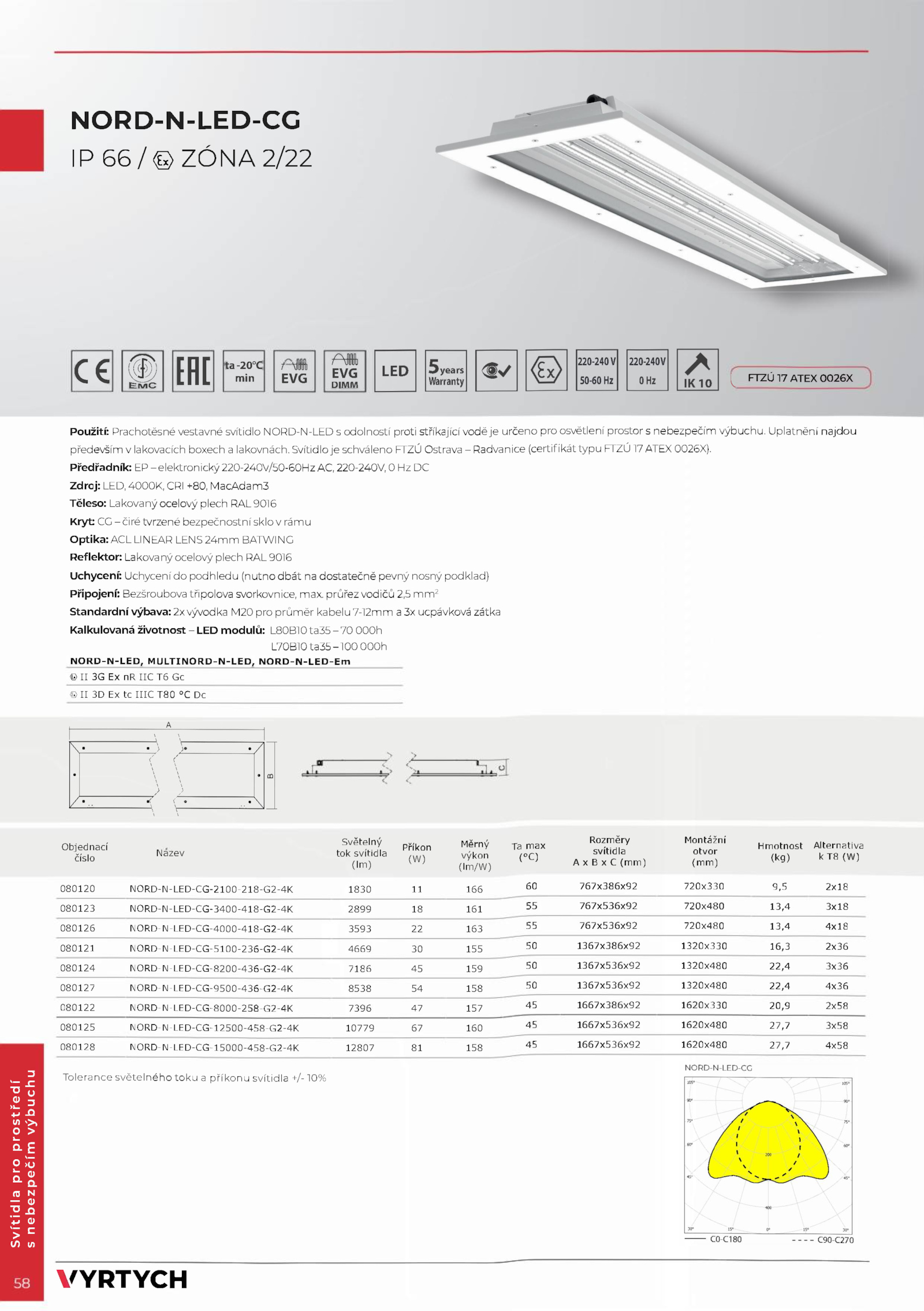 Použití: Prachotěsné vestavné svítidlo NORD-N-LED odolností proti stříkajícívoděje určeno pro osvětlení prostor nebezpečím výbuchu. Svítidloje schváleno FTZÚ Ostrava -Radvanice (certifikát typu FTZÚ 17ATEX 0026X). průřez vodičů 2,5 mm2