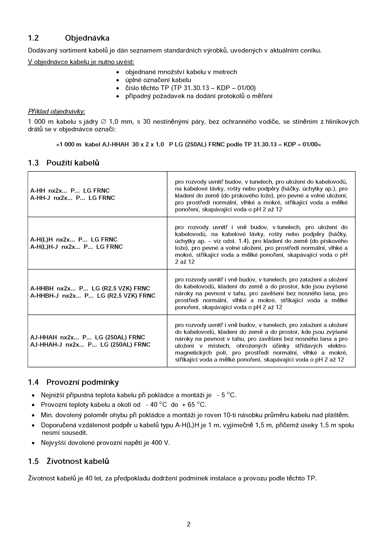 A-H(L)H nx2x... P. objednávce kabelu nutno uvést: objednané množství kabelu metrech úplné označení kabelu číslo těchto (TP 31.