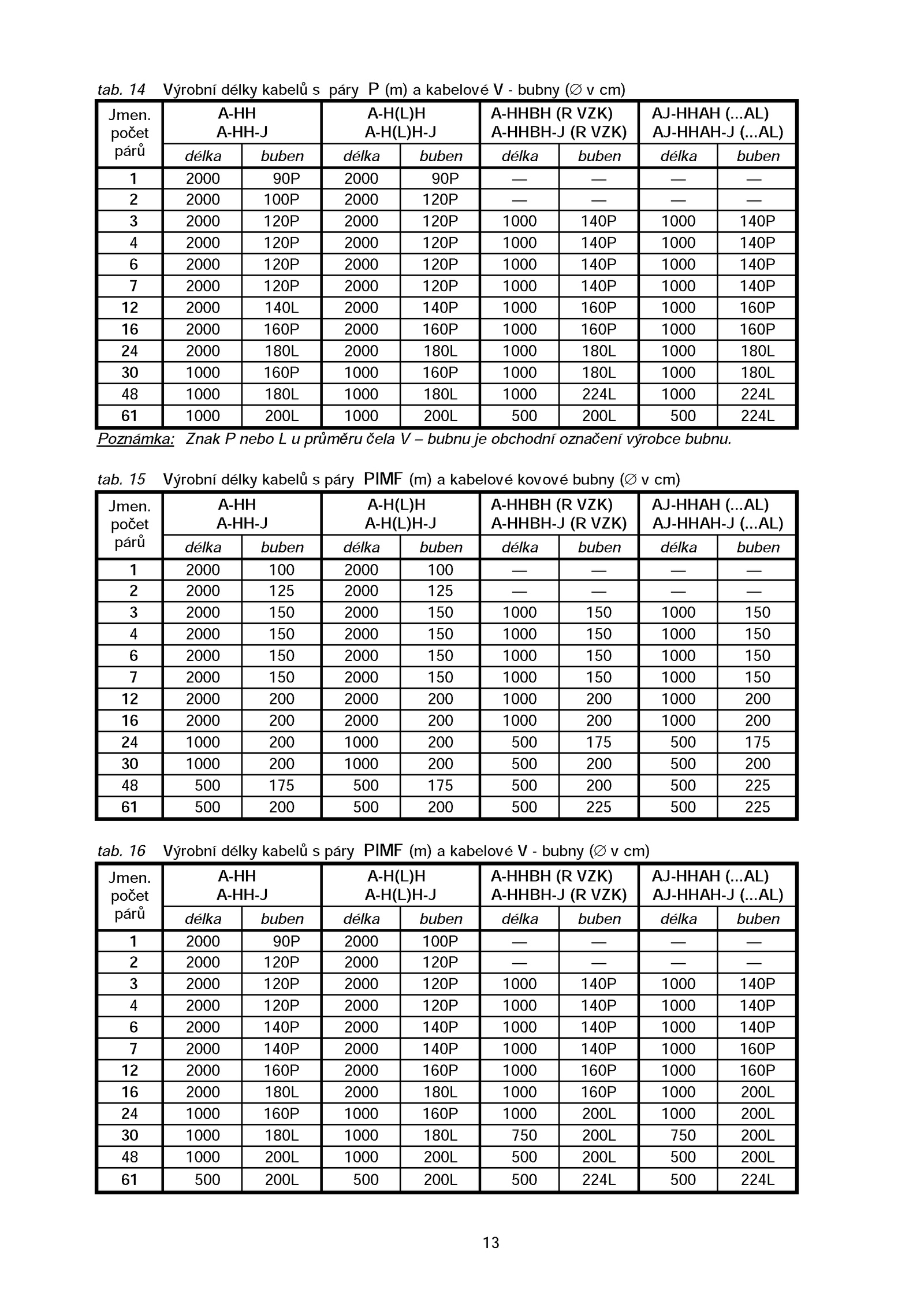 AL) délka buben délka buben délka — — buben — — délka — — buben — — 1 2 3 4 6 7 12 16 61 2000 2000 2000 2000 2000 2000 2000 2000 1000 1000 500 500 100 125 150 150 150 150 200 200 200 200 175 2000 2000 2000 2000 2000 2000 2000 2000 1000 1000 500 500 100 125 150 150 150 150 200 200 200 200 175 1000 1000 1000 1000 1000 1000 500 500 500 500 150 150 150 150 200 200 175 1000 1000 1000 1000 1000 1000 500 500 500 500 150 150 150 150 200 200 175 200 200 225 200 225 225 200 200 tab...AL) AJ-HHAH-J (. 16 Jmen.AL) délka buben 90P 100P 120P 120P 120P 120P 140L 160P 180L 160P 180L 200L délka buben 90P 120P 120P 120P 120P 120P 140P 160P 180L 160P 180L 200L délka — — buben — — délka — — buben — — 1 2 3 4 6 7 12 16 61 2000 2000 2000 2000 2000 2000 2000 2000 2000 1000 1000 1000 2000 2000 2000 2000 2000 2000 2000 2000 2000 1000 1000 1000 1000 1000 1000 1000 1000 1000 1000 1000 1000 500 140P 140P 140P 140P 160P 160P 180L 180L 224L 200L 1000 1000 1000 1000 1000 1000 1000 1000 1000 500 140P 140P 140P 140P 160P 160P 180L 180L 224L 224L Poznámka: Znak nebo průměru čela bubnu obchodní označení výrobce bubnu..... počet párů Výrobní délky kabelů páry (m) kabelové bubny cm) A-HH A-HH-J A-H(L)H A-H(L)H-J A-HHBH VZK) A-HHBH-J VZK) AJ-HHAH (.tab.AL) AJ-HHAH-J (..AL) délka buben 90P 120P 120P 120P 140P 140P 160P 180L 160P 180L 200L 200L délka buben 100P 120P 120P 120P 140P 140P 160P 180L 160P 180L 200L 200L délka — — buben — — délka — — buben — — 1 2 3 4 6 7 12 16 61 2000 2000 2000 2000 2000 2000 2000 2000 1000 1000 1000 500 2000 2000 2000 2000 2000 2000 2000 2000 1000 1000 1000 500 1000 1000 1000 1000 1000 1000 1000 750 500 500 140P 140P 140P 140P 160P 160P 200L 200L 200L 224L 1000 1000 1000 1000 1000 1000 1000 750 500 500 140P 140P 140P 160P 160P 200L 200L 200L 200L 224L 13 .AL) AJ-HHAH-J (... počet párů Výrobní délky kabelů páry PIMF (m) kabelové kovové bubny cm) A-HH A-HH-J A-H(L)H A-H(L)H-J A-HHBH VZK) A-HHBH-J VZK) AJ-HHAH (. 14 Jmen. 15 Jmen. počet párů Výrobní délky kabelů páry PIMF (m) kabelové bubny cm) A-HH A-HH-J A-H(L)H A-H(L)H-J A-HHBH VZK) A-HHBH-J VZK) AJ-HHAH (.. tab..