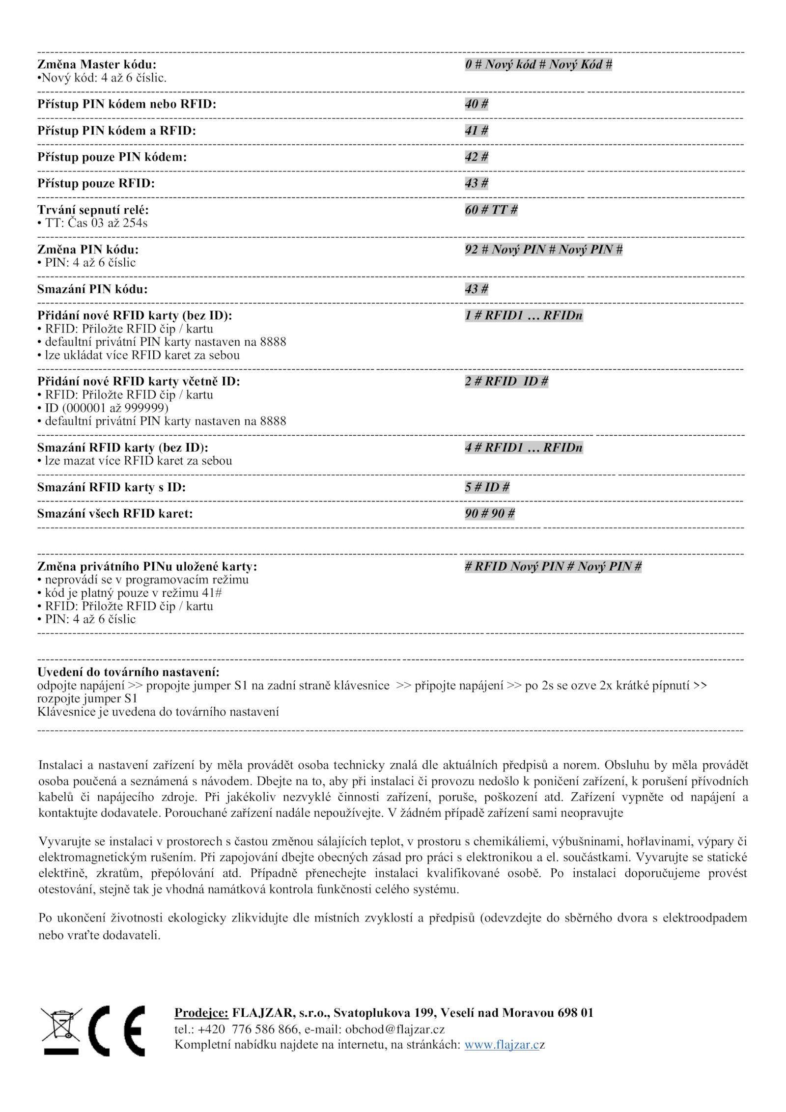 Prodejce: FLAJZAR, s.flajzar. Při jakékoliv nezvyklé činnosti zařízení, poruše, poškození atd. Dbejte to, aby při instalaci provozu nedošlo poničení zařízení, porušení přívodních