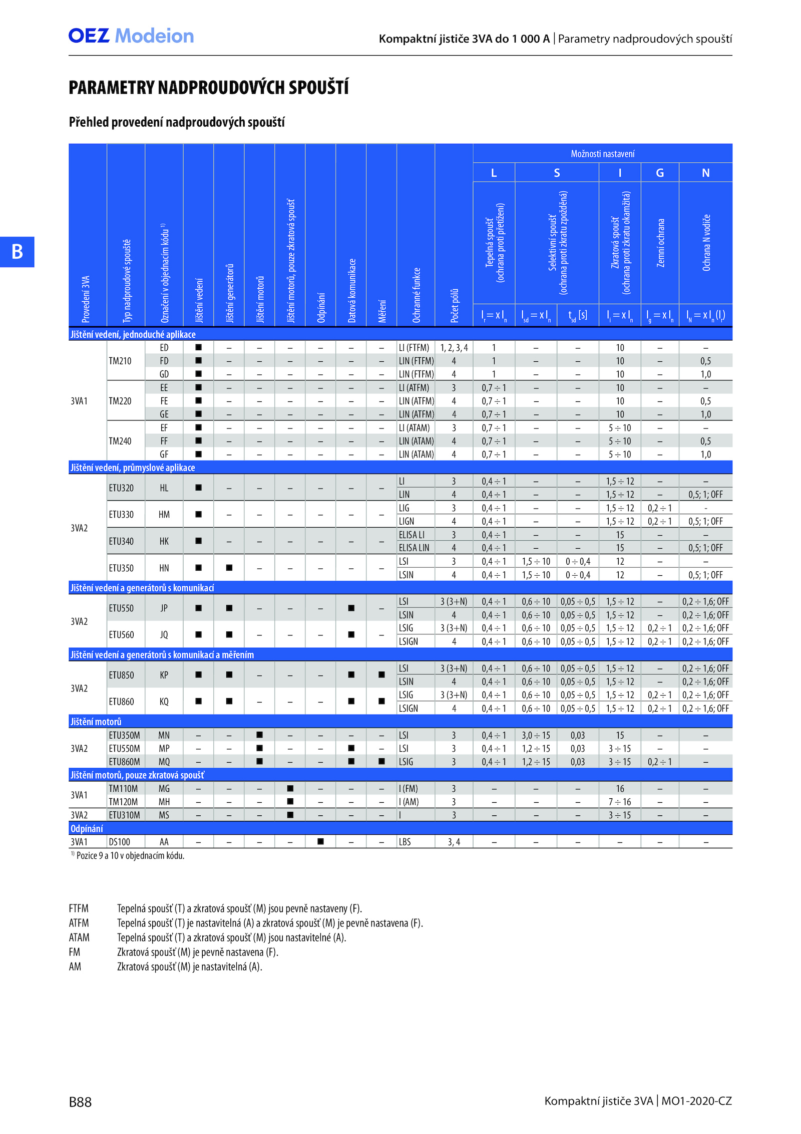 FTFM Tepelná spoušť (T) zkratová spoušť (M) jsou pevně nastaveny (F).B88 Kompaktní jističe 3VA MO1-2020-CZ