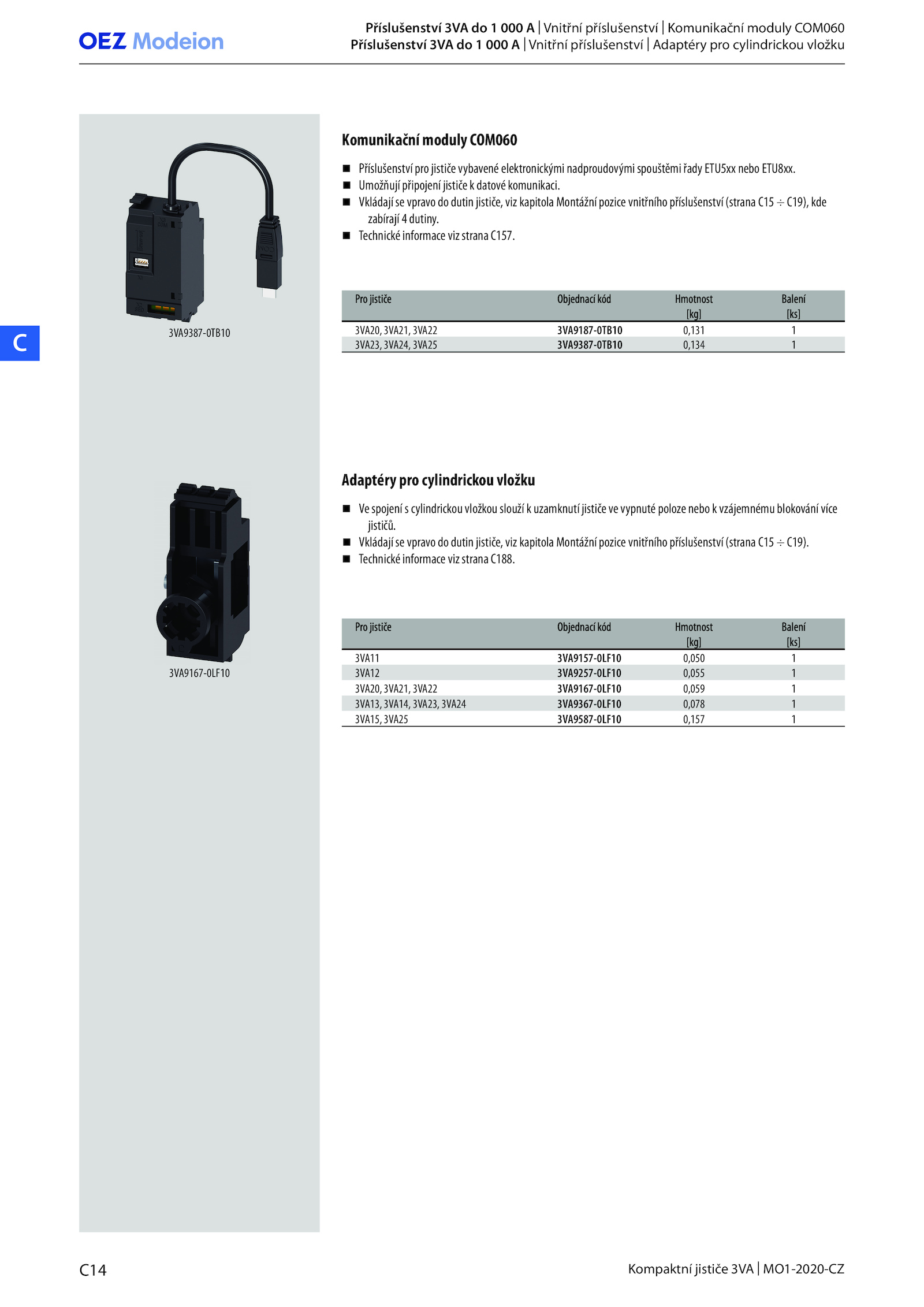 Vkládají vpravo dutin jističe, viz kapitola Montážní pozice vnitřního příslušenství (strana C15 C19).C14 Kompaktní jističe 3VA MO1-2020-CZ