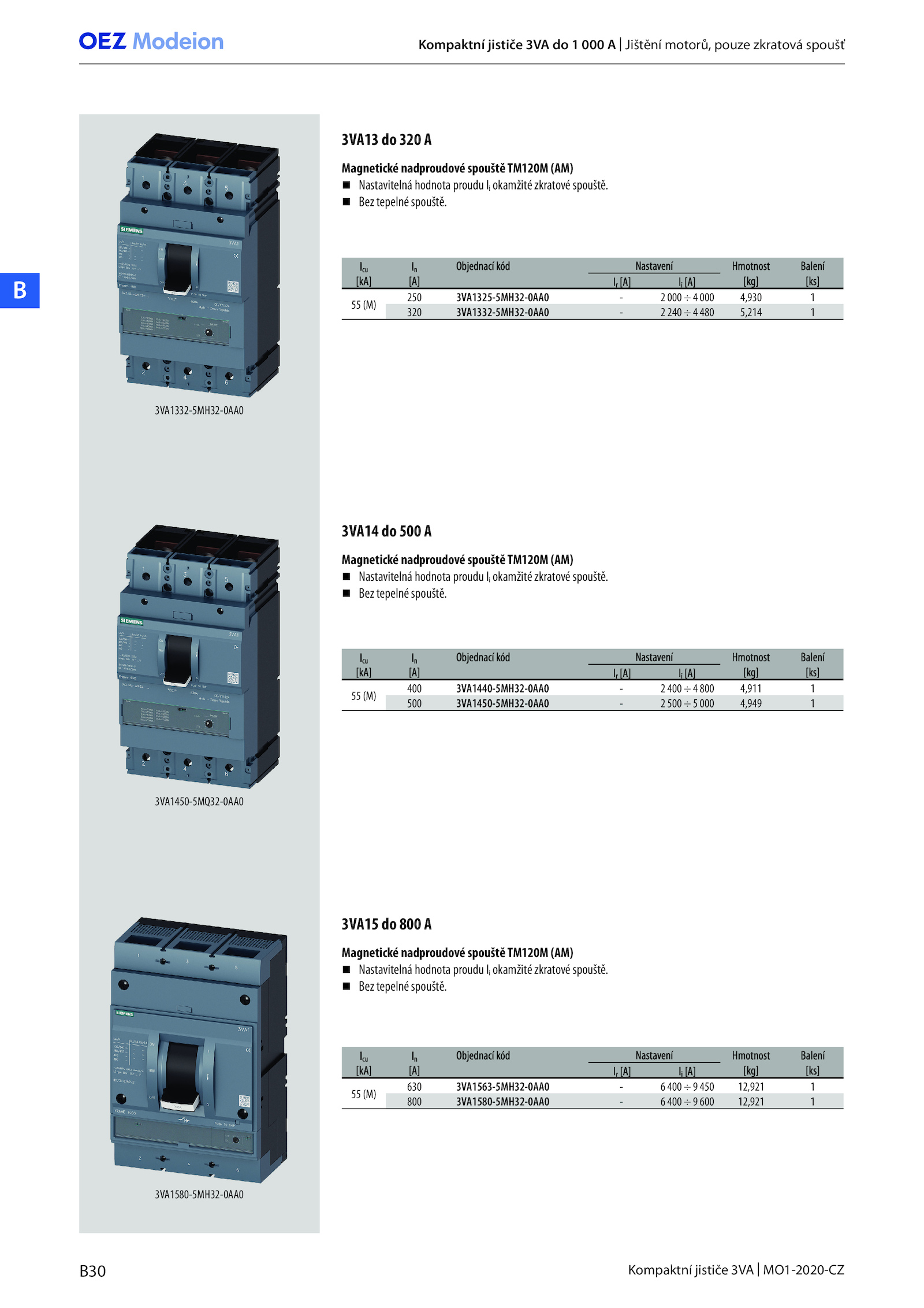 Bez tepelné spouště. Bez tepelné spouště. Icu cu Objednací kód Objednací kód Nastavení Nastavení Hmotnost Hmotnost Balení Balení [kA] [kA] [A] [A] IIr [A] [A] [A] [A] [kg] [kg] [ks] [ks] 55 (M) 630 3VA1563-5MH32-0AA0 400 450 12,921 1 800 3VA1580-5MH32-0AA0 400 600 12,921. Magnetické nadproudové spouštěTM120M (AM) Nastavitelná hodnota proudu okamžité zkratové spouště.B30 Kompaktní jističe 3VA MO1-2020-CZ B 3VA1332-5MH32-0AA0 3VA1450-5MQ32-0AA0 3VA13 320 A 3VA14 500 A Magnetické nadproudové spouštěTM120M (AM) Nastavitelná hodnota proudu okamžité zkratové spouště. Bez tepelné spouště. Icu cu Objednací kód Objednací kód Nastavení Nastavení Hmotnost Hmotnost Balení Balení [kA] [kA] [A] [A] IIr [A] [A] [A] [A] [kg] [kg] [ks] [ks] 55 (M) 250 3VA1325-5MH32-0AA0 000 000 4,930 1 320 3VA1332-5MH32-0AA0 240 480 5,214 1 Icu cu Objednací kód Objednací kód Nastavení Nastavení Hmotnost Hmotnost Balení Balení [kA] [kA] [A] [A] IIr [A] [A] [A] [A] [kg] [kg] [ks] [ks] 55 (M) 400 3VA1440-5MH32-0AA0 400 800 4,911 1 500 3VA1450-5MH32-0AA0 500 000 4,949 1 Kompaktní jističe 3VA 000 Jištění motorů, pouze zkratová spoušť 3VA1580-5MH32-0AA0 3VA15 800 A Magnetické nadproudové spouštěTM120M (AM) Nastavitelná hodnota proudu okamžité zkratové spouště