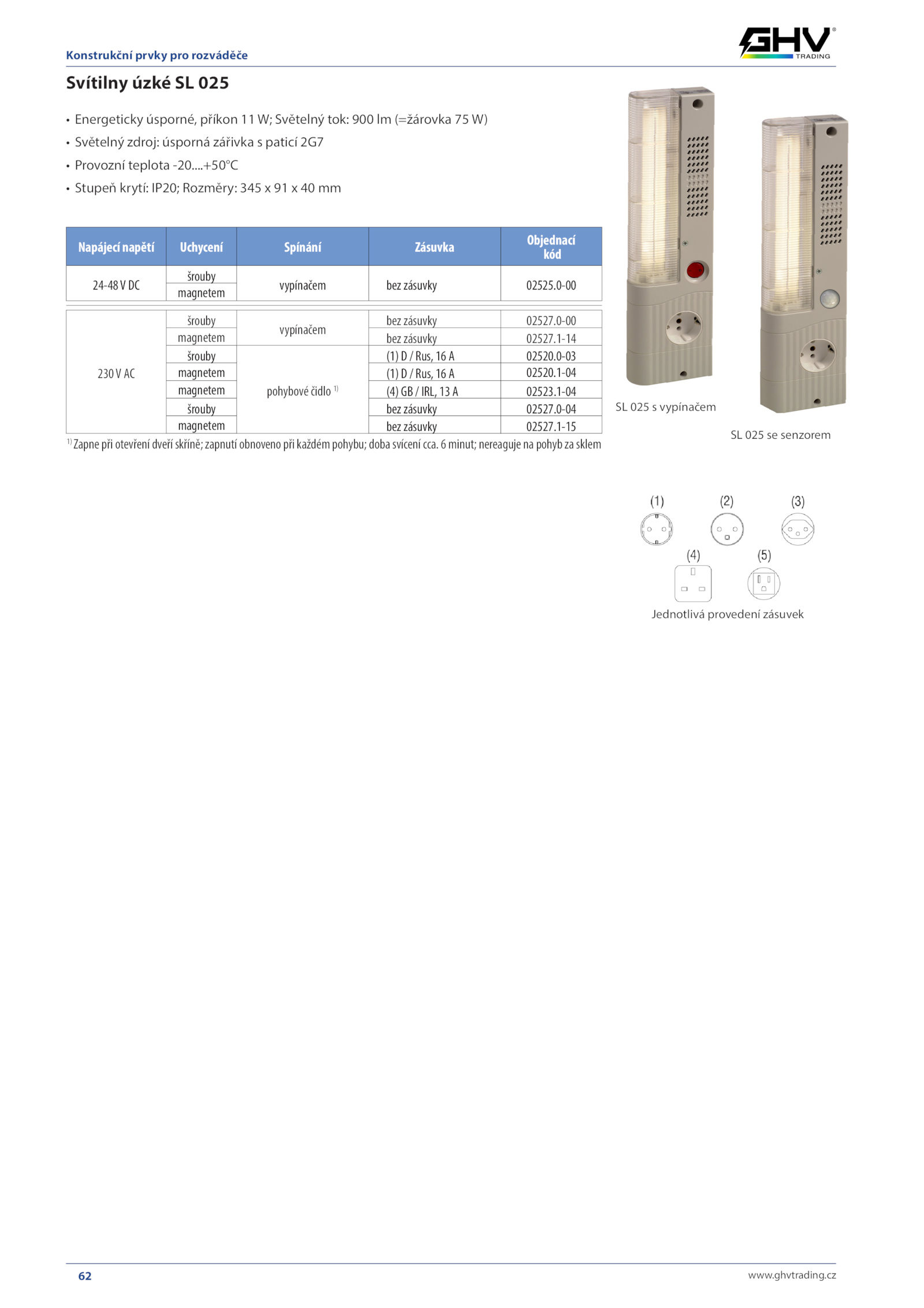 ghvtrading..6minut;nereagujenapohybzasklem SL 025 vypínačem Svítilny úzké 025 • Energeticky úsporné, příkon Světelný tok: 900 (=žárovka W) • Světelný zdroj: úsporná zářivka paticí 2G7 • Provozní teplota -20..1-14 šrouby pohybové čidlo 1) (1) Rus, 02520.+50°C • Stupeň krytí: IP20; Rozměry: 345 mm .1-15 1) Zapnepřiotevřenídveřískříně;zapnutíobnovenopřikaždémpohybu;dobasvícenícca.cz Konstrukční prvky pro rozváděče SL 025 senzorem Jednotlivá provedení zásuvek Napájecí napětí Uchycení Spínání Zásuvka Objednací kód 24-48V DC šrouby vypínačem bez zásuvky 02525.0-03 magnetem (1) Rus, 02520.0-04 magnetem bez zásuvky 02527.0-00 magnetem bez zásuvky 02527.1-04 šrouby bez zásuvky 02527.0-00 magnetem 230V AC šrouby vypínačem bez zásuvky 02527.www..1-04 magnetem (4) IRL, 02523