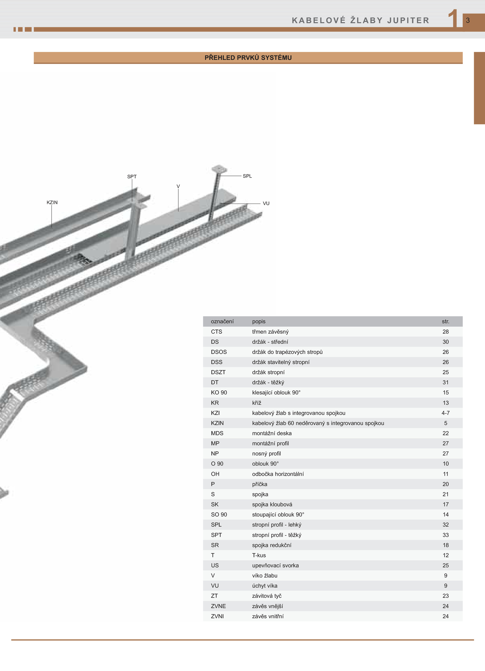 CTS třmen závěsný 28 DS držák střední 30 DSOS držák trapézových stropů 26 DSS držák stavitelný stropní 26 DSZT držák stropní 25 DT držák těžký 31 KO klesající oblouk 90° 15 KR kříž 13 KZI kabelový žlab integrovanou spojkou 4-7 KZIN kabelový žlab neděrovaný integrovanou spojkou 5 MDS montážní deska 22 MP montážní profil 27 NP nosný profil 27 O oblouk 90° 10 OH odbočka horizontální 11 P příčka 20 S spojka 21 SK spojka kloubová 17 SO stoupající oblouk 90° 14 SPL stropní profil lehký 32 SPT stropní profil těžký 33 SR spojka redukční 18 T T-kus 12 US upevňovací svorka 25 V víko žlabu 9 VU úchyt víka 9 ZT závitová tyč 23 ZVNE závěs vnější 24 ZVNI závěs vnitřní 24 PŘEHLED PRVKŮ SYSTÉMU SPL V SPT VUKZIN 1.označení popis str