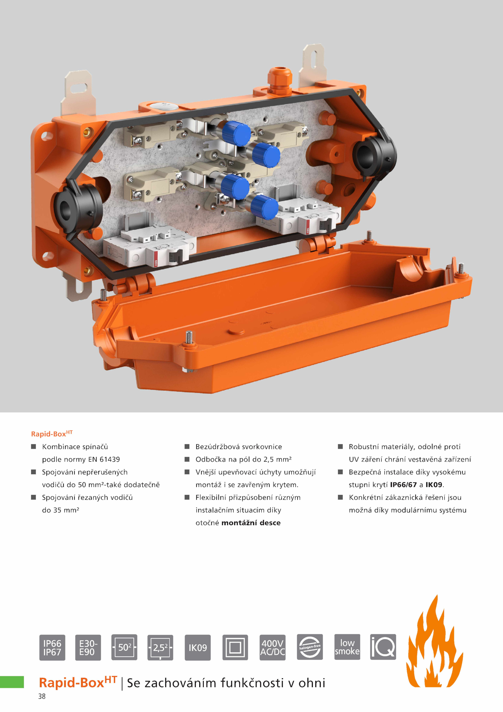 ■ Flexibilní přizpůsobení různým instalačním situacím díky otočné montážní desce ■ Robustní materiály, odolné proti UV záření chrání vestavěná zařízení ■ Bezpečná instalace díky vysokému stupni krytí IP66/67 IK09.Rapid-BoxHT ■ Kombinace spínačů podle normy 61439 ■ Spojování nepřerušených vodičů mm2-také dodatečně ■ Spojování řezaných vodičů do mm2 ■ Bezúdržbová svorkovnice ■ Odbočka pól 2,5 mm2 ■ Vnější upevňovací úchyty umožňují montáž zavřeným krytem. ■ Konkrétní zákaznická řešení jsou možná díky modulárnímu systému IP66 E30- IP67 E90 502 {2,5211 IK09 Rapid-BoxHT zachováním funkčnosti ohni 38