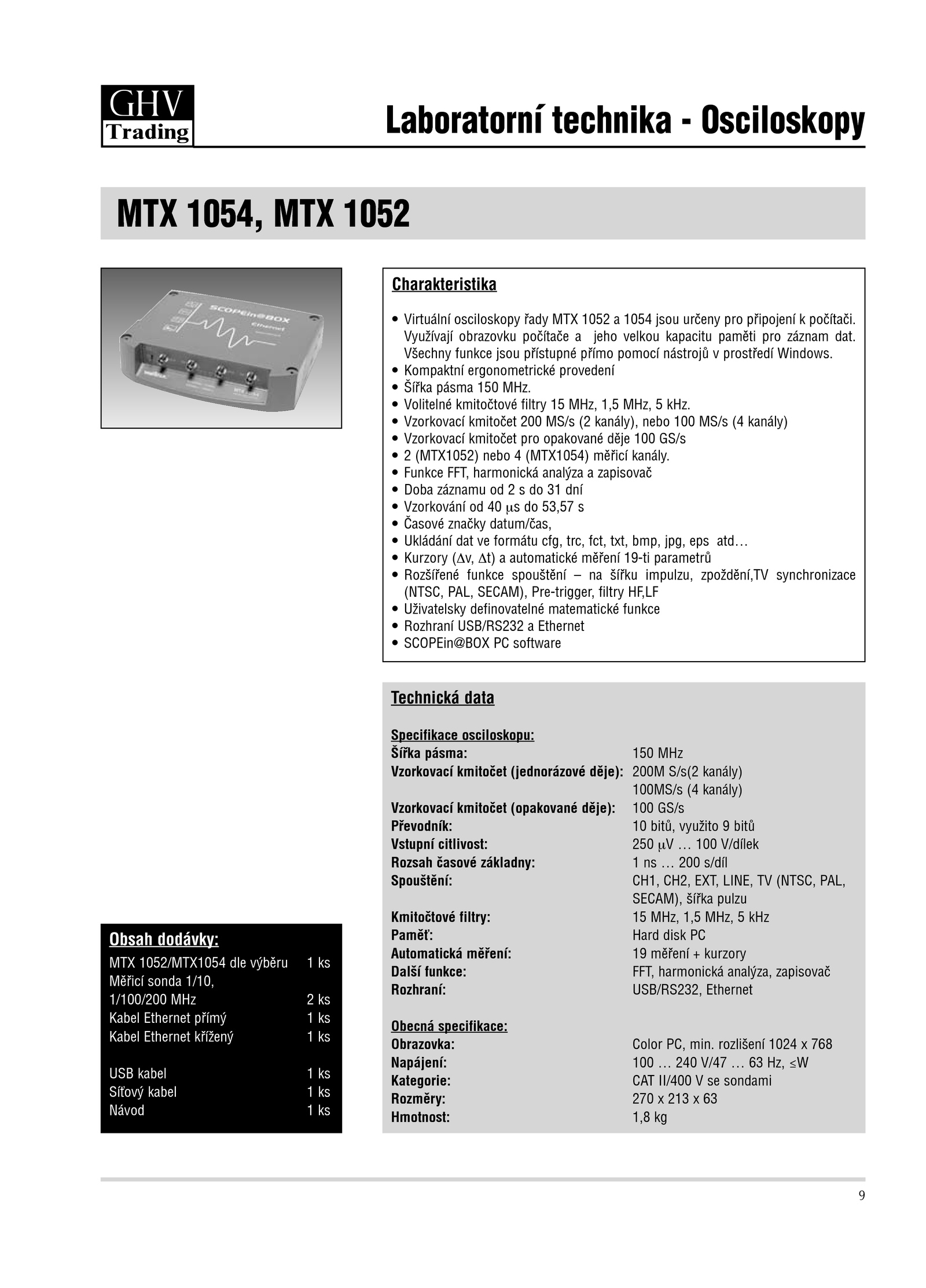 • Virtuální osciloskopy řady MTX 1052 1054 jsou určeny pro připojení počítači.3. Všechny funkce jsou přístupné přímo pomocí nástrojů prostředí Windows. Vzorkovací kmitočet 200 MS/s kanály), nebo 100 MS/s kanály) Vzorkovací kmitočet pro opakované děje 100 GS/s (MTX1052) nebo (MTX1054) měřicí kanály. Využívají obrazovku počítače jeho velkou kapacitu paměti pro záznam dat. Funkce FFT, harmonická analýza zapisovač Doba záznamu dní Vzorkování 53,57 Časové značky datum/čas, Ukládání dat formátu cfg, trc, fct, txt, bmp, jpg, eps atd… Kurzory (Δv, Δt) automatické měření 19-ti parametrů Rozšířené funkce spouštění šířku impulzu, zpoždění,TV synchronizace (NTSC, PAL, SECAM), Pre-trigger, filtry HF,LF Uživatelsky definovatelné matematické funkce Rozhraní USB/RS232 Ethernet SCOPEin@BOX software