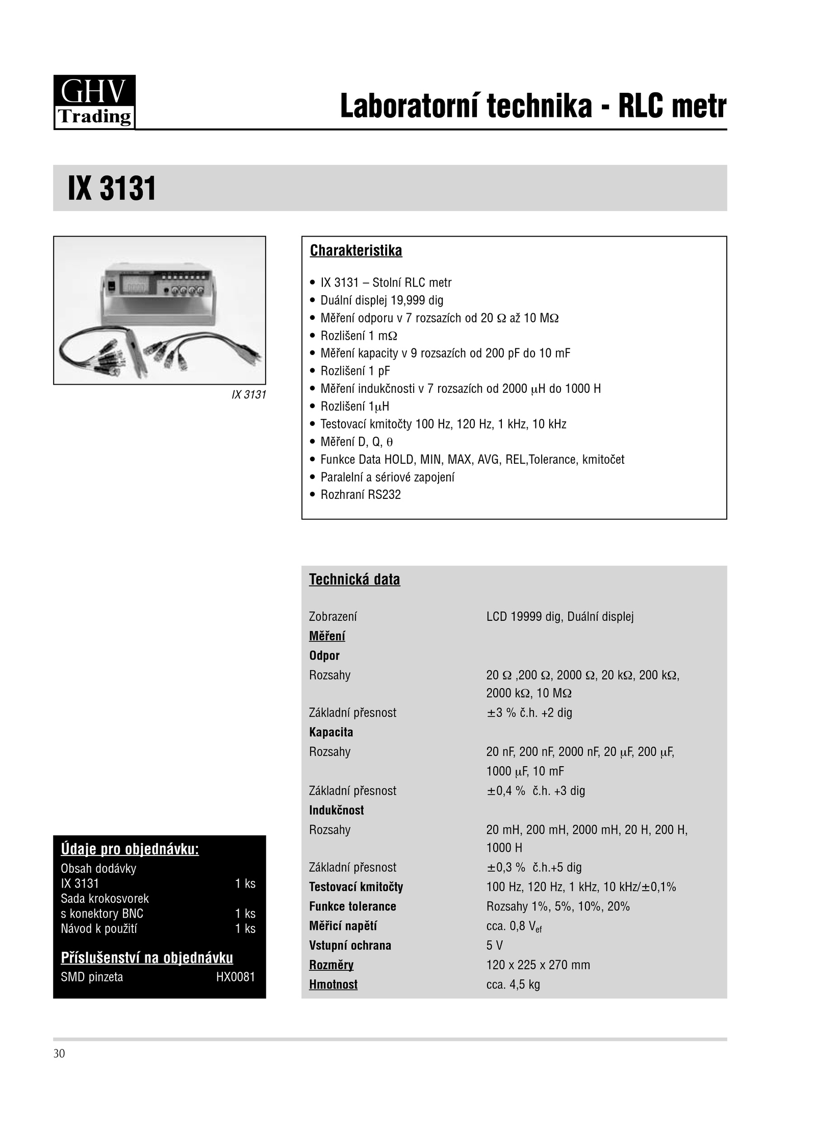 Obsah dodávky 3131 Sada krokosvorek konektory BNC Návod použití Základní přesnost Testovací kmitočty Funkce tolerance Měřicí napětí Vstupní ochrana Rozměry Hmotnost