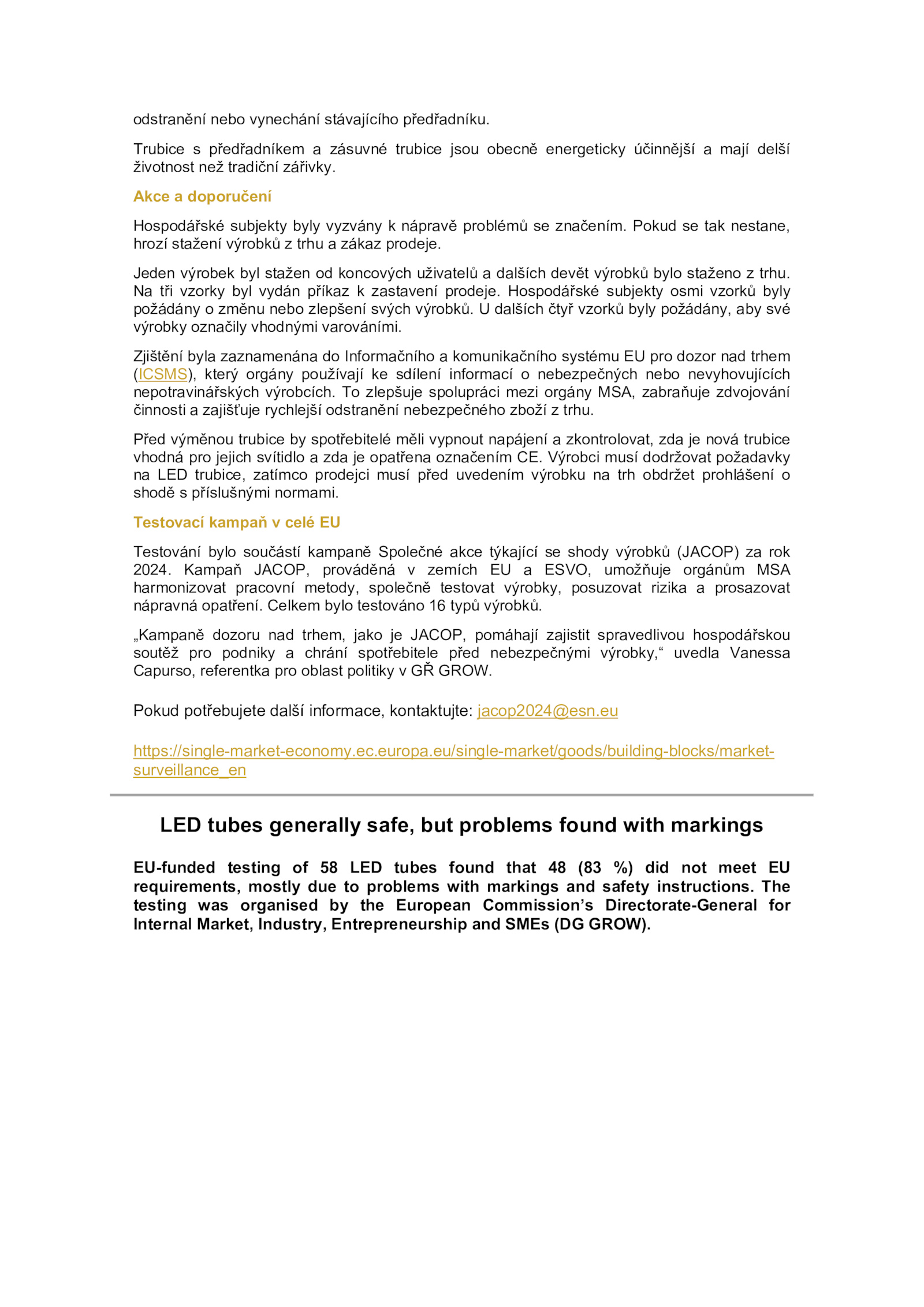 životnost než tradiční zářivky. Celkem bylo testováno typů výrobků. Kampaň JACOP, prováděná zemích ESVO, umožňuje orgánům MSA