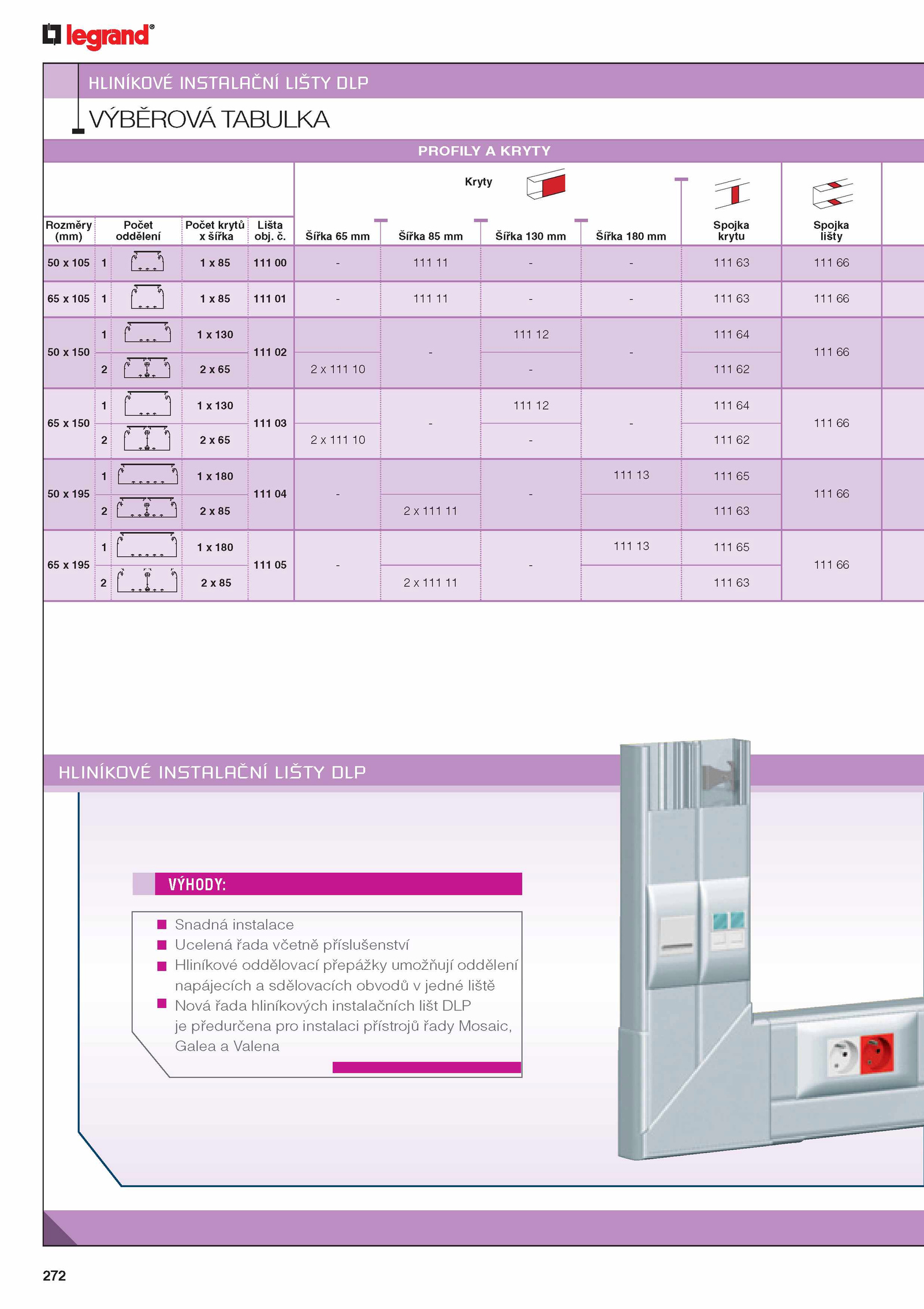 . Sirka Širka Sirka 130 Širka 180 mm 50 105 111 111 111 111 66 65 105 1 a 111 111 111 111 66 50 150 1 r.. 180 111 - 111 111 65 111 66v v/ 2 111 111 63 65 195 1 f 180 111 - 111 111 65 111 66OO 1Ji; 2 Í 111 111 63 272 . 130 111 - 111 111 64 111 66 2 111 111 62 1 v v 1 130 111 - 111 12 - 111 64 111 66 2 M 111 111 62 50 195 1 r...LIlegrand0 HLINÍKOVÉ INSTRLRČNÍ LIŠTY DLP VÝBĚROVÁ TABULKA PROFILY KRYTY K ryty 1 uj Spojka liš ty R ozm ěry (m ) Pocet oddělení Pocet krytů x širka Lišta obj