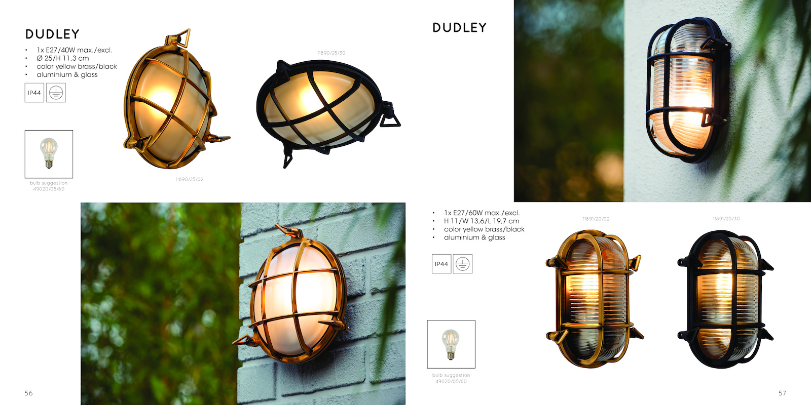 /excl. • 11/W 13,6/L 19,7 cm • color yellow brass/black • aluminium glass bulb suggestion 49020/05/60 11891/20/02 11891/20/30 IP 44 IP 44 .57 56 • E27/40W max./excl. • 25/H 11,3 cm • color yellow brass/black • aluminium glass DUDLEY DUDLEY bulb suggestion 49020/05/60 11890/25/02 11890/25/30 • E27/60W max