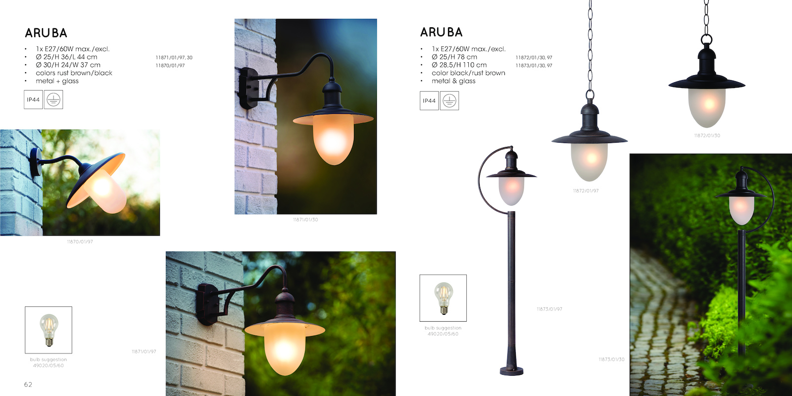 /excl./excl.63 62 • E27/60W max. • 25/H 36/L 11871/01/97, 30 • 30/H 24/W 11870/01/97 • colors rust brown/black • metal glass 11871/01/30 ARUBA IP 44 11871/01/97 11870/01/97 bulb suggestion 49020/05/60 bulb suggestion 49020/05/60 • E27/60W max. • 25/H cm 11872/01/30, 97 • 28,5/H 110 cm 11873/01/30, 97 • color black/rust brown • metal glass ARUBA IP 44 11873/01/97 11873/01/30 11872/01/97 11872/01/30