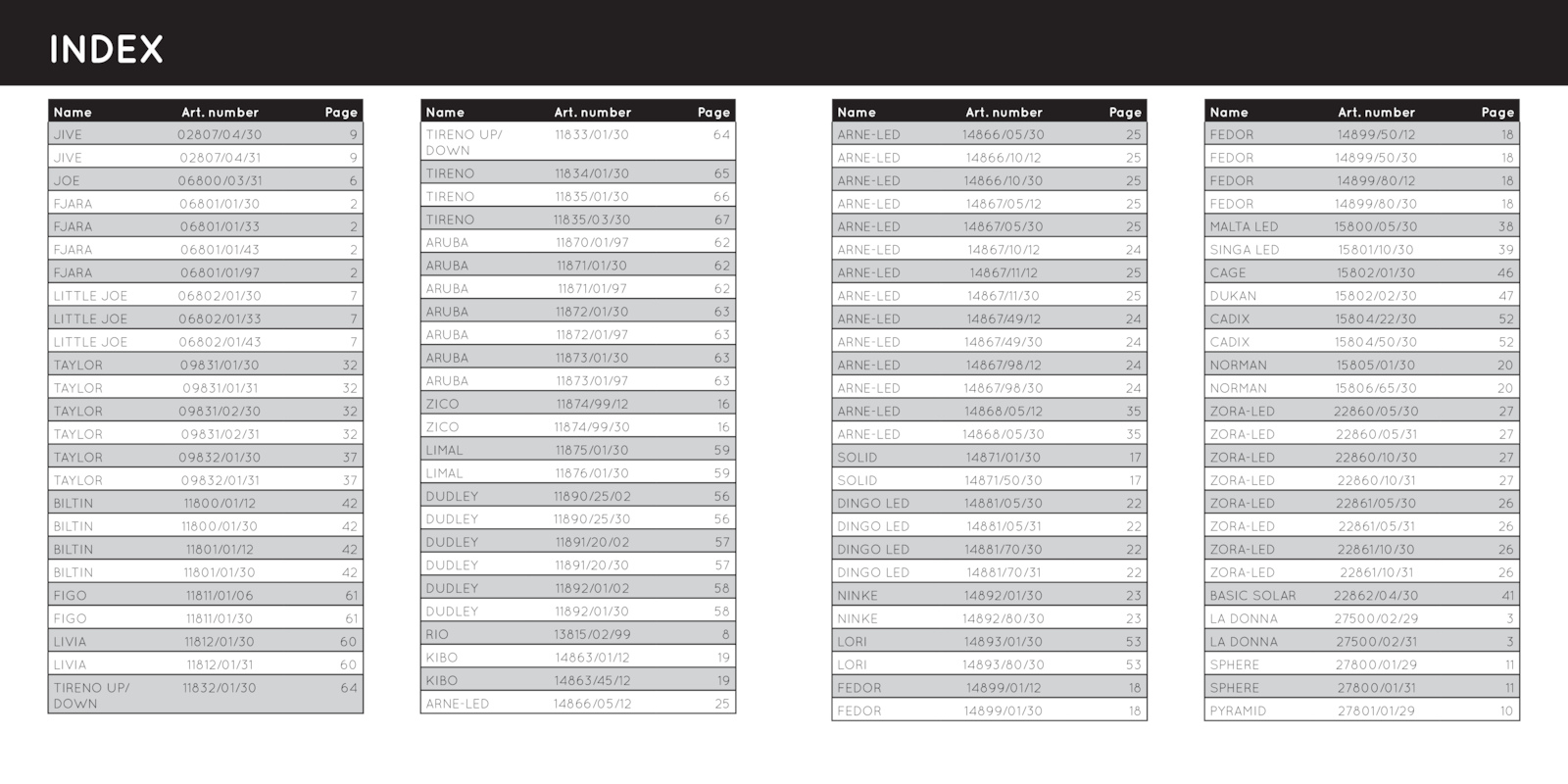 INDEX Name Art. number Page FEDOR 14899/50/12 18 FEDOR 14899/50/30 18 FEDOR 14899/80/12 18 FEDOR 14899/80/30 18 MALTA LED 15800/05/30 38 SINGA LED 15801/10/30 39 CAGE 15802/01/30 46 DUKAN 15802/02/30 47 CADIX 15804/22/30 52 CADIX 15804/50/30 52 NORMAN 15805/01/30 20 NORMAN 15806/65/30 20 ZORA-LED 22860/05/30 27 ZORA-LED 22860/05/31 27 ZORA-LED 22860/10/30 27 ZORA-LED 22860/10/31 27 ZORA-LED 22861/05/30 26 ZORA-LED 22861/05/31 26 ZORA-LED 22861/10/30 26 ZORA-LED 22861/10/31 26 BASIC SOLAR 22862/04/30 41 LA DONNA 27500/02/29 3 LA DONNA 27500/02/31 3 SPHERE 27800/01/29 11 SPHERE 27800/01/31 11 PYRAMID 27801/01/29 10 . number Page TIRENO UP/ DOWN 11833/01/30 64 TIRENO 11834/01/30 65 TIRENO 11835/01/30 66 TIRENO 11835/03/30 67 ARUBA 11870/01/97 62 ARUBA 11871/01/30 62 ARUBA 11871/01/97 62 ARUBA 11872/01/30 63 ARUBA 11872/01/97 63 ARUBA 11873/01/30 63 ARUBA 11873/01/97 63 ZICO 11874/99/12 16 ZICO 11874/99/30 16 LIMAL 11875/01/30 59 LIMAL 11876/01/30 59 DUDLEY 11890/25/02 56 DUDLEY 11890/25/30 56 DUDLEY 11891/20/02 57 DUDLEY 11891/20/30 57 DUDLEY 11892/01/02 58 DUDLEY 11892/01/30 58 RIO 13815/02/99 8 KIBO 14863/01/12 19 KIBO 14863/45/12 19 ARNE-LED 14866/05/12 25 Name Art. number Page ARNE-LED 14866/05/30 25 ARNE-LED 14866/10/12 25 ARNE-LED 14866/10/30 25 ARNE-LED 14867/05/12 25 ARNE-LED 14867/05/30 25 ARNE-LED 14867/10/12 24 ARNE-LED 14867/11/12 25 ARNE-LED 14867/11/30 25 ARNE-LED 14867/49/12 24 ARNE-LED 14867/49/30 24 ARNE-LED 14867/98/12 24 ARNE-LED 14867/98/30 24 ARNE-LED 14868/05/12 35 ARNE-LED 14868/05/30 35 SOLID 14871/01/30 17 SOLID 14871/50/30 17 DINGO LED 14881/05/30 22 DINGO LED 14881/05/31 22 DINGO LED 14881/70/30 22 DINGO LED 14881/70/31 22 NINKE 14892/01/30 23 NINKE 14892/80/30 23 LORI 14893/01/30 53 LORI 14893/80/30 53 FEDOR 14899/01/12 18 FEDOR 14899/01/30 18 Name Art. number Page JIVE 02807/04/30 9 JIVE 02807/04/31 9 JOE 06800/03/31 6 FJARA 06801/01/30 2 FJARA 06801/01/33 2 FJARA 06801/01/43 2 FJARA 06801/01/97 2 LITTLE JOE 06802/01/30 7 LITTLE JOE 06802/01/33 7 LITTLE JOE 06802/01/43 7 TAYLOR 09831/01/30 32 TAYLOR 09831/01/31 32 TAYLOR 09831/02/30 32 TAYLOR 09831/02/31 32 TAYLOR 09832/01/30 37 TAYLOR 09832/01/31 37 BILTIN 11800/01/12 42 BILTIN 11800/01/30 42 BILTIN 11801/01/12 42 BILTIN 11801/01/30 42 FIGO 11811/01/06 61 FIGO 11811/01/30 61 LIVIA 11812/01/30 60 LIVIA 11812/01/31 60 TIRENO UP/ DOWN 11832/01/30 64 Name Art