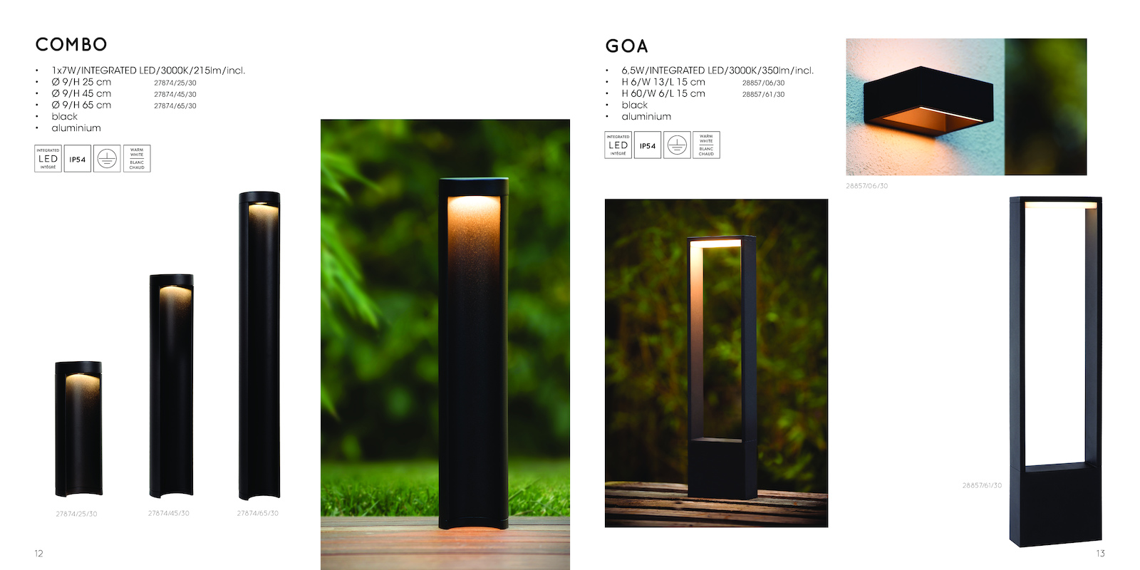• 6/W 13/L cm 28857/06/30 • 60/W 6/L cm 28857/61/30 • black • aluminium IP 44 WARM WHITE BLANC CHAUD IP54 28857/61/30 28857/06/30 . • 9/H 27874/25/30 • 9/H 27874/45/30 • 9/H 27874/65/30 • black • aluminium COMBO IP 44 WARM WHITE BLANC CHAUD IP54 27874/25/30 27874/45/30 27874/65/30 GOA • 6,5W/INTEGRATED LED/3000K/350lm/incl.13 12 • 1x7W/INTEGRATED LED/3000K/215lm/incl