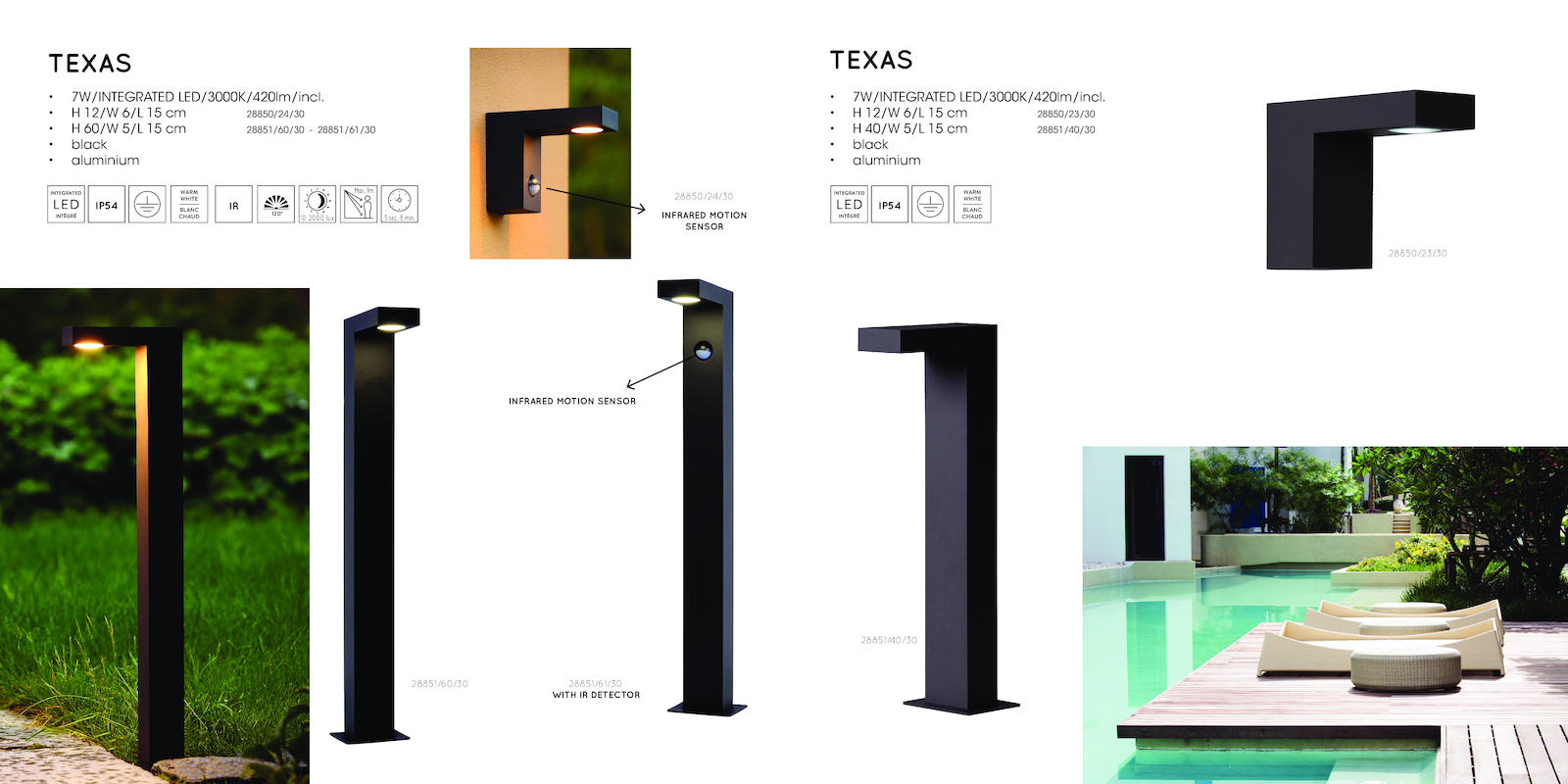-8 min. 9m 10-2000 lux sec.15 14 • 7W/INTEGRATED LED/3000K/420lm/incl. • 12/W 6/L 28850/23/30 • 40/W 5/L 28851/40/30 • black • aluminium IP 44 WARM WHITE BLANC CHAUD IP54 28850/23/30 28851/40/30 INFRARED MOTION SENSOR INFRARED MOTION SENSOR . IR TEXAS • 7W/INTEGRATED LED/3000K/420lm/incl. • 12/W 6/L 28850/24/30 • 60/W 5/L 28851/60/30 28851/61/30 • black • aluminium 28851/61/30 WITH DETECTOR 28851/60/30 TEXAS 28850/24/30 IP 44 WARM WHITE BLANC CHAUD IP54 120° Max