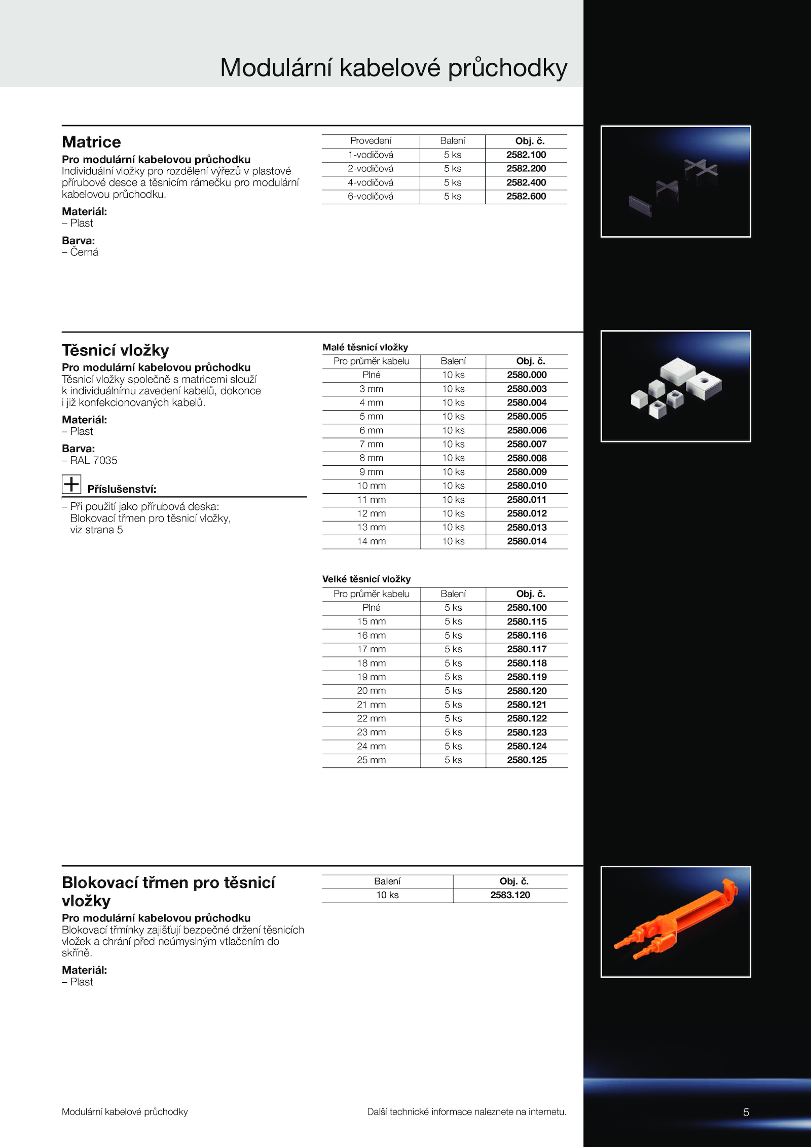 010 11 2580.125 .Další technické informace naleznete internetu.005 6 2580. Materiál: – Plast Barva: – RAL 7035 Příslušenství: – Při použití jako přírubová deska: Blokovací třmen pro těsnicí vložky, viz strana 5 Malé těsnicí vložky Velké těsnicí vložky Provedení Balení Obj. č. Materiál: – Plast Balení Obj.003 4 2580.124 25 2580. č.400 6-vodičová 2582.007 8 2580.115 16 2580.100 2-vodičová 2582.014 Pro průměr kabelu Balení Obj.120 21 2580. 1-vodičová 2582.013 14 2580.118 19 2580. Modulární kabelové průchodky Modulární kabelové průchodky 5 Matrice Pro modulární kabelovou průchodku Individuální vložky pro rozdělení výřezů plastové přírubové desce těsnicím rámečku pro modulární kabelovou průchodku.004 5 2580. 10 2583.006 7 2580.100 15 2580.123 24 2580.600 Blokovací třmen pro těsnicí vložky Pro modulární kabelovou průchodku Blokovací třmínky zajišťují bezpečné držení těsnicích vložek chrání před neúmyslným vtlačením do skříně.116 17 2580.122 23 2580.009 10 2580. Materiál: – Plast Barva: – Černá Těsnicí vložky Pro modulární kabelovou průchodku Těsnicí vložky společně matricemi slouží k individuálnímu zavedení kabelů, dokonce i již konfekcionovaných kabelů. Plné 2580.121 22 2580.120 Pro průměr kabelu Balení Obj.119 20 2580. č.011 12 2580.000 3 2580. č.008 9 2580. Plné 2580.200 4-vodičová 2582.012 13 2580.117 18 2580