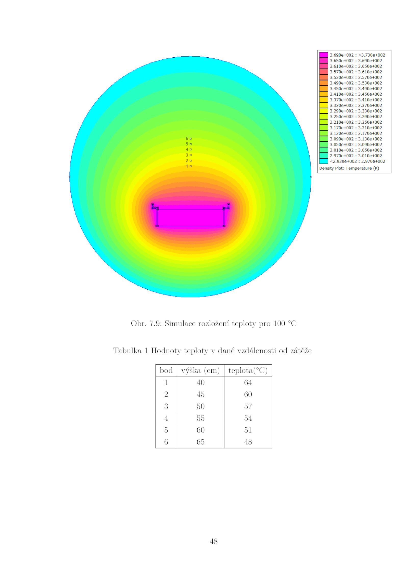 Obr.9: Simulace rozložení teploty pro 100 °C Tabulka Hodnoty teploty dané vzdálenosti zátěže bod výška (cm) teplota(°C) 1 64 2 60 3 57 4 54 5 51 6 48 48 . 7