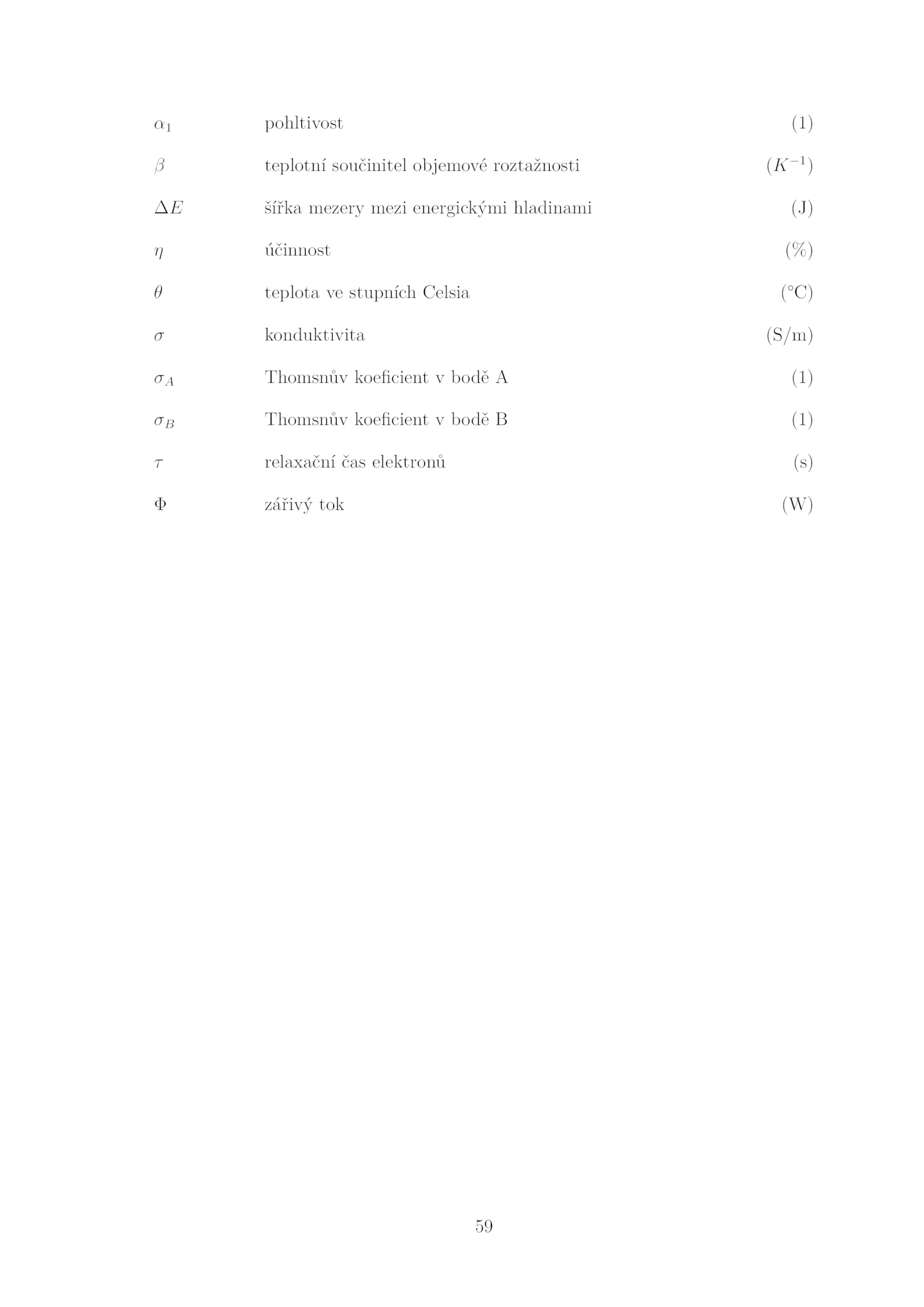 pohltivost (1) 𝛽 teplotní součinitel objemové roztažnosti (𝐾−1 ) Δ𝐸 šířka mezery mezi energickými hladinami (J) 𝜂 účinnost (%) 𝜃 teplota stupních Celsia (°C) 𝜎 konduktivita (S/m) 𝜎𝐴 Thomsnův koeficient bodě (1) 𝜎𝐵 Thomsnův koeficient bodě (1) 𝜏 relaxační čas elektronů (s) Φ zářivý tok (W) 59