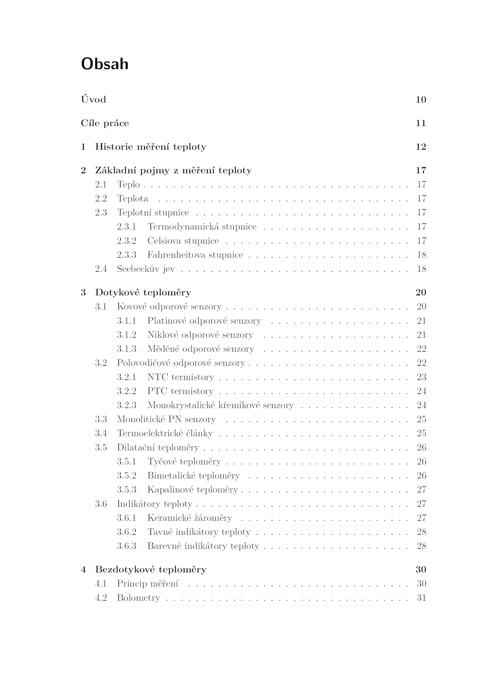 5.1 Termodynamická stupnice 17 2.2 Bimetalické teploměry 26 3.5.3 Měděné odporové senzory 22 3.1 Tyčové teploměry 26 3.1 Teplo 17 2.5 Dilatační teploměry 26 3.3.2 PTC termistory 24 3.2 Teplota 17 2.2 Tavné indikátory teploty 28 3.6.1.3 Monokrystalické křemíkové senzory 24 3.1 Kovové odporové senzory 20 3.2.3 Fahrenheitova stupnice 18 2.3 Barevné indikátory teploty 28 4 Bezdotykové teploměry 30 4.3.3 Kapalinové teploměry 27 3.1 Keramické žároměry 27 3.2 Celsiova stupnice 17 2.1.6.3 Teplotní stupnice 17 2.6.1 NTC termistory 23 3.6 Indikátory teploty 27 3.2 Polovodičové odporové senzory 22 3.1 Platinové odporové senzory 21 3.4 Seebeckův jev 18 3 Dotykové teploměry 20 3.5.2.3 Monolitické senzory 25 3.2 Bolometry 31 .4 Termoelektrické články 25 3.2.1 Princip měření 30 4.2 Niklové odporové senzory 21 3.1.Obsah Úvod 10 Cíle práce 11 1 Historie měření teploty 12 2 Základní pojmy měření teploty 17 2.3