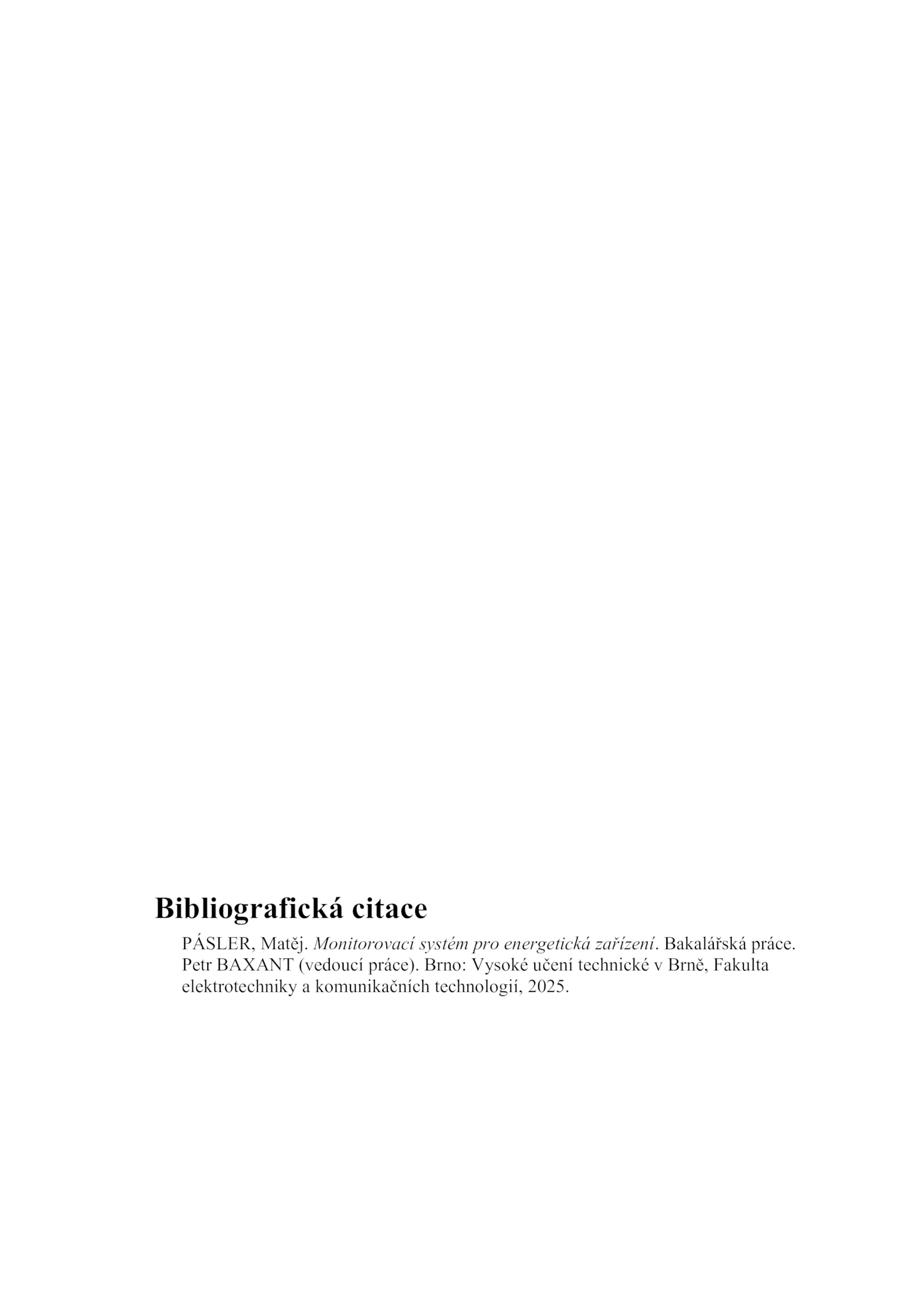 Petr BAXANT (vedoucí práce).Bibliografická citace PÁSLER, Matěj. Bakalářská práce. Monitorovací systém pro energetická zařízení. . Brno: Vysoké učení technické Brně, Fakulta elektrotechniky komunikačních technologií, 2025