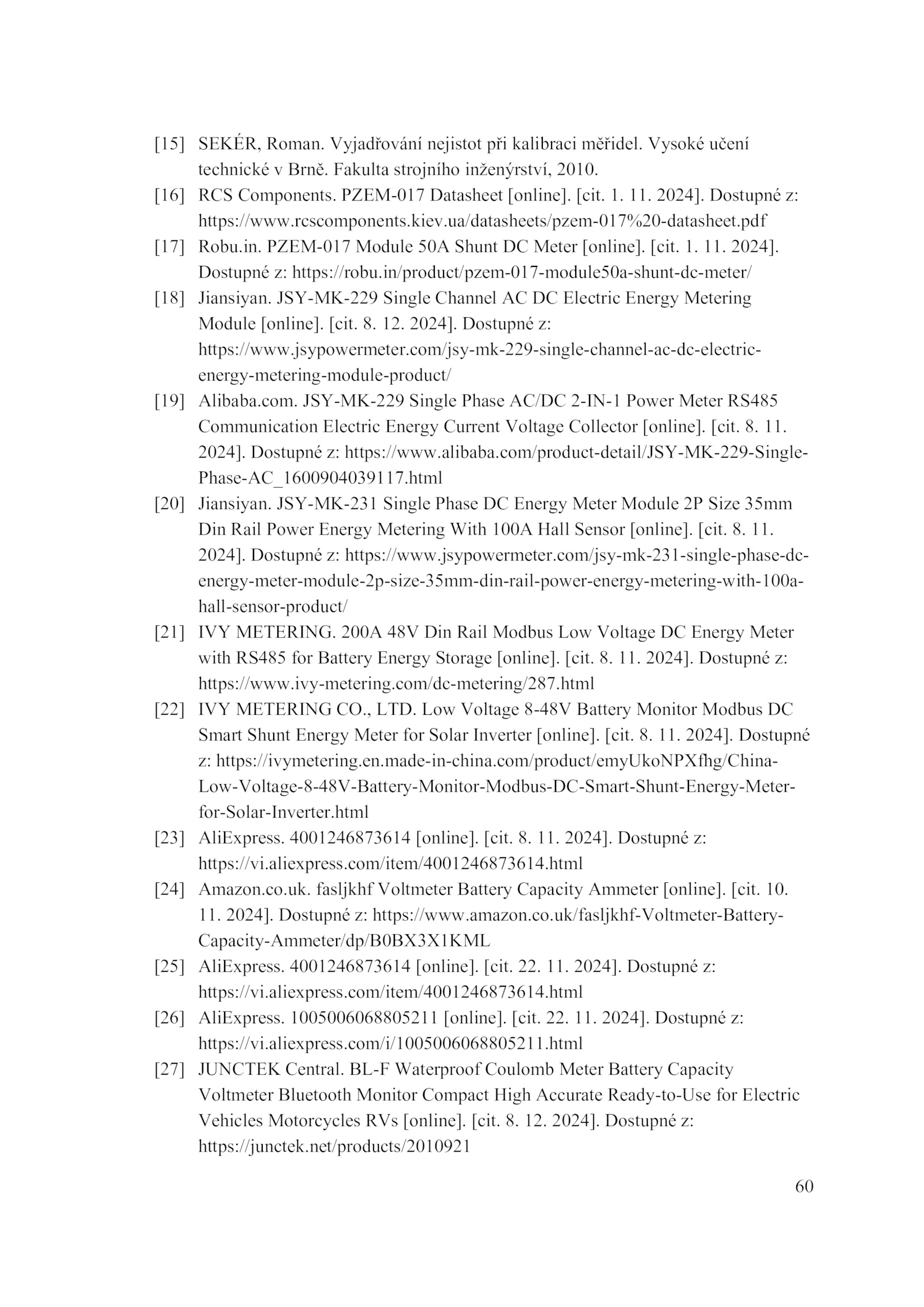 [cit. 12.com/item/4001246873614. Dostupné https://www. Dostupné z: https://www.html [22] IVY METERING CO. 11. Vysoké učení technické Brně.com/product/emyUkoNPXfhg/China- Low-Voltage-8-48V-Battery-Monitor-Modbus-DC-Smart-Shunt-Energy-Meter- for-Solar-Inverter. 2024].aliexpress. Dostupné https://robu. 2024]. Dostupné z: https://vi. [cit. 12. 2024]. 2024]., LTD.com/item/4001246873614.co. 2024]. 2024]. Fakulta strojního inženýrství, 2010.kiev. 11. [cit. Vyjadřování nejistot při kalibraci měřidel. 11. [cit. [cit. JSY-MK-229 Single Channel Electric Energy Metering Module [online].pdf [17] Robu. [cit. [cit. 2024]. 2024]. Dostupné z: https://ivymetering. [cit. 11.ua/datasheets/pzem-017%20-datasheet. 11. BL-F Waterproof Coulomb Meter Battery Capacity Voltmeter Bluetooth Monitor Compact High Accurate Ready-to-Use for Electric Vehicles Motorcycles RVs [online]. 2024]. fasljkhf Voltmeter Battery Capacity Ammeter [online]. 11.com/jsy-mk-229-single-channel-ac-dc-electric- energy-metering-module-product/ [19] Alibaba.html [27] JUNCTEK Central. Dostupné z: https://vi.jsypowermeter. [16] RCS Components. 4001246873614 [online]. Dostupné z: https://www. Dostupné z: https://www.com/product-detail/JSY-MK-229-Single- Phase-AC_1600904039117.60 [15] SEKÉR, Roman.made-in-china. Dostupné z: https://vi. [cit.ivy-metering. 200A 48V Din Rail Modbus Low Voltage Energy Meter with RS485 for Battery Energy Storage [online].jsypowermeter.html [26] AliExpress. 11.co.alibaba.com/dc-metering/287.in.uk/fasljkhf-Voltmeter-Battery- Capacity-Ammeter/dp/B0BX3X1KML [25] AliExpress. Dostupné https://www.com/jsy-mk-231-single-phase-dc- energy-meter-module-2p-size-35mm-din-rail-power-energy-metering-with-100a- hall-sensor-product/ [21] IVY METERING. 10. JSY-MK-229 Single Phase AC/DC 2-IN-1 Power Meter RS485 Communication Electric Energy Current Voltage Collector [online]. PZEM-017 Module 50A Shunt Meter [online]. 2024].uk.aliexpress. 2024]. 1005006068805211 [online].rcscomponents.en. 11. [cit. JSY-MK-231 Single Phase Energy Meter Module Size 35mm Din Rail Power Energy Metering With 100A Hall Sensor [online]. [cit.html [20] Jiansiyan. 4001246873614 [online].html [23] AliExpress. [cit. 11. Low Voltage 8-48V Battery Monitor Modbus DC Smart Shunt Energy Meter for Solar Inverter [online].amazon. 22. 11. 22. Dostupné https://www. Dostupné z: https://junctek.com. PZEM-017 Datasheet [online].com/i/1005006068805211.aliexpress.net/products/2010921 .html [24] Amazon. 2024].in/product/pzem-017-module50a-shunt-dc-meter/ [18] Jiansiyan