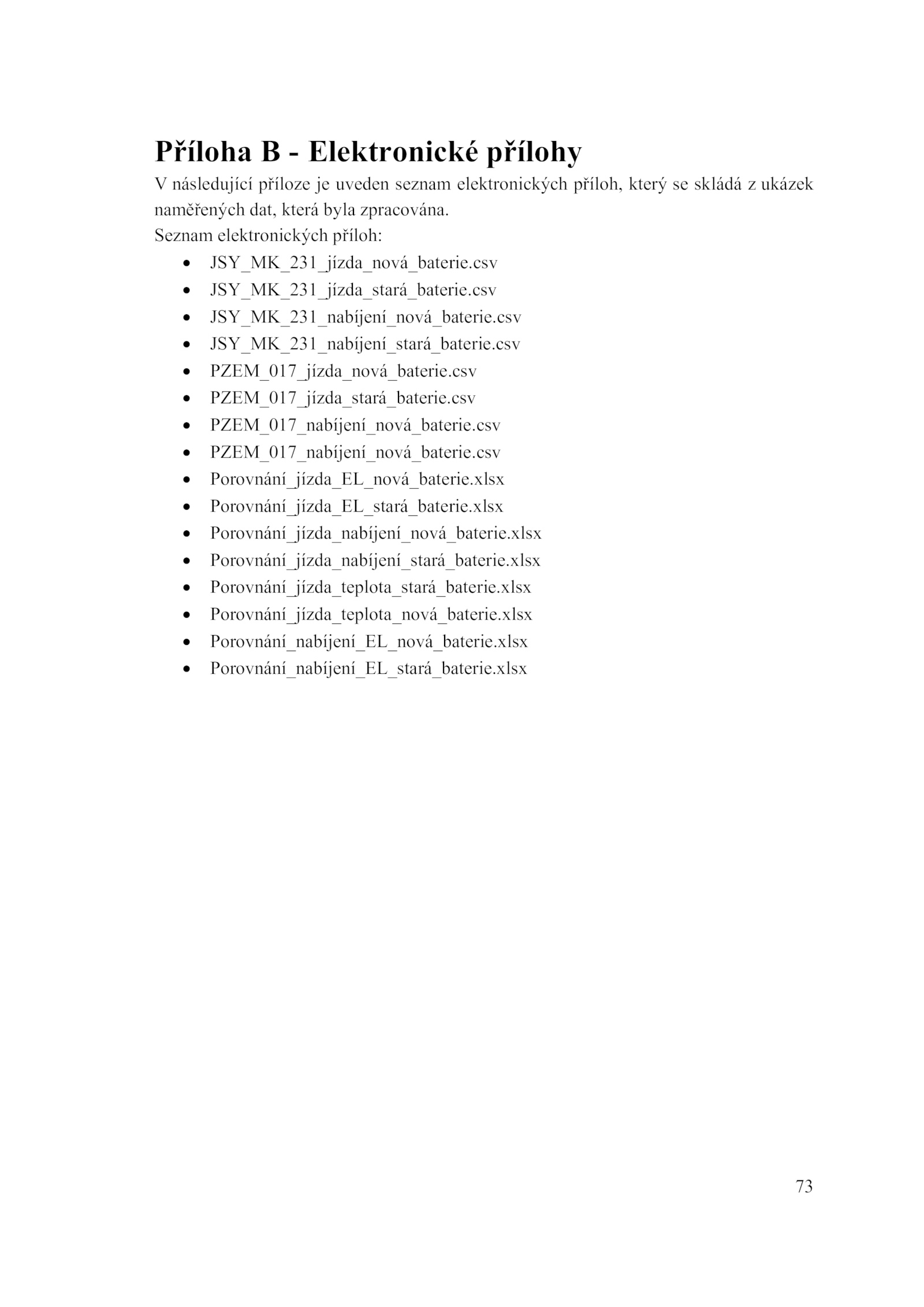 xlsx .xlsx • Porovnání_nabíjení_EL_stará_baterie.csv • JSY_MK_231_nabíjení_stará_baterie.csv • JSY_MK_231_nabíjení_nová_baterie.xlsx • Porovnání_jízda_teplota_stará_baterie.csv • PZEM_017_jízda_stará_baterie.xlsx • Porovnání_nabíjení_EL_nová_baterie.xlsx • Porovnání_jízda_teplota_nová_baterie.73 Příloha Elektronické přílohy V následující příloze uveden seznam elektronických příloh, který skládá ukázek naměřených dat, která byla zpracována. Seznam elektronických příloh: • JSY_MK_231_jízda_nová_baterie.csv • PZEM_017_nabíjení_nová_baterie.xlsx • Porovnání_jízda_EL_stará_baterie.xlsx • Porovnání_jízda_nabíjení_stará_baterie.csv • PZEM_017_jízda_nová_baterie.csv • JSY_MK_231_jízda_stará_baterie.csv • Porovnání_jízda_EL_nová_baterie.xlsx • Porovnání_jízda_nabíjení_nová_baterie.csv • PZEM_017_nabíjení_nová_baterie