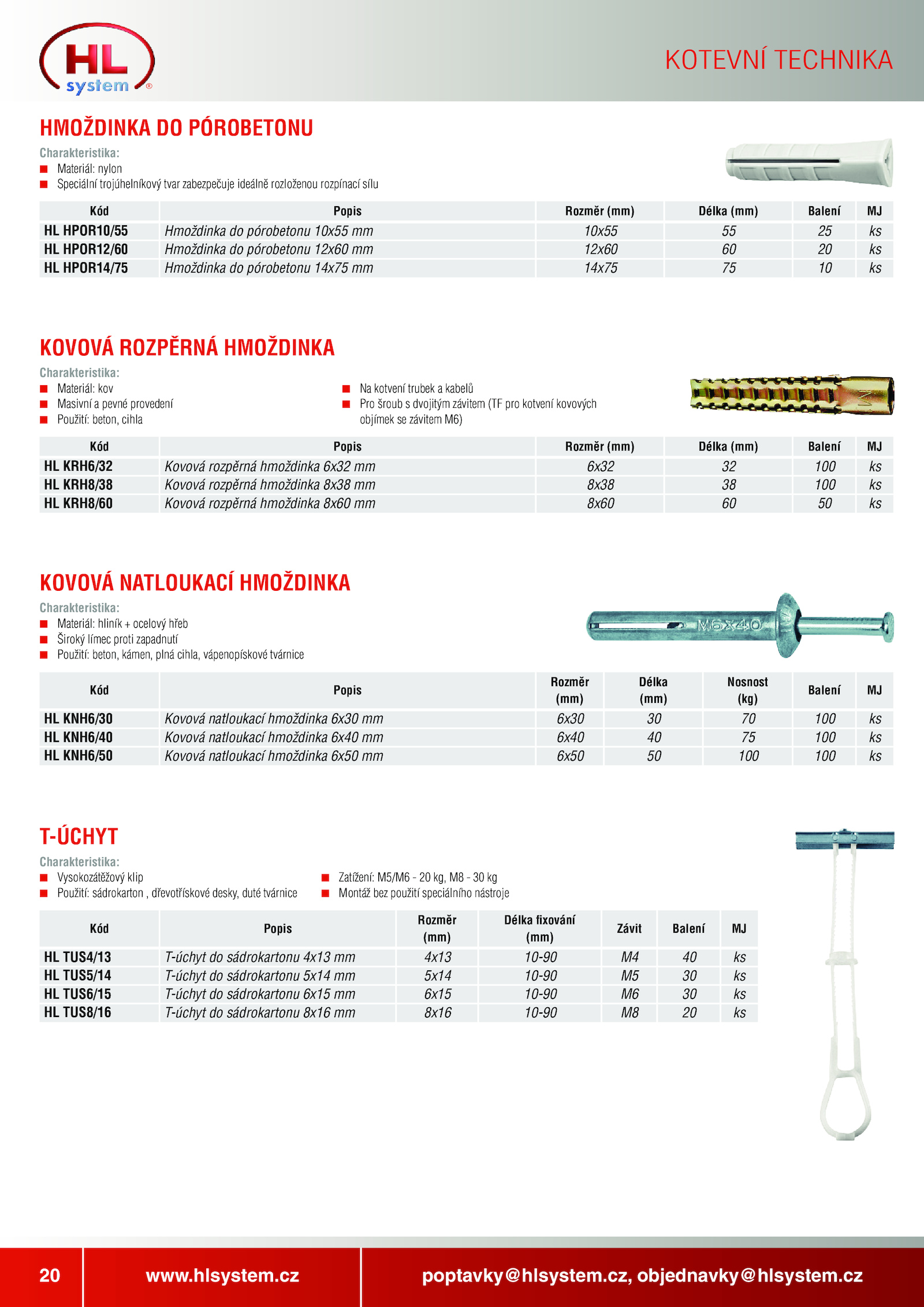 cz .hlsystem.cz, objednavky@hlsystem.Kód Popis Rozměr (mm) Délka fixování (mm) Závit Balení MJ HL TUS4/13 T-úchyt sádrokartonu 4x13 4x13 10-90 ks HL TUS5/14 T-úchyt sádrokartonu 5x14 5x14 10-90 ks HL TUS6/15 T-úchyt sádrokartonu 6x15 6x15 10-90 ks HL TUS8/16 T-úchyt sádrokartonu 8x16 8x16 10-90 ks T-ÚCHYT Charakteristika: ■ Vysokozátěžový klip ■ Použití: sádrokarton dřevotřískové desky, duté tvárnice ■ Zatížení: M5/M6 kg, kg ■ Montáž bez použití speciálního nástroje Kód Popis Rozměr (mm) Délka (mm) Balení MJ HL KRH6/32 Kovová rozpěrná hmoždinka 6x32 6x32 100 ks HL KRH8/38 Kovová rozpěrná hmoždinka 8x38 8x38 100 ks HL KRH8/60 Kovová rozpěrná hmoždinka 8x60 8x60 ks KOVOVÁ ROZPĚRNÁ HMOŽDINKA Charakteristika: ■ Materiál: kov ■ Masivní pevné provedení ■ Použití: beton, cihla ■ kotvení trubek kabelů ■ Pro šroub dvojitým závitem (TF pro kotvení kovových objímek závitem M6) Kód Popis Rozměr (mm) Délka (mm) Nosnost (kg) Balení MJ HL KNH6/30 Kovová natloukací hmoždinka 6x30 6x30 100 ks HL KNH6/40 Kovová natloukací hmoždinka 6x40 6x40 100 ks HL KNH6/50 Kovová natloukací hmoždinka 6x50 6x50 100 100 ks KOVOVÁ NATLOUKACÍ HMOŽDINKA Charakteristika: ■ Materiál: hliník ocelový hřeb ■ Široký límec proti zapadnutí ■ Použití: beton, kámen, plná cihla, vápenopískové tvárnice Kód Popis Rozměr (mm) Délka (mm) Balení MJ HL HPOR10/55 Hmoždinka pórobetonu 10x55 10x55 ks HL HPOR12/60 Hmoždinka pórobetonu 12x60 12x60 ks HL HPOR14/75 Hmoždinka pórobetonu 14x75 14x75 ks HMOŽDINKA PÓROBETONU Charakteristika: ■ Materiál: nylon ■ Speciální trojúhelníkový tvar zabezpečuje ideálně rozloženou rozpínací sílu KOTEVNÍ TECHNIKA ® 20 www.cz poptavky@hlsystem