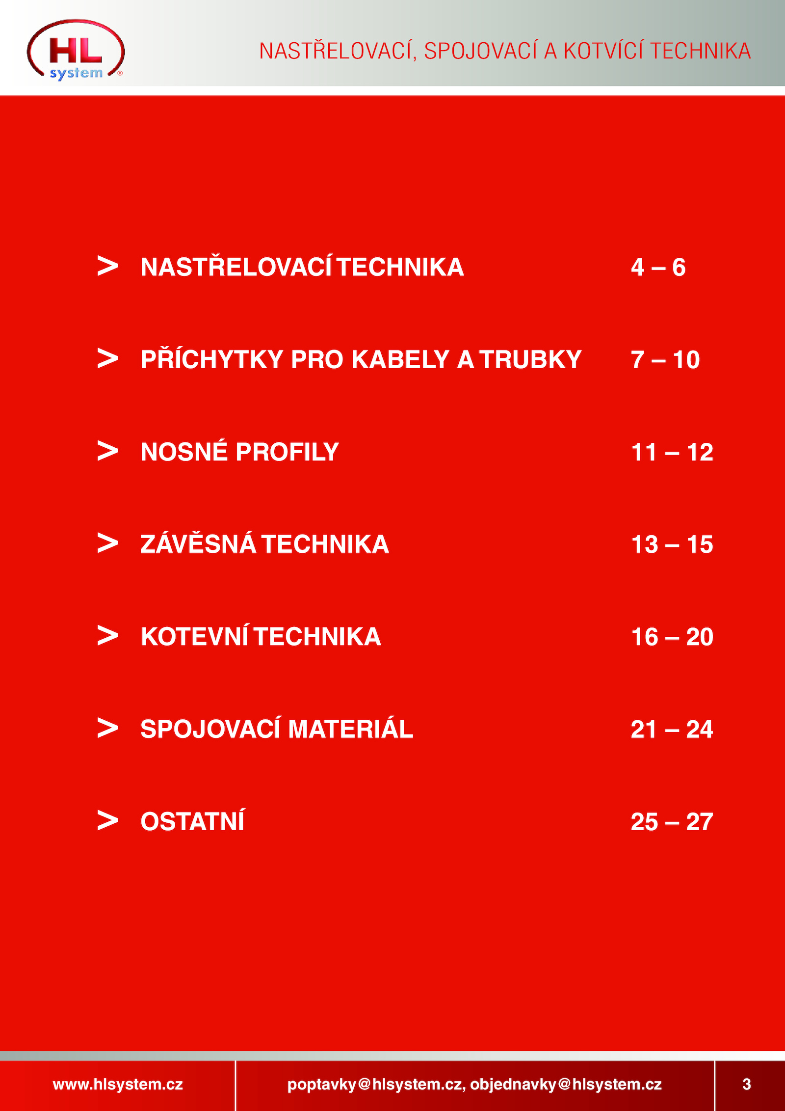 hlsystem.NASTŘELOVACÍ TECHNIKA 6 > PŘÍCHYTKY PRO KABELY TRUBKY 10 > NOSNÉ PROFILY 12 > ZÁVĚSNÁ TECHNIKA 15 > KOTEVNÍ TECHNIKA 20 > SPOJOVACÍ MATERIÁL 24 > OSTATNÍ 27 www.cz poptavky@hlsystem.cz, objednavky@hlsystem.cz 3 NASTŘELOVACÍ, SPOJOVACÍ KOTVÍCÍ TECHNIKA ®