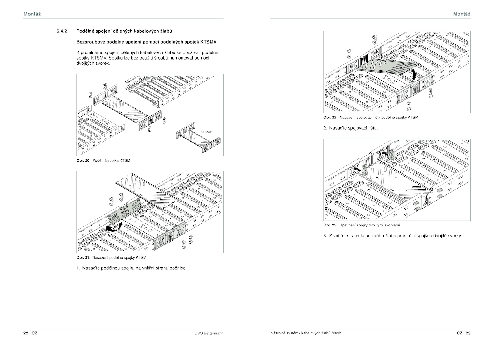 22: Nasazení spojovací lišty podélné spojky KTSM 2. Obr. Obr. 23: Upevnění spojky dvojitými svorkami 3.Montáž 22 OBO Bettermann 6.4. vnitřní strany kabelového žlabu prostrčte spojkou dvojité svorky.2 Podélné spojení dělených kabelových žlabů Bezšroubové podélné spojení pomocí podélných spojek KTSMV K podélnému spojení dělených kabelových žlabů používají podélné spojky KTSMV. Spojku lze bez použití šroubů namontovat pomocí dvojitých svorek. . 21: Nasazení podélné spojky KTSM 1. Nasaďte podélnou spojku vnitřní stranu bočnice. 20: KTSMV Podélná spojka KTSM Obr. Nasaďte spojovací lištu. CZ 23 Násuvné systémy kabelových žlabů Magic Montáž Obr