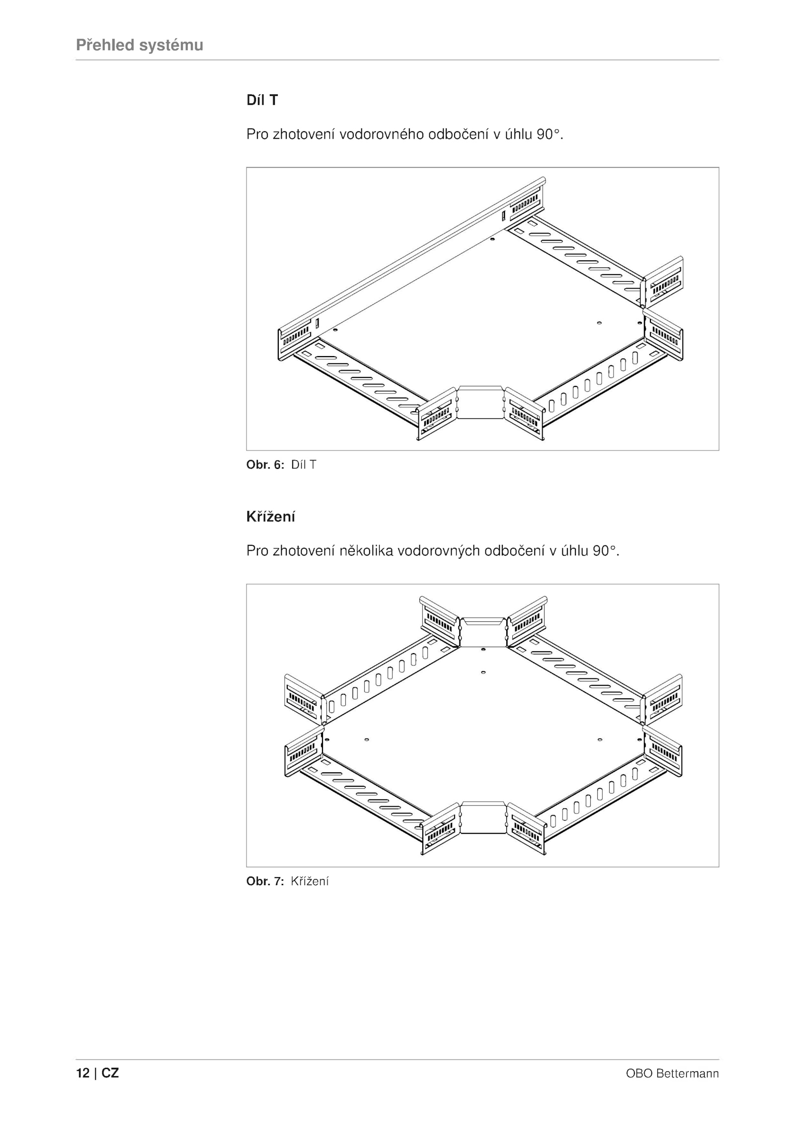 Přehled systému Díl T Pro zhotovení vodorovného odbočení úhlu 90°. Obr. Křížení 12 OBO Bettermann . Obr. Díl T Křížení Pro zhotovení několika vodorovných odbočení úhlu 90°