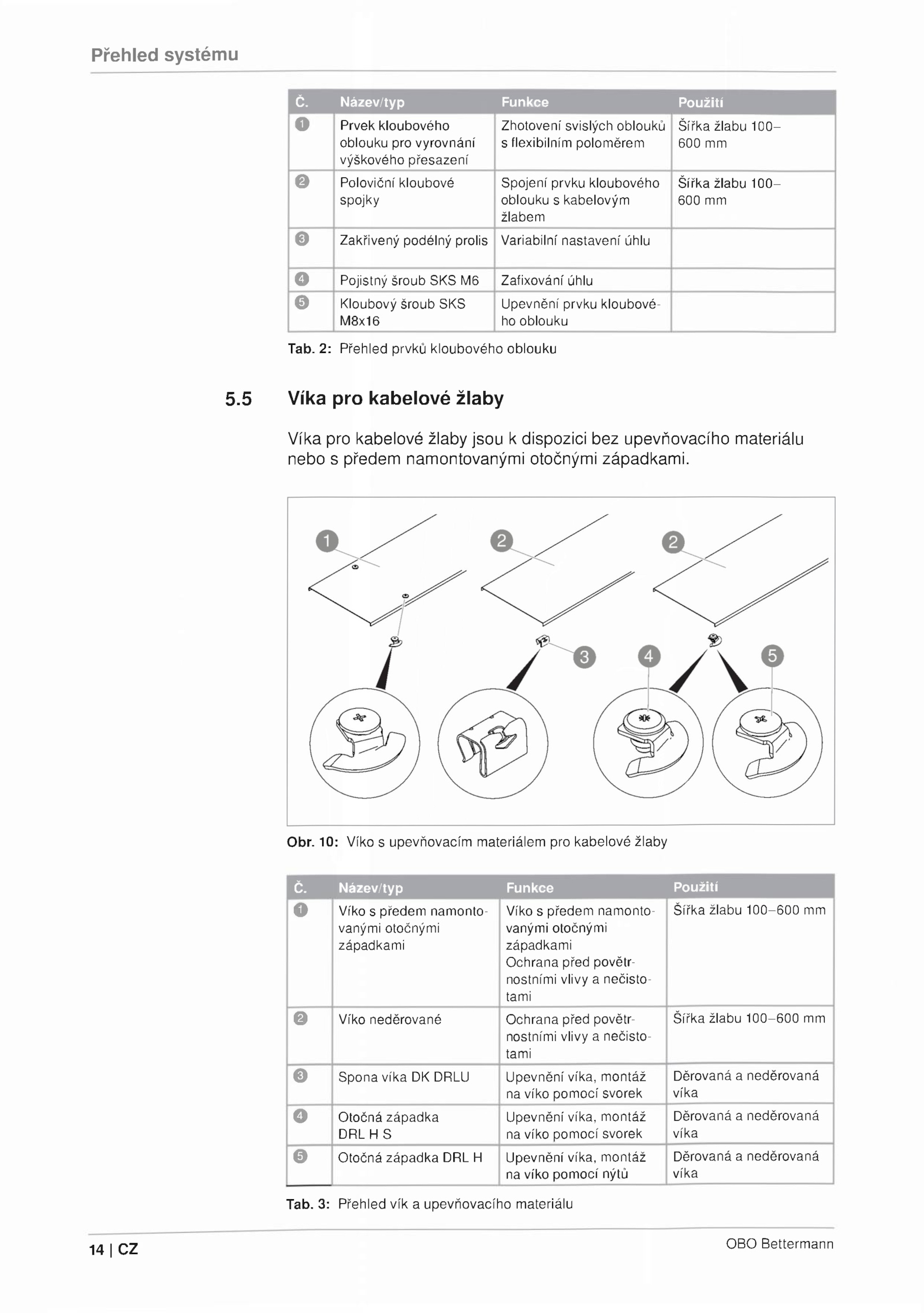 Název/typ Funkce Použití O Víko předem namonto vanými otočnými západkami Víko předem namonto vanými otočnými západkami Ochrana před povětr nostními vlivy nečisto tami Šířka žlabu 100-600 mm 0 Víko neděrované Ochrana před povětr nostními vlivy nečisto tami Šířka žlabu 100-600 mm © Spona víka DRLU Upevnění víka, montáž na víko pomocí svorek Děrovaná neděrovaná víka O Otočná západka DRL S Upevnění víka, montáž na víko pomocí svorek Děrovaná neděrovaná víka © Otočná západka DRL Upevnění víka, montáž na víko pomocí nýtů Děrovaná neděrovaná víka Tab. Přehled prvků kloubového oblouku 5.Přehled systému Č. 10: Víko upevňovacím materiálem pro kabelové žlaby Č. Název/typ Funkce Použití O Prvek kloubového oblouku pro vyrovnání výškového přesazení Zhotovení svislých oblouků s flexibilním poloměrem Šířka žlabu 100— 600 mm © Poloviční kloubové spojky Spojení prvku kloubového oblouku kabelovým žlabem Šířka žlabu 100— 600 mm © Zakřivený podélný prolis Variabilní nastavení úhlu 0 Pojistný šroub SKS Zafixování úhlu © Kloubový šroub SKS M8x16 Upevnění prvku kloubové ho oblouku Tab. Obr.5 Víka pro kabelové žlaby Víka pro kabelové žlaby jsou dispozici bez upevňovacího materiálu nebo předem namontovanými otočnými západkami. Přehled vík upevňovacího materiálu 14 OBO Bettermann
