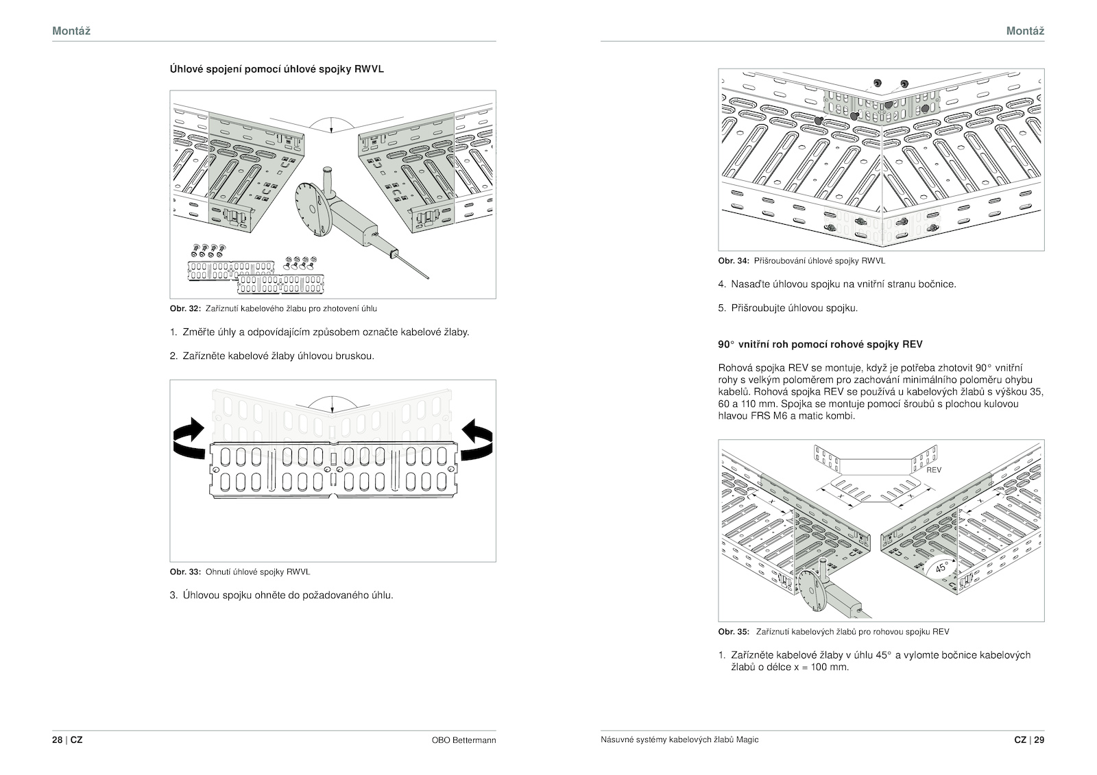 34: Přišroubování úhlové spojky RWVL 4. Úhlovou spojku ohněte požadovaného úhlu. Zařízněte kabelové žlaby úhlu 45° vylomte bočnice kabelových žlabů délce 100 mm. 32: Zaříznutí kabelového žlabu pro zhotovení úhlu 1. Rohová spojka REV používá kabelových žlabů výškou 35, 60 110 mm. . Změřte úhly odpovídajícím způsobem označte kabelové žlaby. 5. Obr. 33: Ohnutí úhlové spojky RWVL 3. 90° vnitřní roh pomocí rohové spojky REV Rohová spojka REV montuje, když potřeba zhotovit 90° vnitřní rohy velkým poloměrem pro zachování minimálního poloměru ohybu kabelů. Nasaďte úhlovou spojku vnitřní stranu bočnice. Obr. CZ 29 Násuvné systémy kabelových žlabů Magic Montáž Obr. 2.Montáž 28 OBO Bettermann Úhlové spojení pomocí úhlové spojky RWVL Obr. Spojka montuje pomocí šroubů plochou kulovou hlavou FRS matic kombi. 35: x x x x REV 45° Zaříznutí kabelových žlabů pro rohovou spojku REV 1. Zařízněte kabelové žlaby úhlovou bruskou. Přišroubujte úhlovou spojku