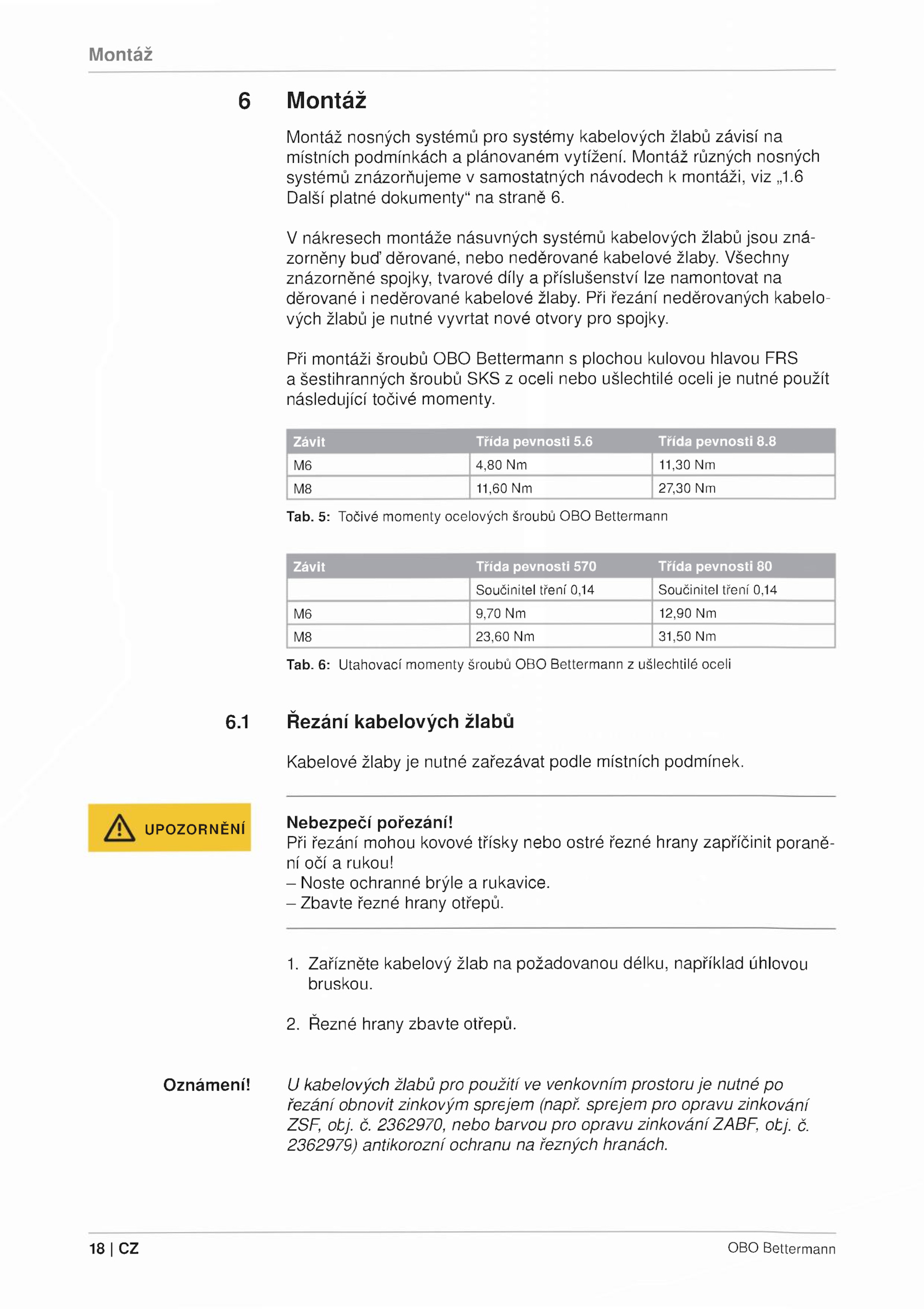 děrované neděrované kabelové žlaby. Utahovací momenty šroubů OBO Bettermann ušlechtilé oceli