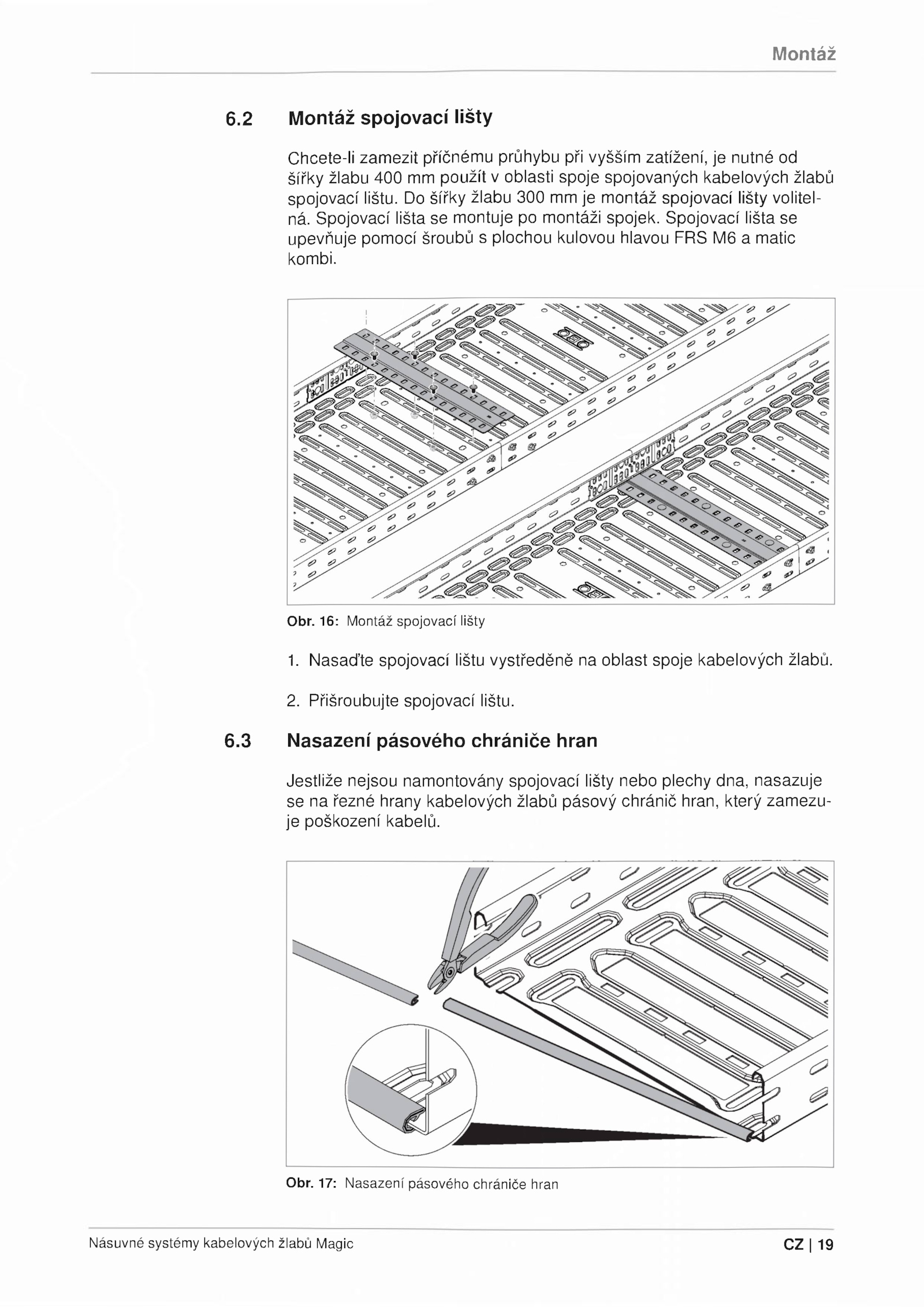 2. Obr.Montáž 6. šířky žlabu 300 montáž spojovací lišty volitel ná. 16: Montáž spojovací lišty 1. 6. Obr. Spojovací lišta se upevňuje pomocí šroubů plochou kulovou hlavou FRS matic kombi. Nasaďte spojovací lištu vystředěně oblast spoje kabelových žlabů.3 Nasazení pásového chrániče hran Jestliže nejsou namontovány spojovací lišty nebo plechy dna, nasazuje se řezné hrany kabelových žlabů pásový chránič hran, který zamezu je poškození kabelů. 17: Nasazení pásového chrániče hran Násuvné systémy kabelových žlabů Magie 19 . Přišroubujte spojovací lištu.2 Montáž spojovací lišty Chcete-li zamezit příčnému průhybu při vyšším zatížení, nutné od šířky žlabu 400 použít oblasti spoje spojovaných kabelových žlabů spojovací lištu. Spojovací lišta montuje montáži spojek