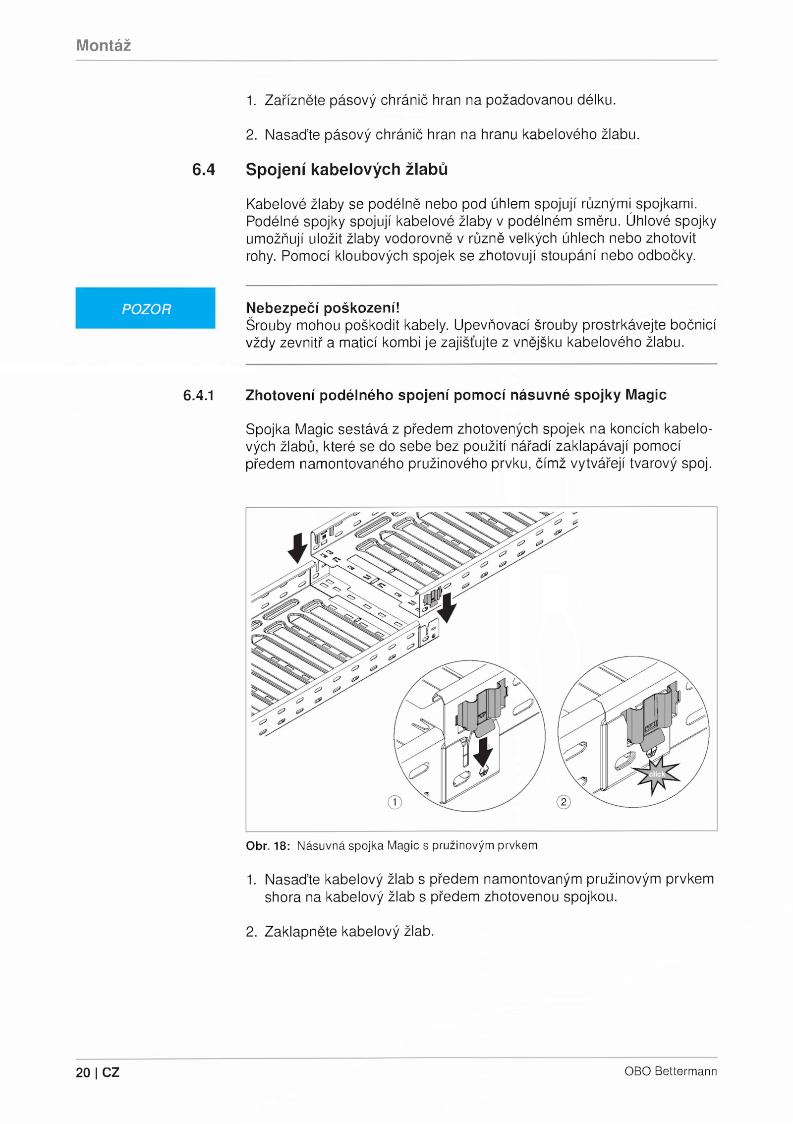 Zaklapněte kabelový žlab. Nasaďte kabelový žlab předem namontovaným pružinovým prvkem shora kabelový žlab předem zhotovenou spojkou. Upevňovací šrouby prostrkávejte bočnici vždy zevnitř maticí kombi zajišťujte vnějšku kabelového žlabu. 18: Násuvná spojka Magie pružinovým prvkem 1.1 Zhotovení podélného spojení pomocí násuvné spojky Magie Spojka Magie sestává předem zhotovených spojek koncích kabelo vých žlabů, které sebe bez použití nářadí zaklapávají pomocí předem namontovaného pružinového prvku, čímž vytvářejí tvarový spoj. Nasaďte pásový chránič hran hranu kabelového žlabu. POZOR Nebezpečí poškození! Šrouby mohou poškodit kabely. Obr. Pomocí kloubových spojek zhotovují stoupání nebo odbočky. 6.4 Spojení kabelových žlabů Kabelové žlaby podélně nebo pod úhlem spojují různými spojkami. Zařízněte pásový chránič hran požadovanou délku. 6. Podélné spojky spojují kabelové žlaby podélném směru. 2. Úhlové spojky umožňují uložit žlaby vodorovně různě velkých úhlech nebo zhotovit rohy. 2.4.Montáž 1. 20 OBO Bettermann