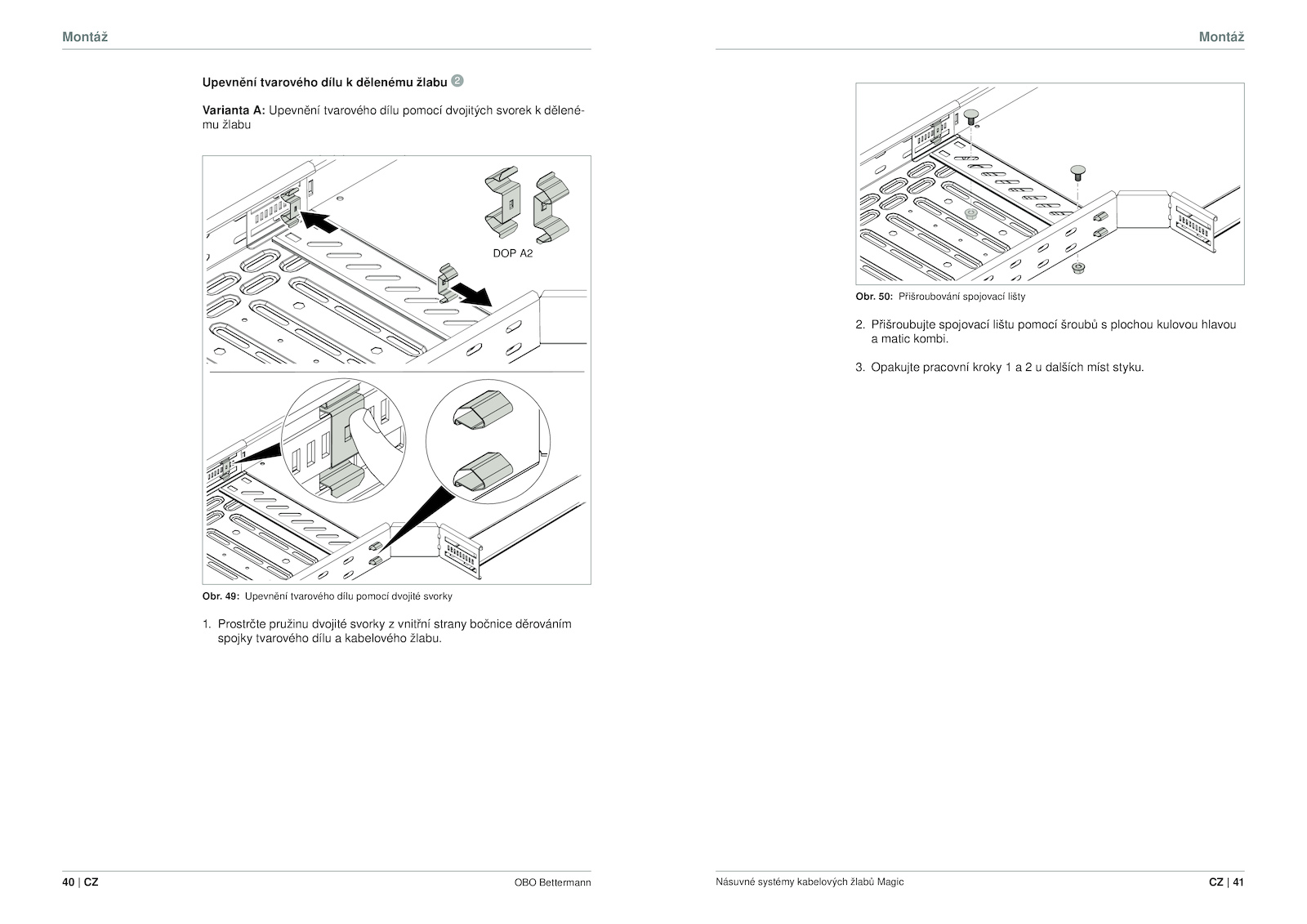 50: Přišroubování spojovací lišty 2. . Prostrčte pružinu dvojité svorky vnitřní strany bočnice děrováním spojky tvarového dílu kabelového žlabu. Přišroubujte spojovací lištu pomocí šroubů plochou kulovou hlavou a matic kombi. 3.Montáž 40 OBO Bettermann Upevnění tvarového dílu dělenému žlabu 2 Varianta Upevnění tvarového dílu pomocí dvojitých svorek dělené- mu žlabu Obr. 49: DOP A2 Upevnění tvarového dílu pomocí dvojité svorky 1. CZ 41 Násuvné systémy kabelových žlabů Magic Montáž Obr. Opakujte pracovní kroky dalších míst styku