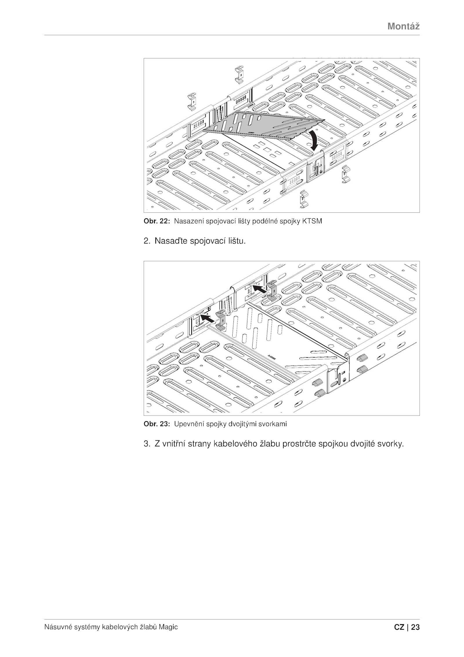 Násuvné systémy kabelových žlabů Magie 23 . Nasaďte spojovací lištu.Montáž Obr. vnitřní strany kabelového žlabu prostrčte spojkou dvojité svorky. 22: Nasazení spojovací lišty podélné spojky KTSM 2. Obr. 23: Upevnění spojky dvojitými svorkami 3