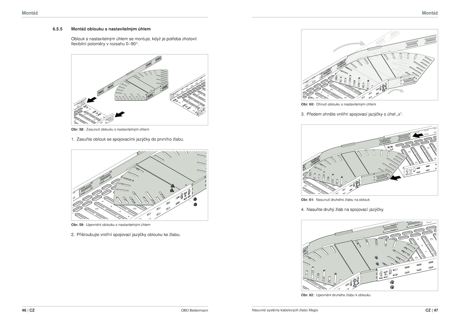 61: Nasunutí druhého žlabu oblouk 4. Přišroubujte vnitřní spojovací jazýčky oblouku žlabu. Zasuňte oblouk spojovacími jazýčky prvního žlabu.5. CZ 47 Násuvné systémy kabelových žlabů Magic Montáž Obr. Obr. Předem ohněte vnitřní spojovací jazýčky úhel „x“. 62: Upevnění druhého žlabu oblouku . 58: Zasunutí oblouku nastavitelným úhlem 1. 59: Upevnění oblouku nastavitelným úhlem 2.Montáž 46 OBO Bettermann 6. Obr. 60: Ohnutí oblouku nastavitelným úhlem 3. Obr. Obr. Nasuňte druhý žlab spojovací jazýčky.5 Montáž oblouku nastavitelným úhlem Oblouk nastavitelným úhlem montuje, když potřeba zhotovit flexibilní poloměry rozsahu 0–90°